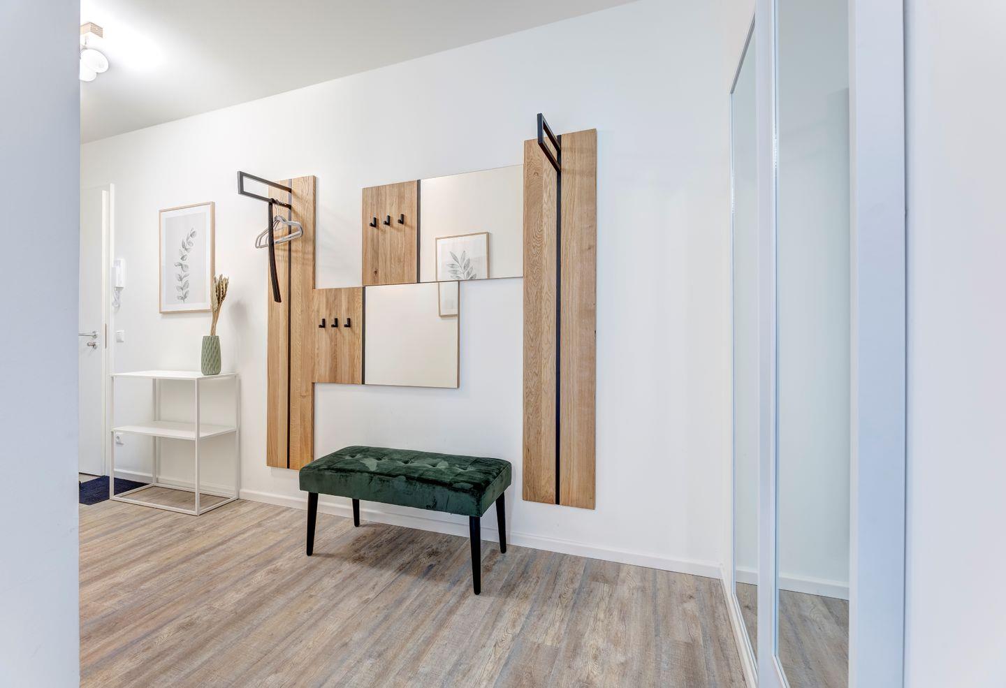 Die Ferienwohnung umfasst großzügige 93 Quadratmeter und bietet Platz für bis zu sechs Gäste. Beim Betreten werden Sie von einer behaglichen Atmosphäre empfangen, die durch natürliche Holzelemente und warme Farbtöne geprägt ist.
