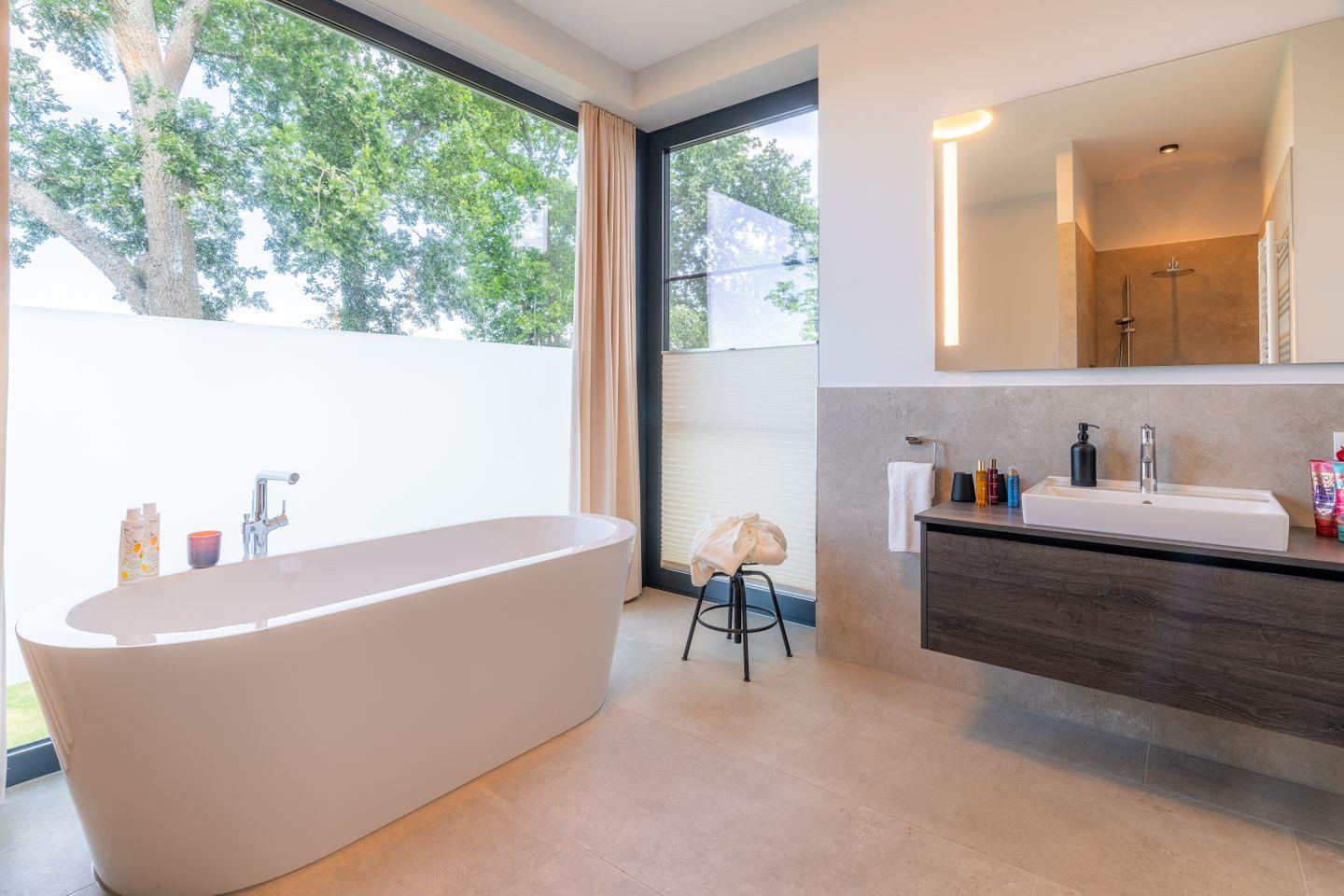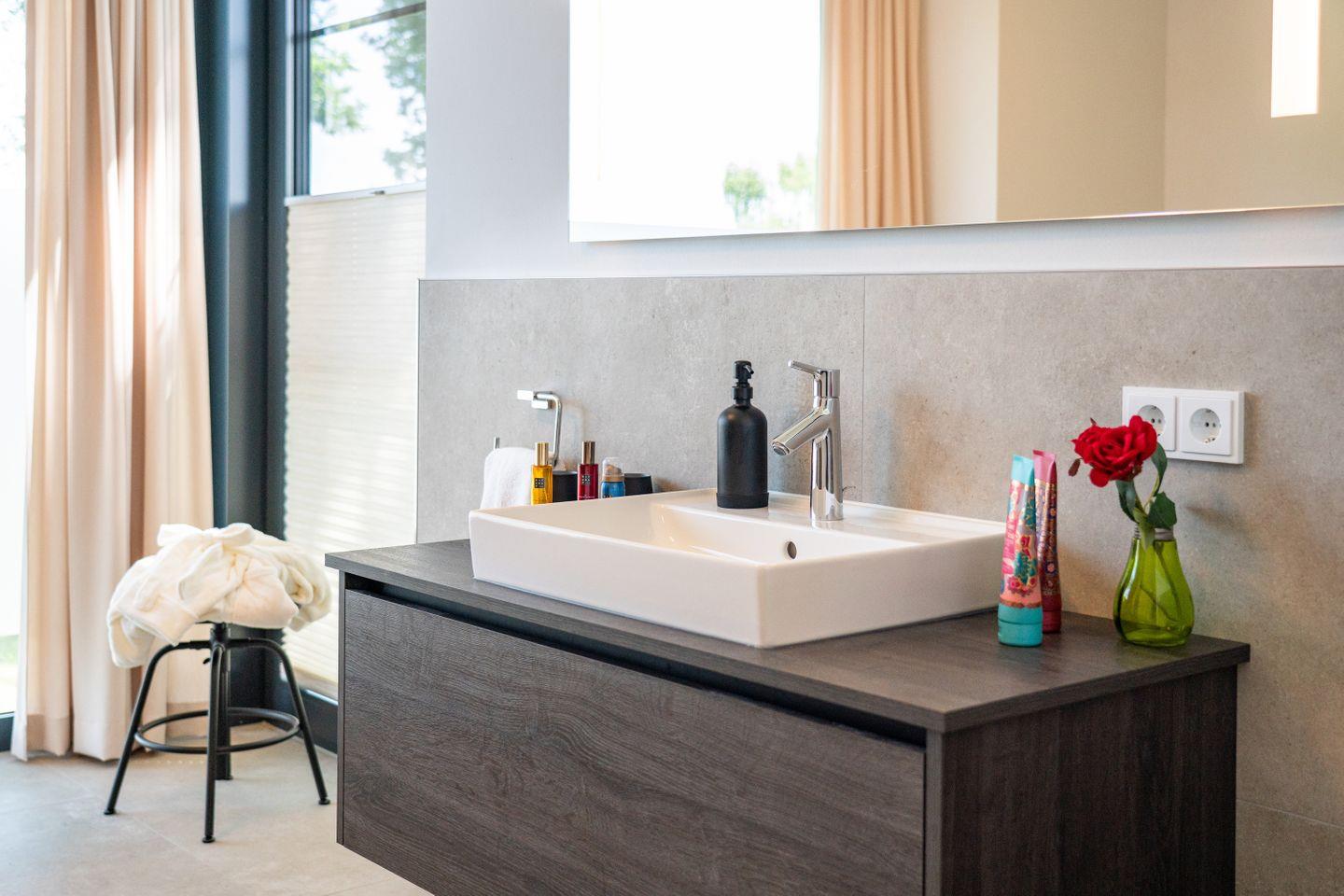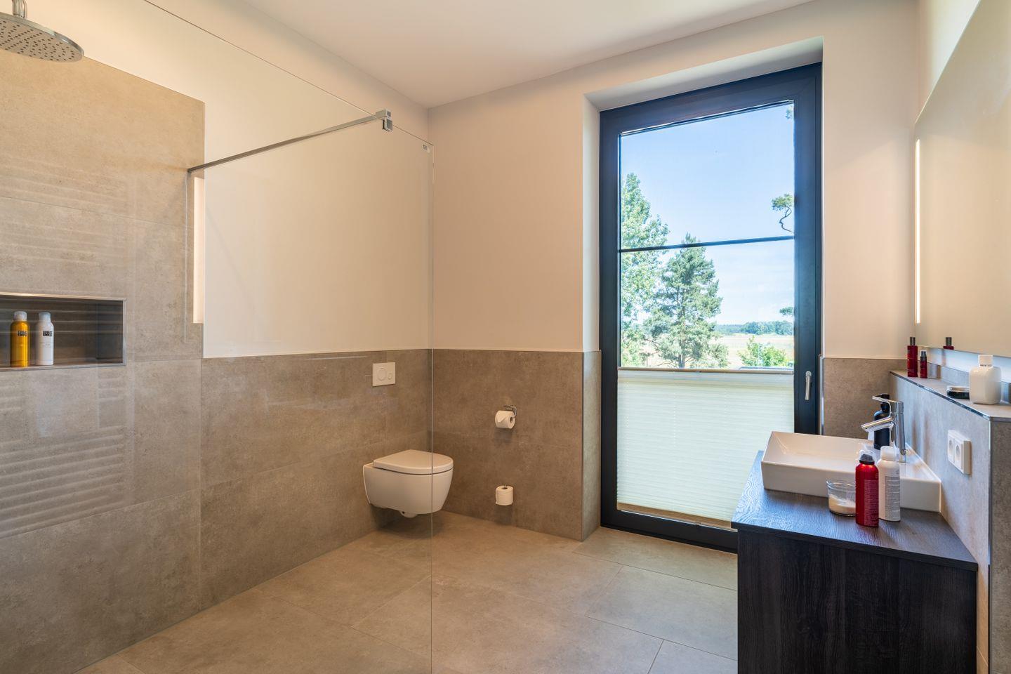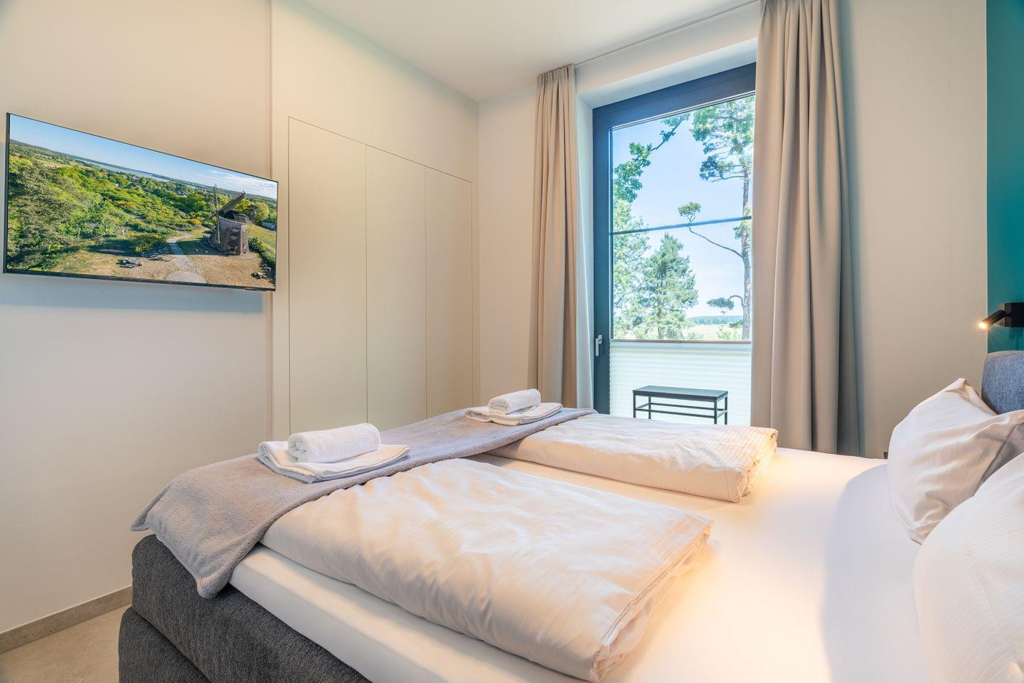Das Hauptschlafzimmer verfügt über ein elegantes Bad en suite mit bodengleicher Dusche und freistehender Badewanne. Der direkte Zugang zum Balkon und der herrliche Ausblick über das Haff verleihen diesem Raum besondere Qualität – ein privater Ort für entspannte Morgen und stille Abende.
