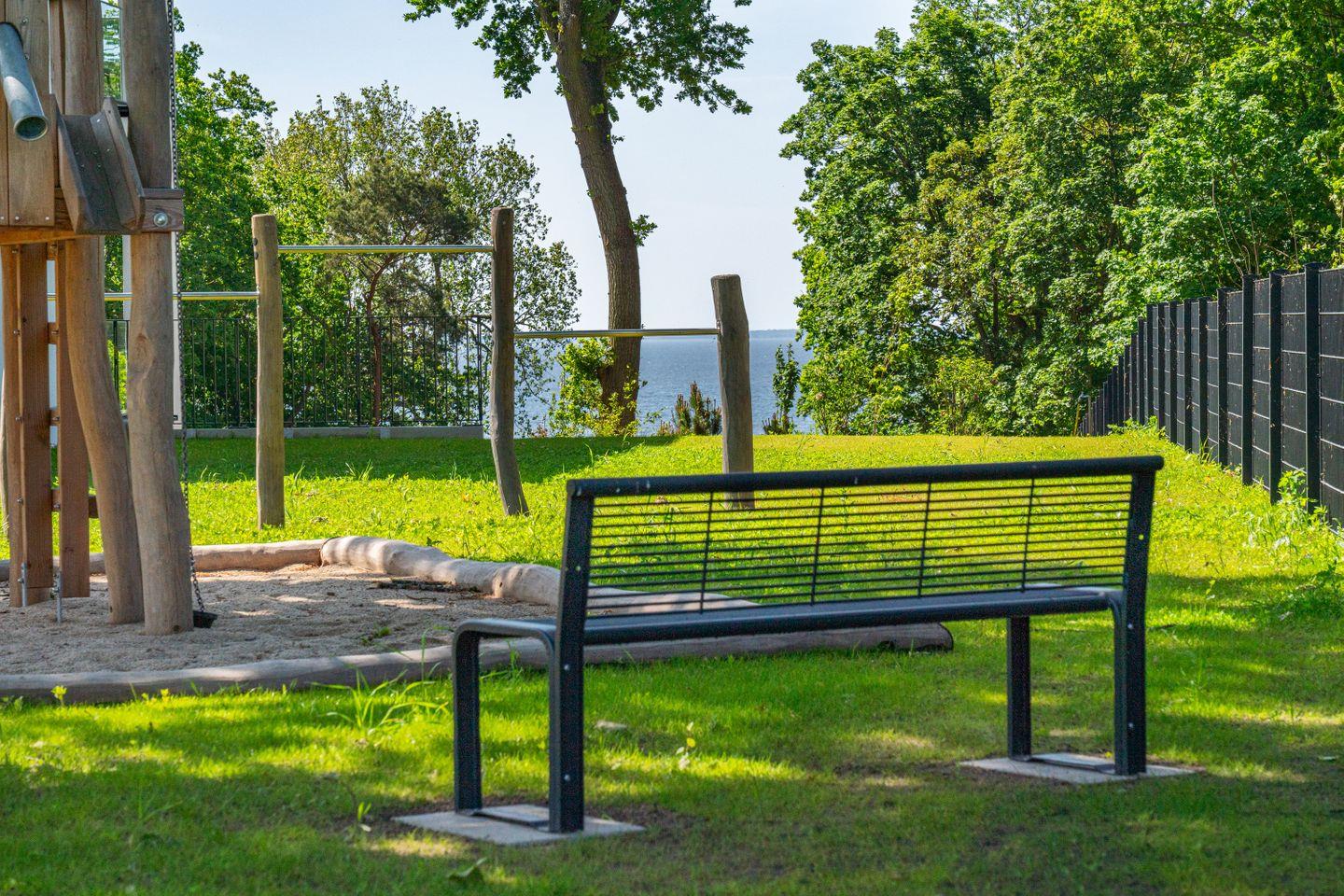 Der überdachte Balkon bietet einen privaten Blick auf das Stettiner Haff – Ruhe pur. Familienfreundlich mit Garten, Spielbereich, Grillplatz, Sauna, Whirlpool & Fitnessbereich.