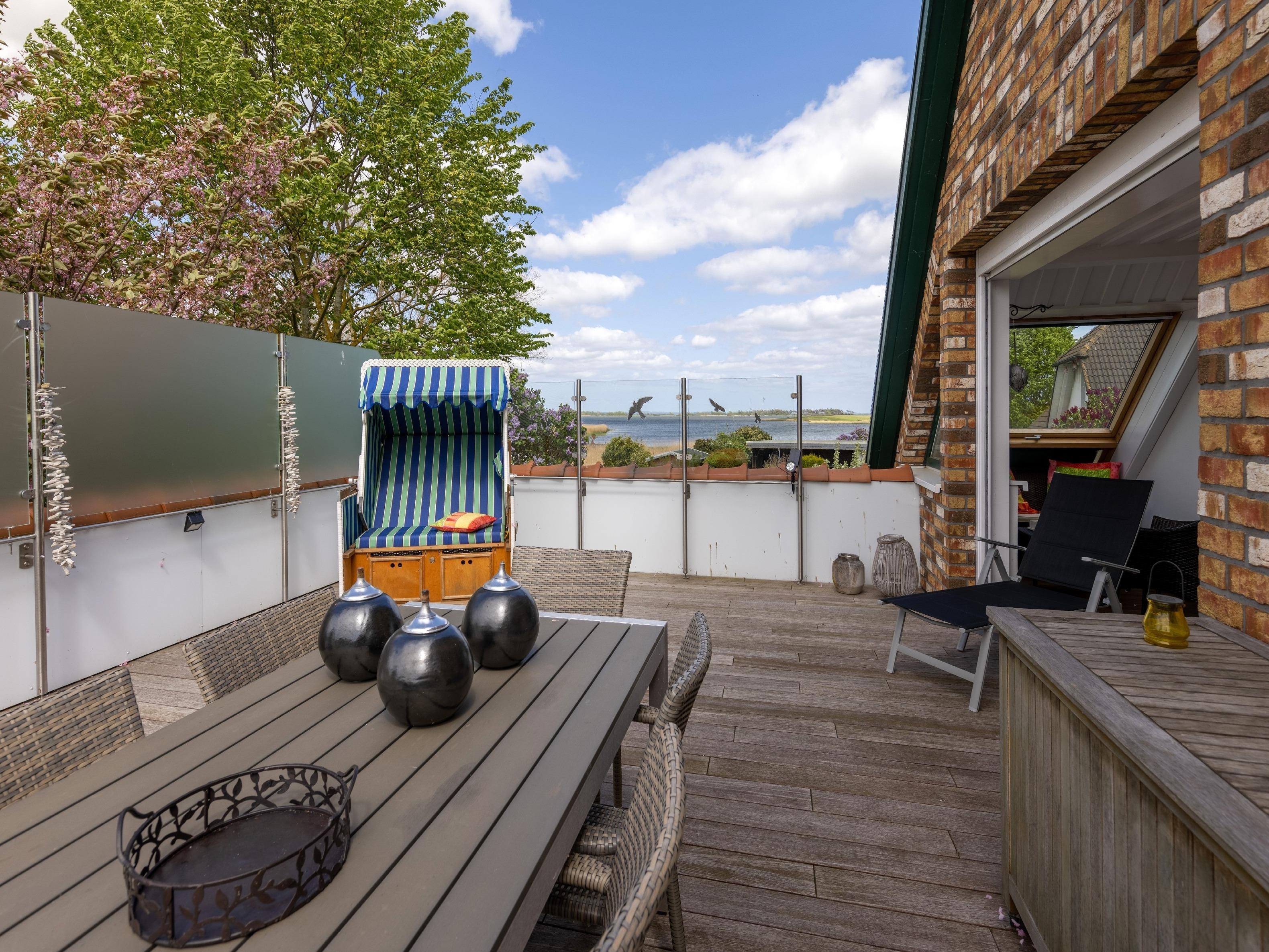 Vom ersten Moment an umgibt Sie ein Gefühl von Ruhe und Weite. Morgens barfuß auf dem Balkon stehen und die frische Boddenluft atmen. Mittags die Sonne auf der großen Panorama-Dachterrasse genießen - geschützt im Strandkorb, mit Blick auf das glitzernde Wasser. Abends gemeinsam kochen, lachen, am Kamin zur Ruhe kommen. Alles ist hochwertig eingerichtet, durchdacht und geschmackvoll; damit Sie sich einfach nur wohlfühlen können.