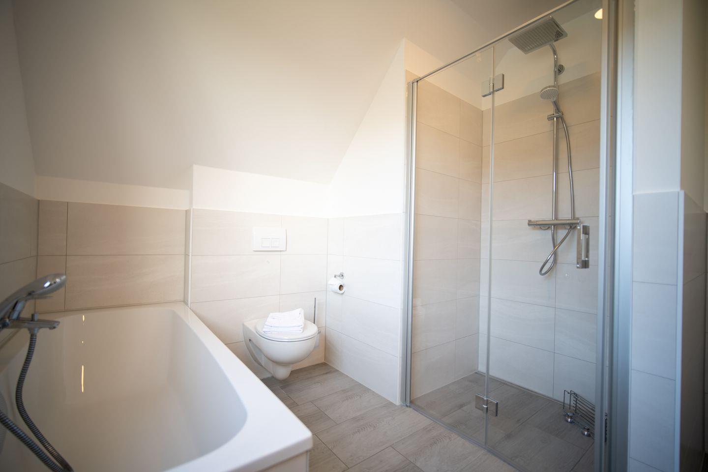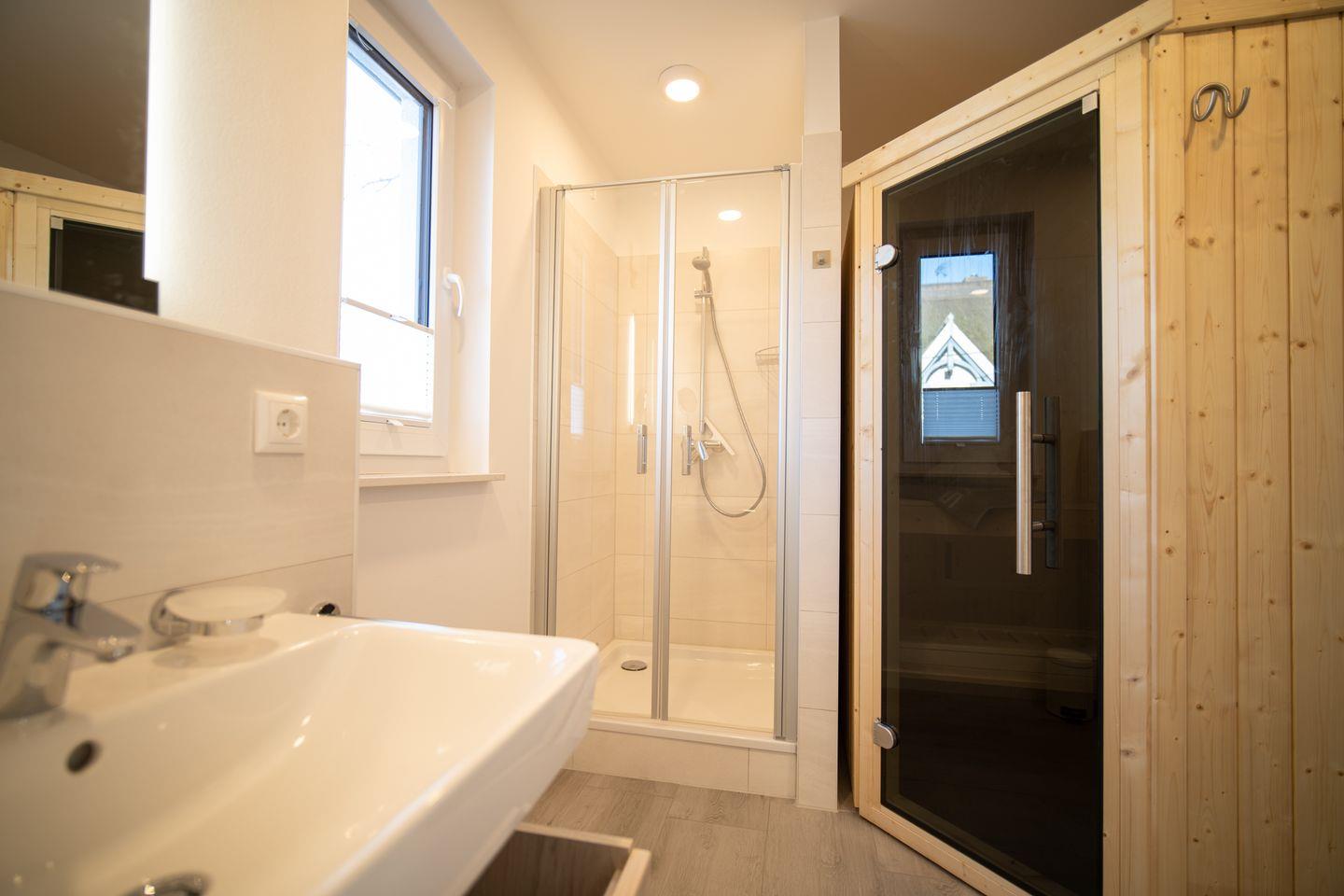 Das moderne Tageslichtbad mit Dusche und Badewanne ergänzt das Raumangebot. Ein weiteres Duschbad befindet sich im Erdgeschoss — und dort wartet auch das besondere Highlight des Hauses: die private Sauna, die Sie jederzeit für sich nutzen können.