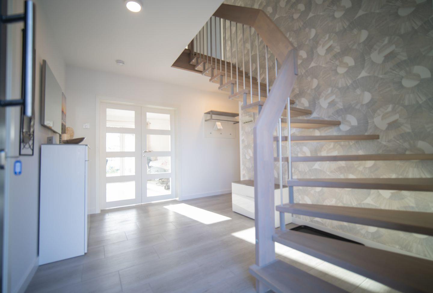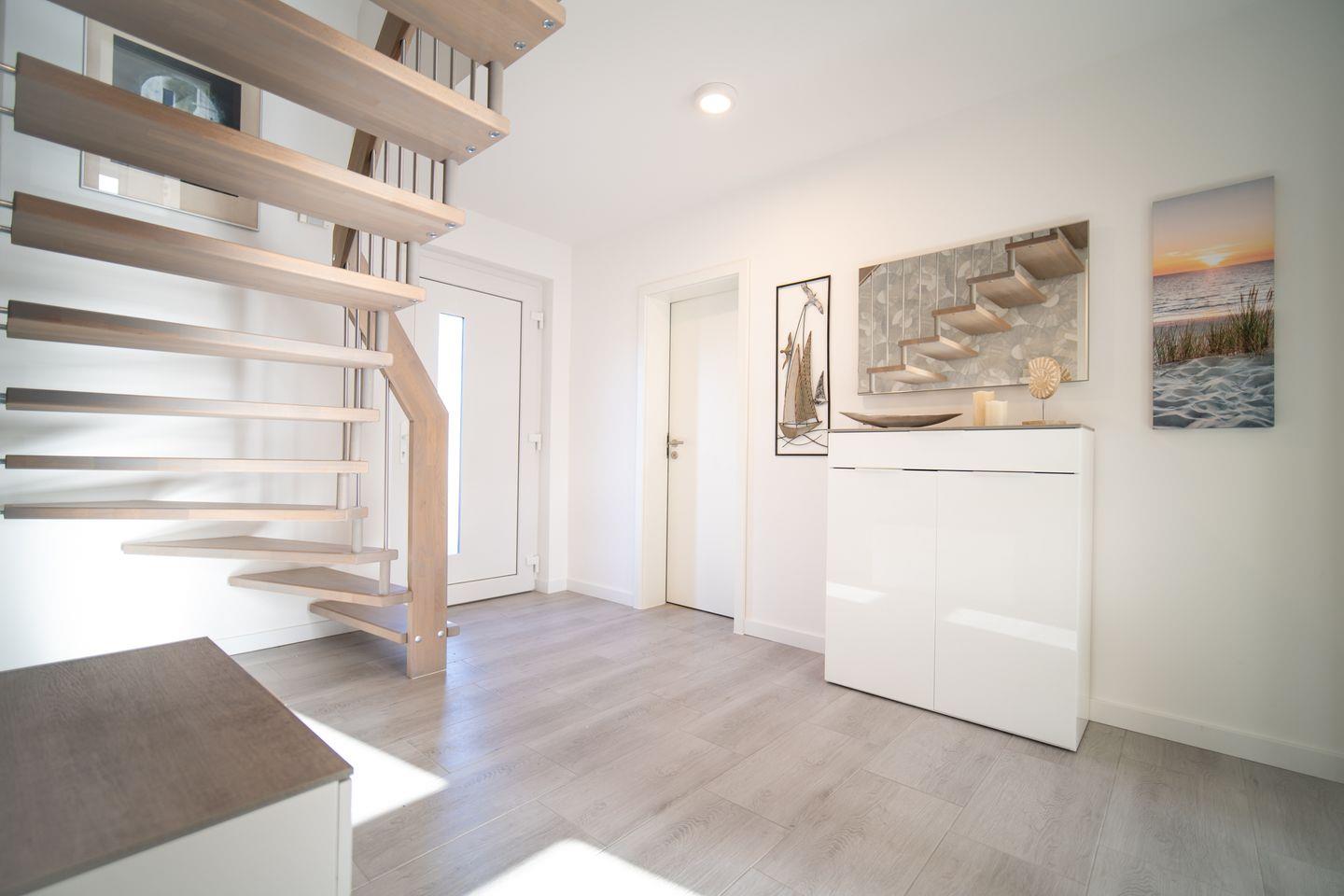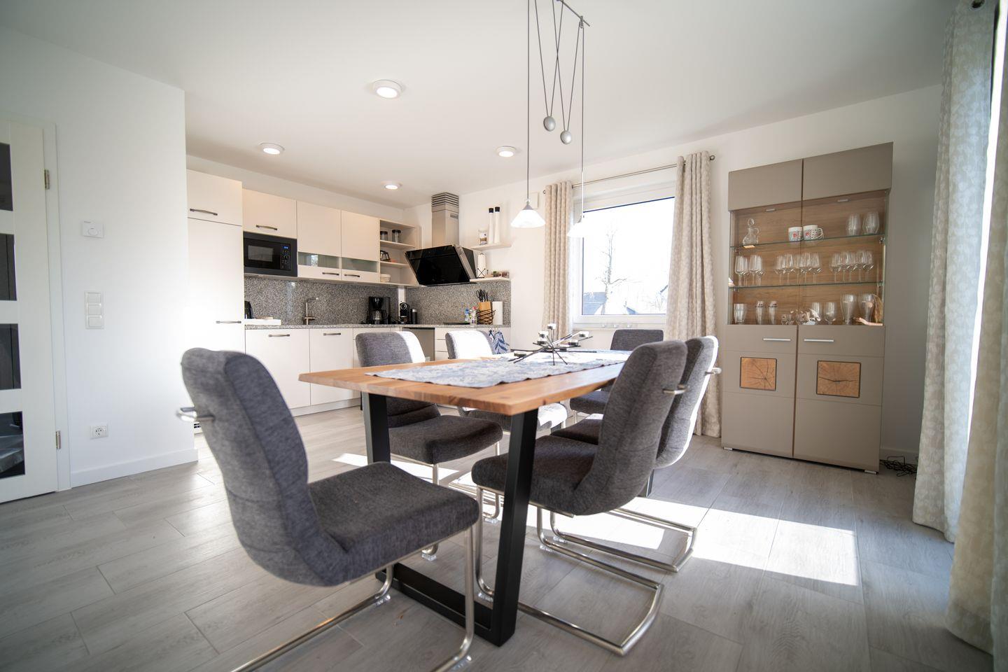 Schon beim Betreten werden Sie von einem hellen, freundlichen Eingangsbereich empfangen. Von hier geht es in den großzügigen Wohn- und Essbereich mit offener Küche. Große Fensterflächen bringen viel Licht ins Haus, während der Kaminofen eine warme, gemütliche Atmosphäre schafft – perfekt für lange Abende nach Ausflügen auf der Insel.