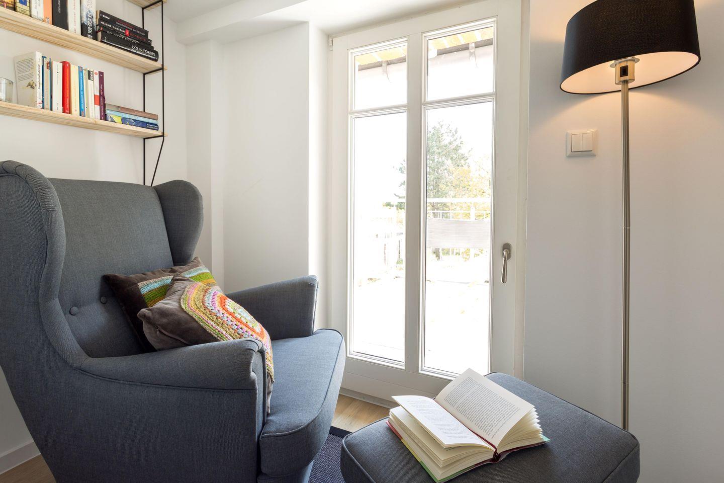 Das Wohn-/ Esszimmer mit offener Küche bietet einen weiten Ausblick nach Osten und Süden; das Schlafzimmer ist nach Norden ausgerichtet mit Blick zum Gutshaus. Das besondere Highlight der Wohnung ist ein kuscheliger Leseplatz am Zugang zum großen Süd-Balkon und natürlich der Balkon selbst!