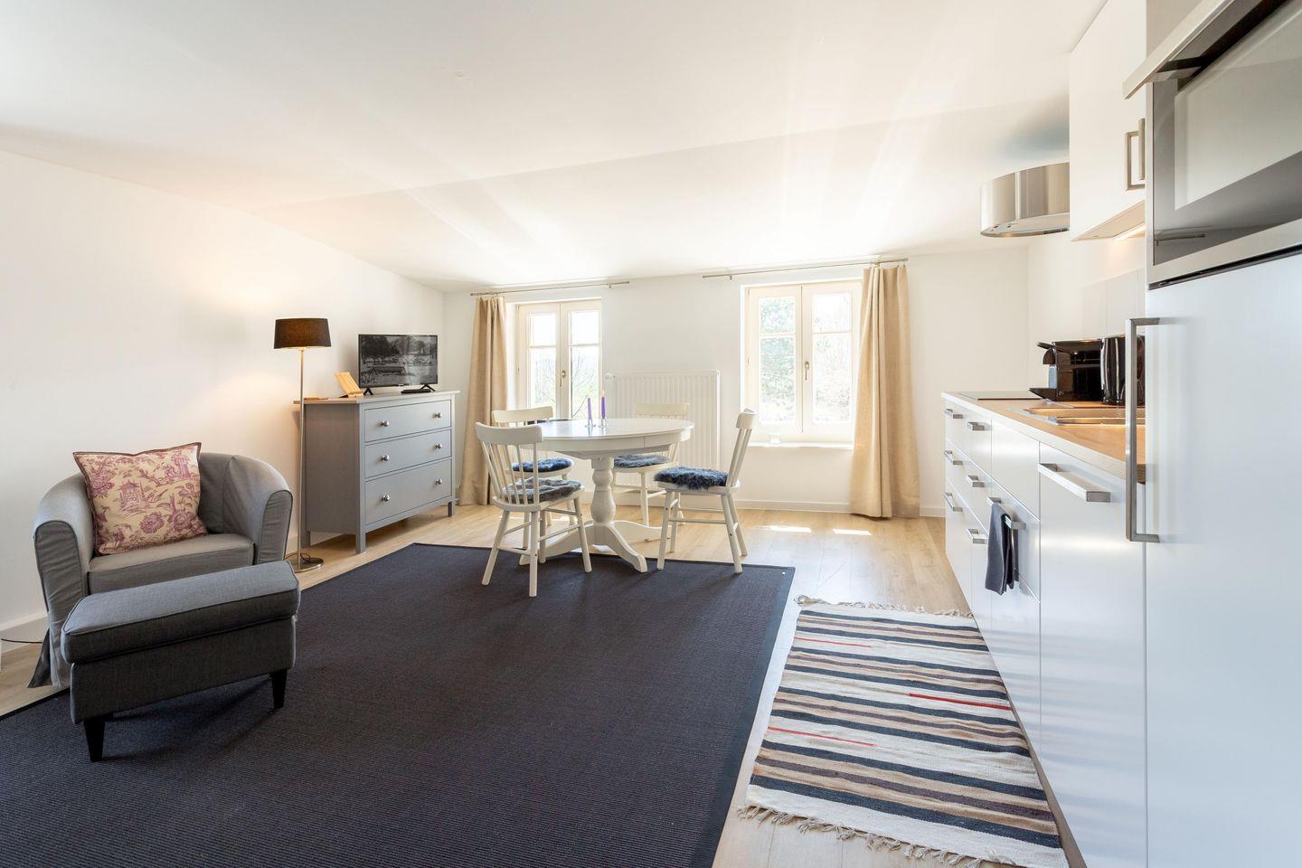 Auf 45 m² finden Sie eine offene, voll ausgestattete Wohnküche mit Backofen/Mikrowelle, Kühlschrank mit Gefrierkombination und einem Esstisch.