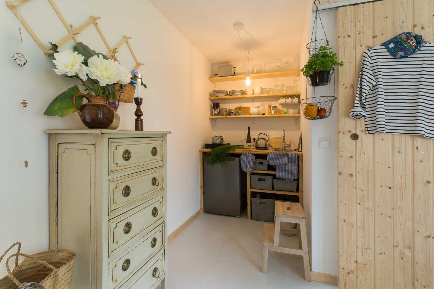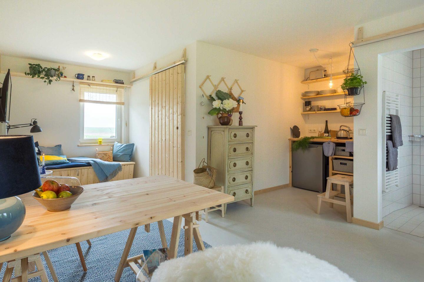 Lazy "Milou" ist ein kleiner Bungalow mit einem Schlafzimmer und Etagenbett. Sie treten direkt in den Wohnbereich ein. Das Bad verfügt über eine ebenerdige Dusche. Bewusst haben wir uns auch in der Küche auf das wesentliche beschränkt - es gibt ein Induktionskochfeld und einen Kühlschrank mit Gefrierfach.