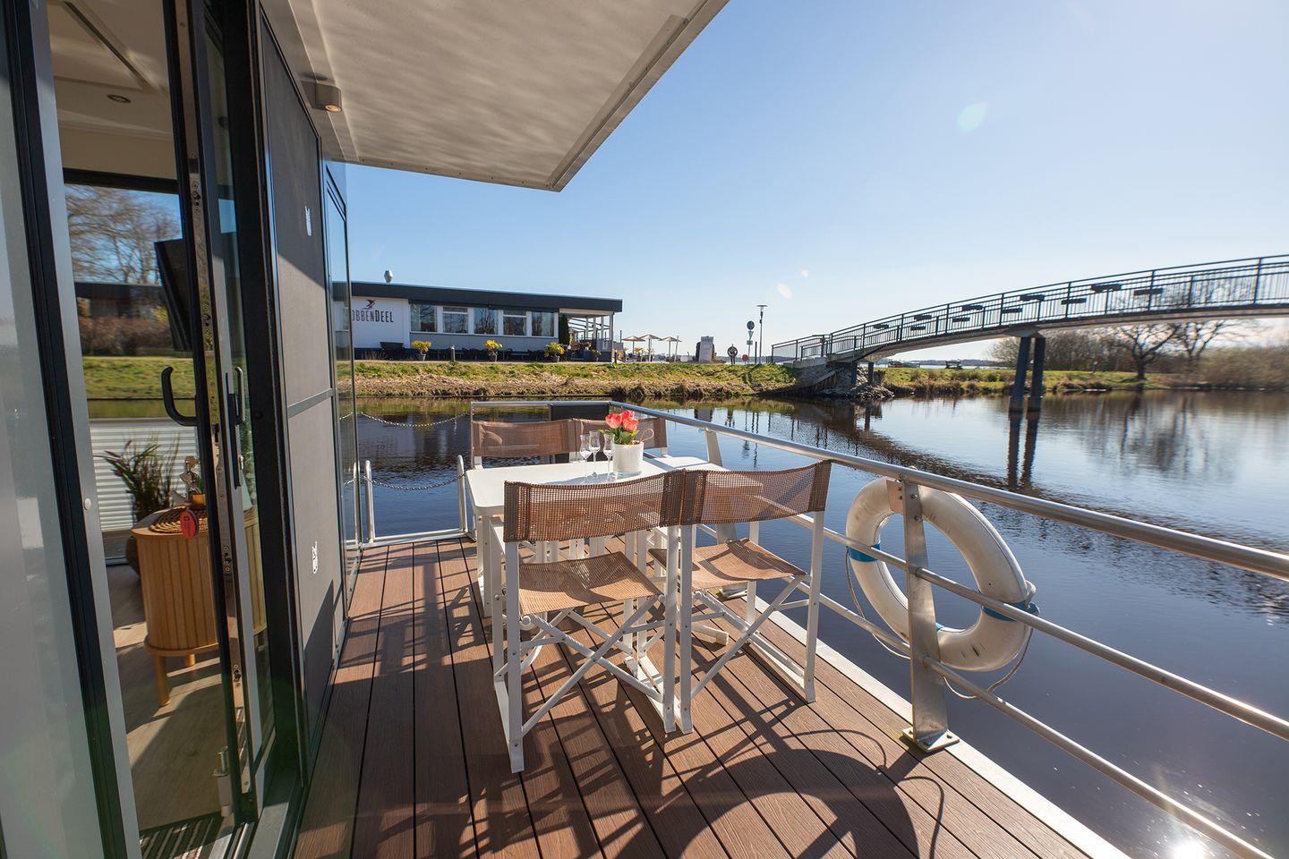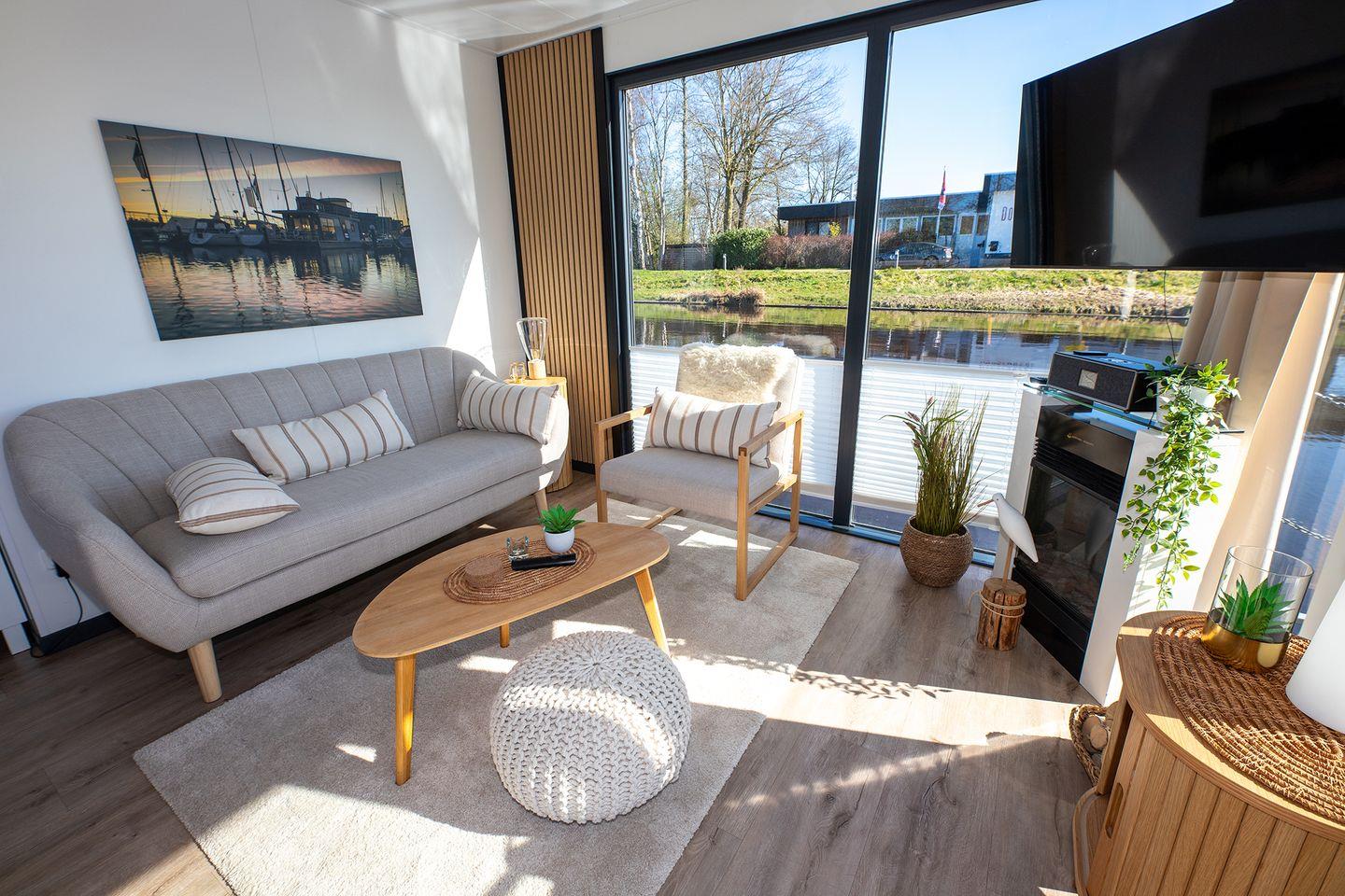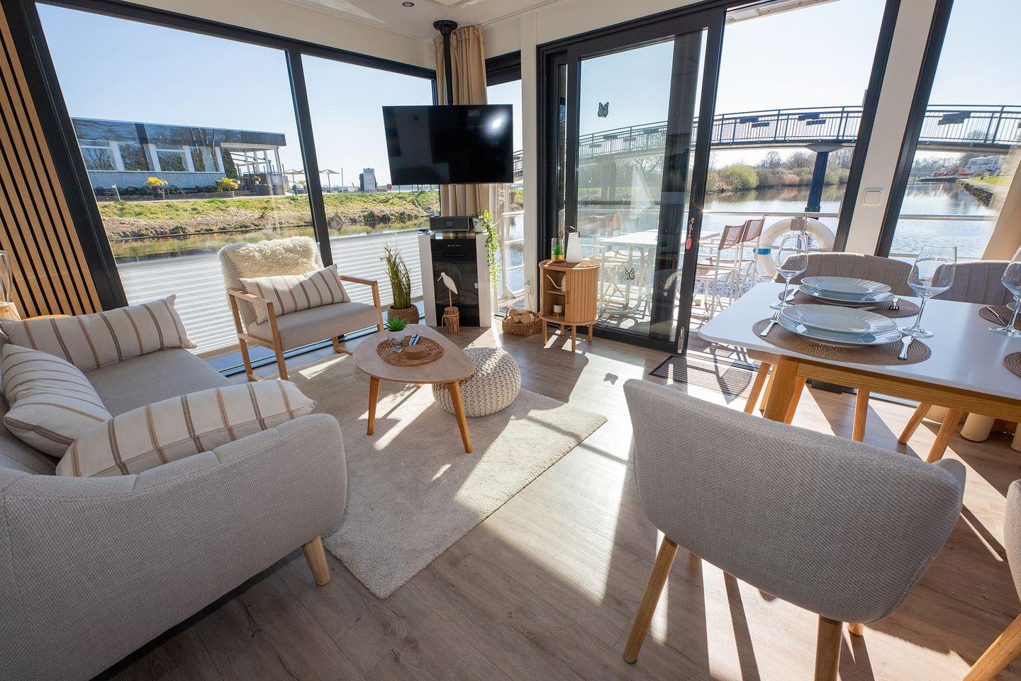 Erleben Sie erholsamen Urlaub auf dem fest verankerten Hausboot mit Panoramablick in Bad Bederkesa.
