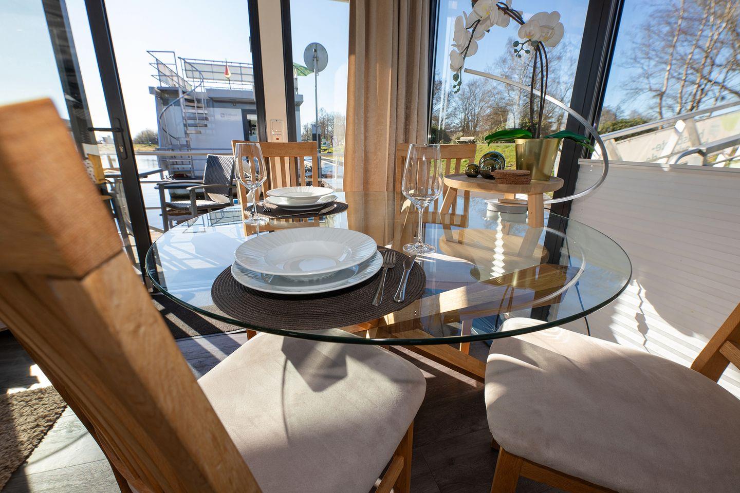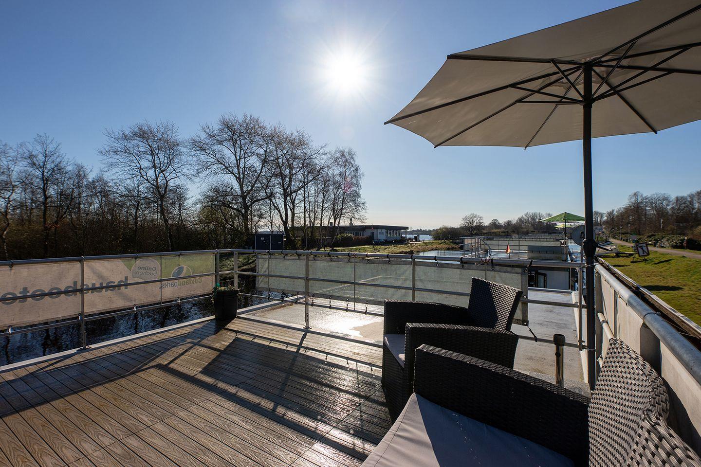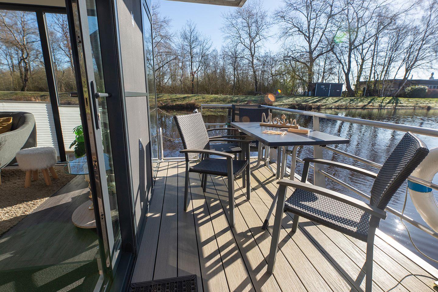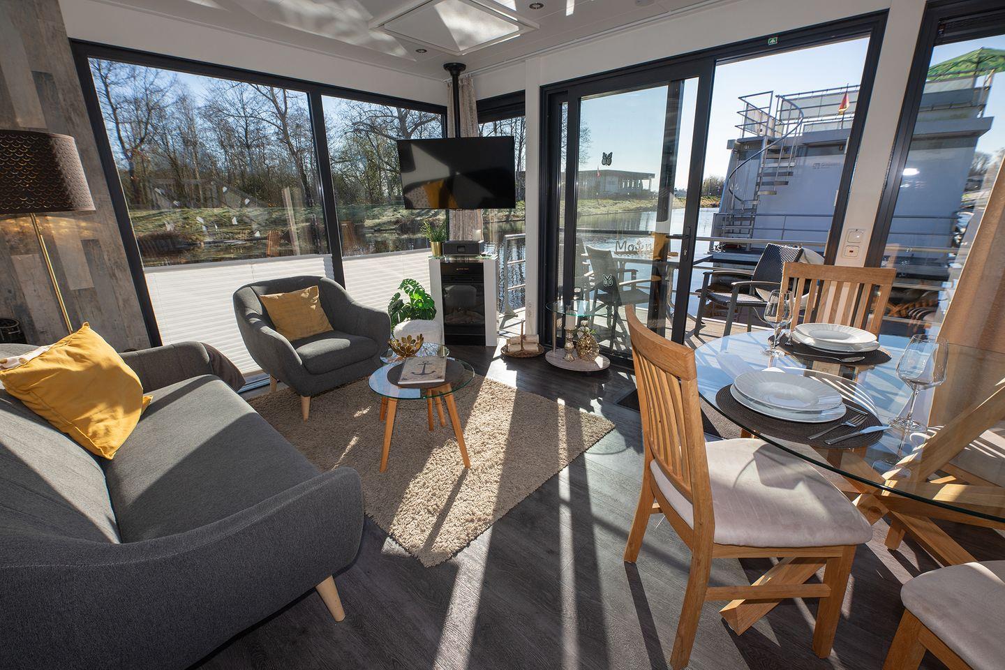 Erleben Sie erholsamen Urlaub auf dem ruhigen, komfortablen Hausboot 5 Seekönig in Bad Bederkesa mit Kamin und Dachterrasse.