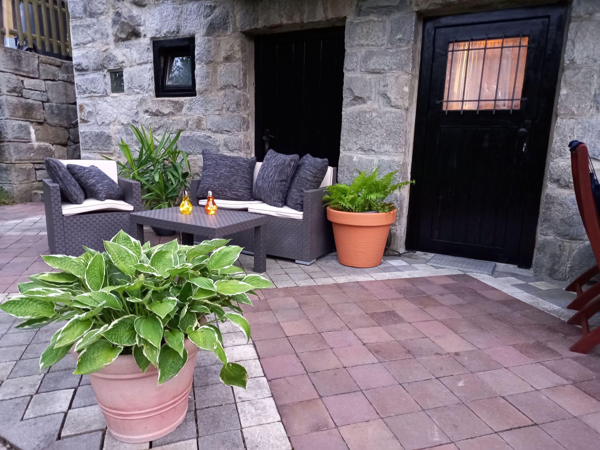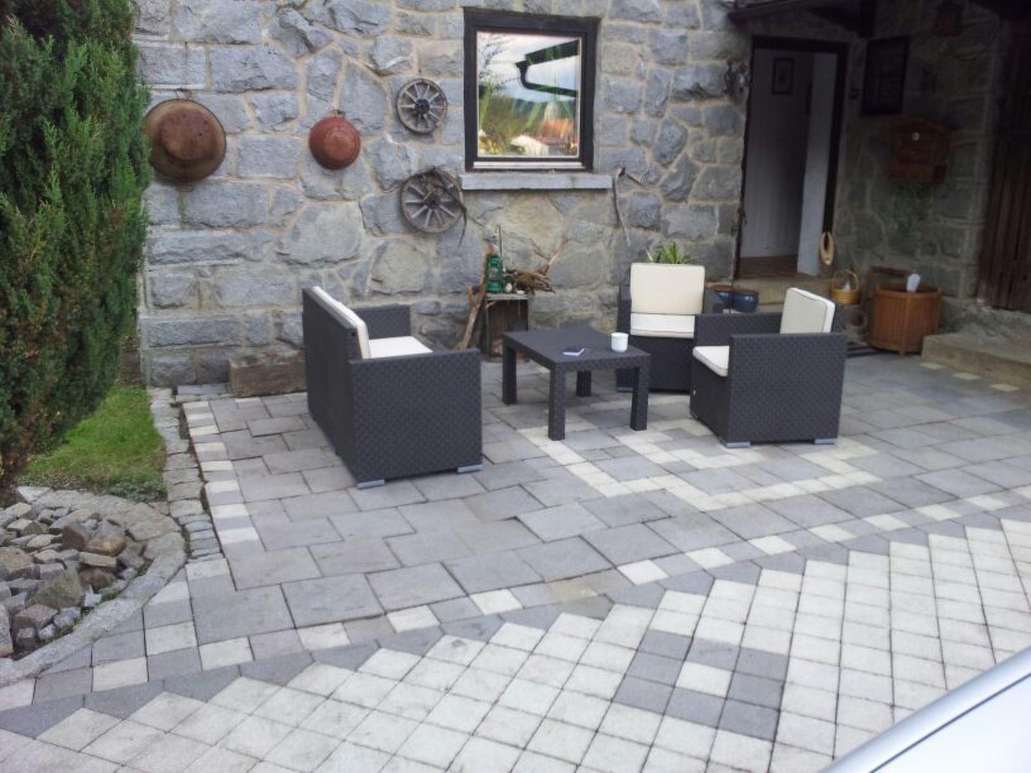 Terrasse, Stühle mit Auflagen, Liegen, Sonnenschirm, kleiner Grill sowie Grillplatz im 1200 qm Garten.