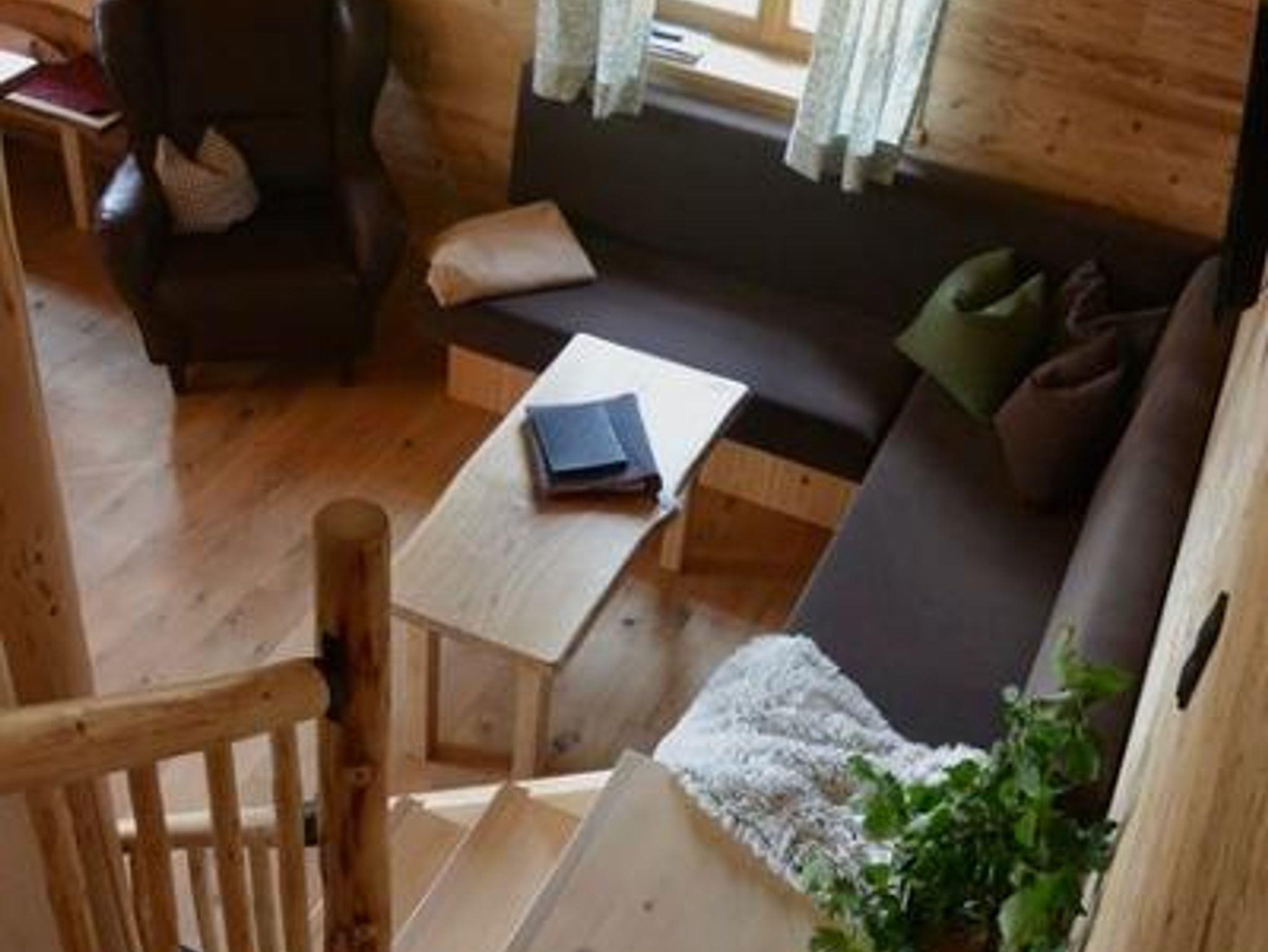 Ein moderner Kaminofen, der mit prasselndem Feuer wohlige Wärme verbreitet. Die Couch zum Ruhen, die zwei Ohrensesseln zum Lesen, oder Schauen oder Nichtstun. Der ganze Raum im romantischen Chalet aus Naturmaterialien ist schön. In der modernen Küche geht der Blick in den Wald und die Wiesen.