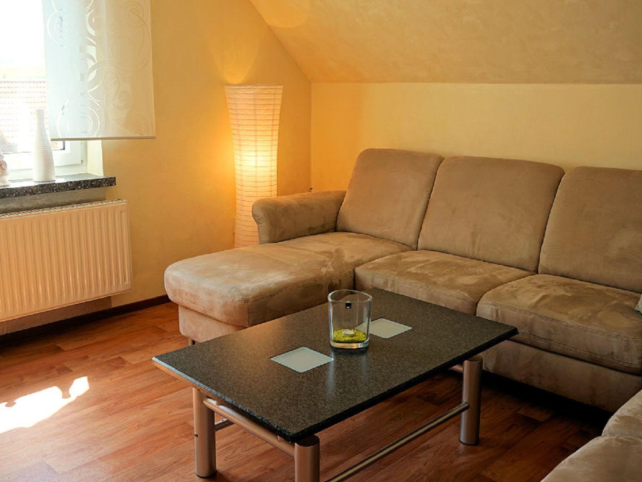 Eine komplett ausgestattete Küche mit Essecke, ein gemütlicher Wohnraum mit Sat-TV und ein Badezimmer mit Dusche und Badewanne, separates WC sowie W-LAN gehören ebenso zum Umfang der Ferienwohnung.