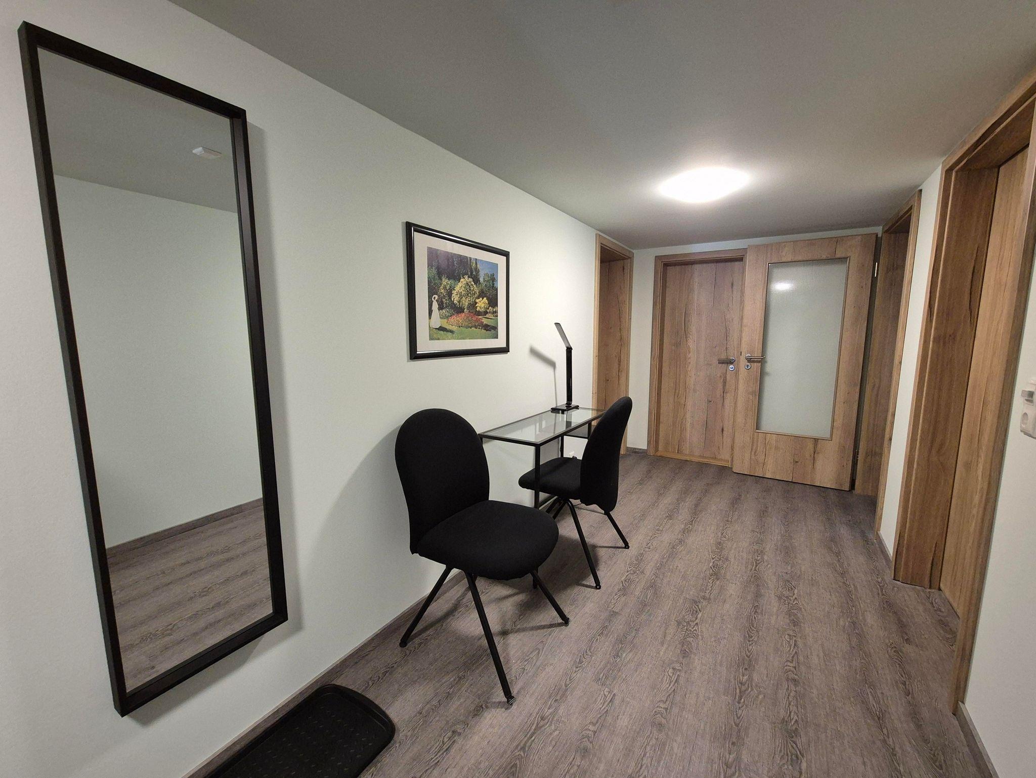 Die FeWo Kohlhaukuppe im 1. OG, mit großem Flur (kleiner Schreibtisch), Wohnzimmer mit neuer Einbauküche (inklusive Backofen, Mikrowelle und Geschirrspüler) Esstisch für 8 Pers., Couch (für 2 Aufbettungen 160x200cm), Sat-TV, zwei separate Schlafzimmer je mit Doppelbett (180x200cm) u. Einzelbett (90 x200cm), ein Balkon zur Hofseite, 2 Bäder je mit Dusche/WC, dazu 1 Infrarot-Ecksauna für 4 Personen.