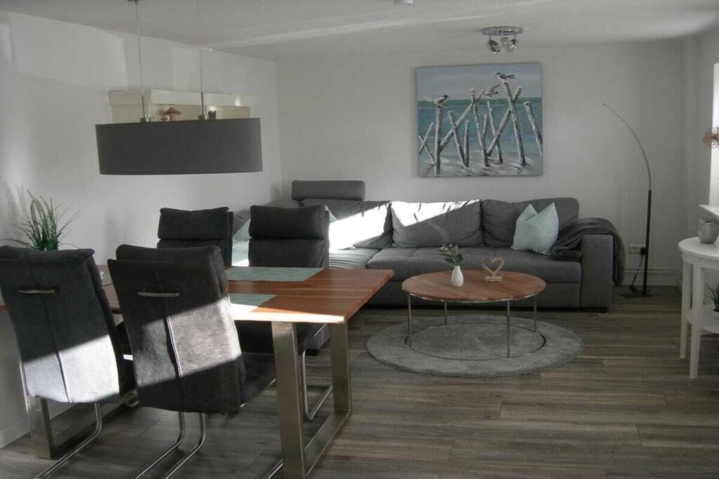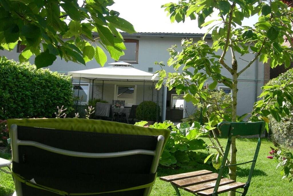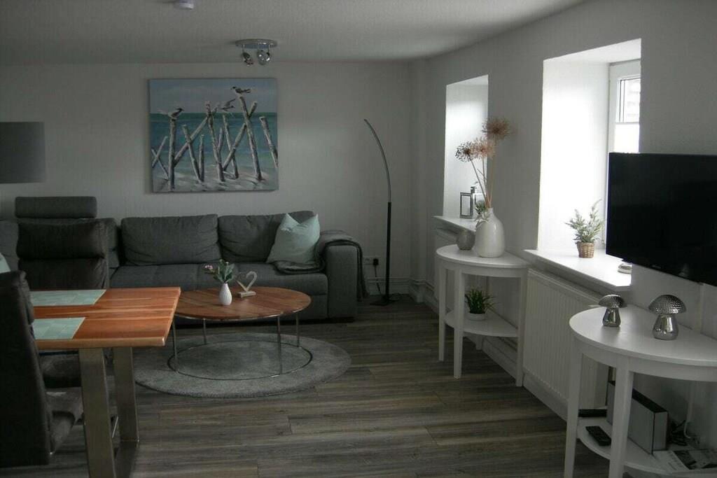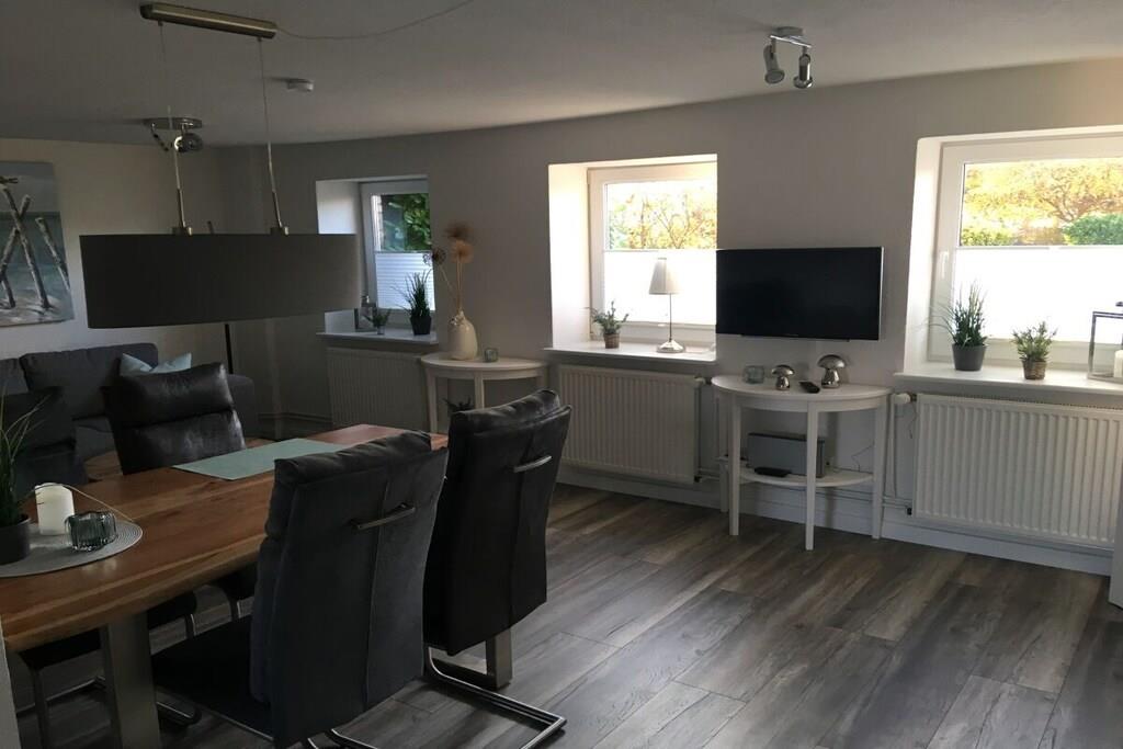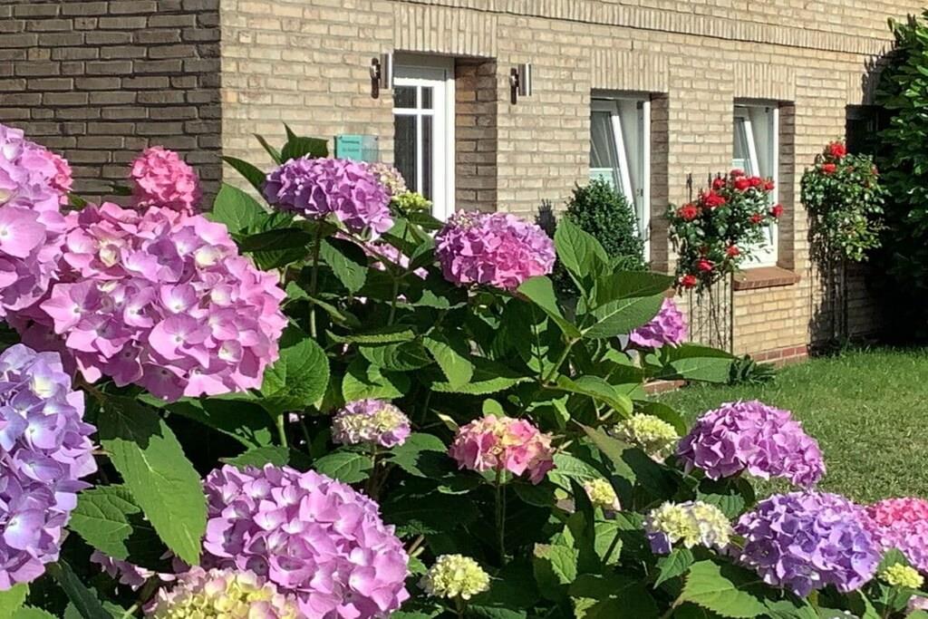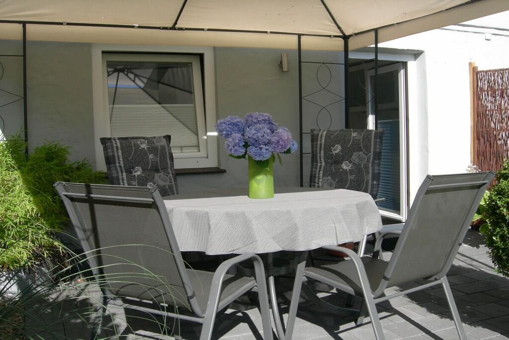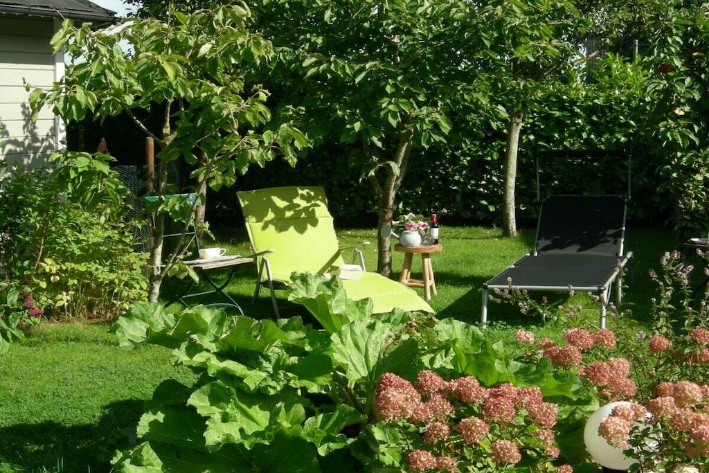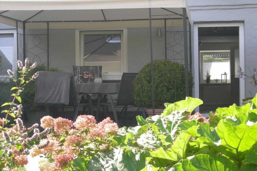 Moderne Ferienwohnung in Gelting mit Terrasse und blühendem Garten für entspannte Tage zu zweit.