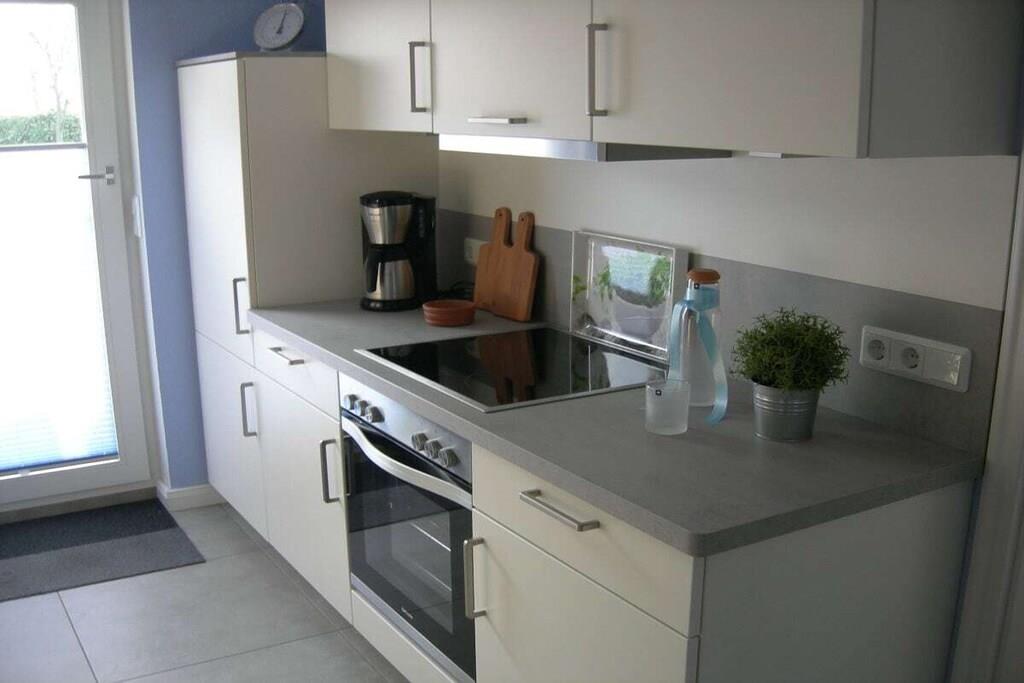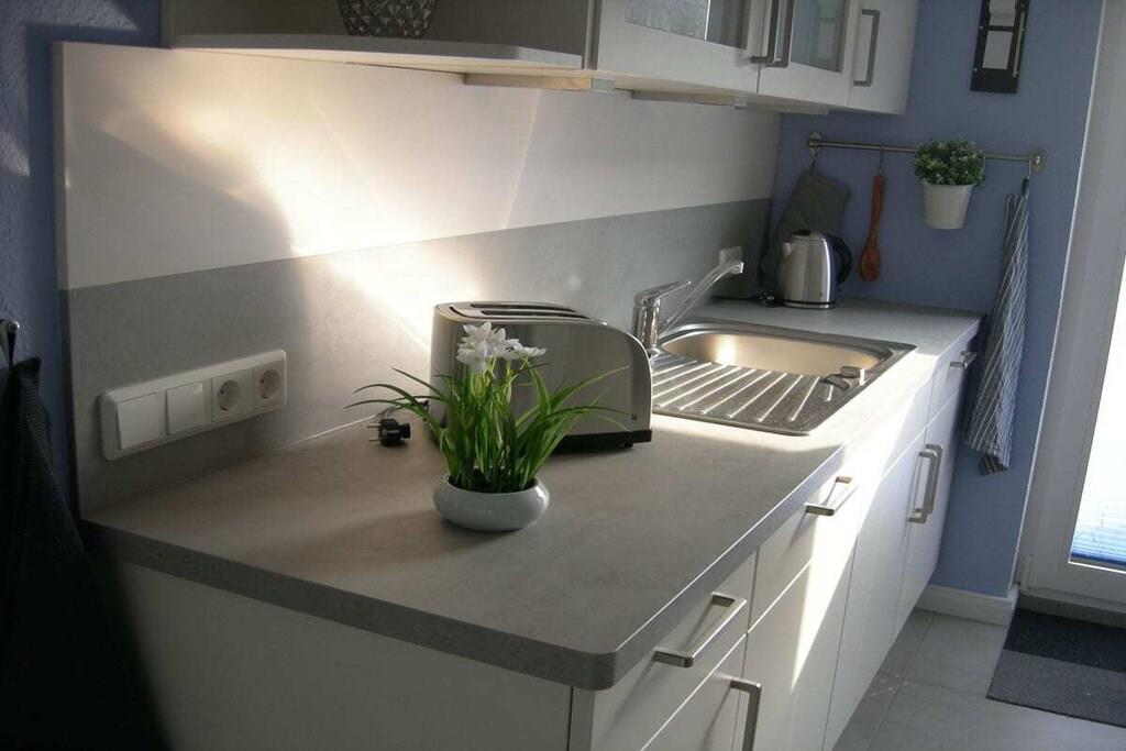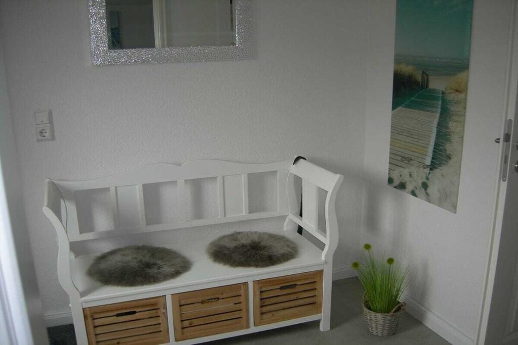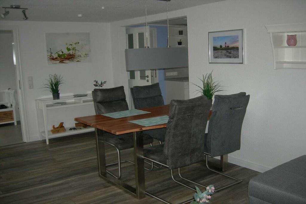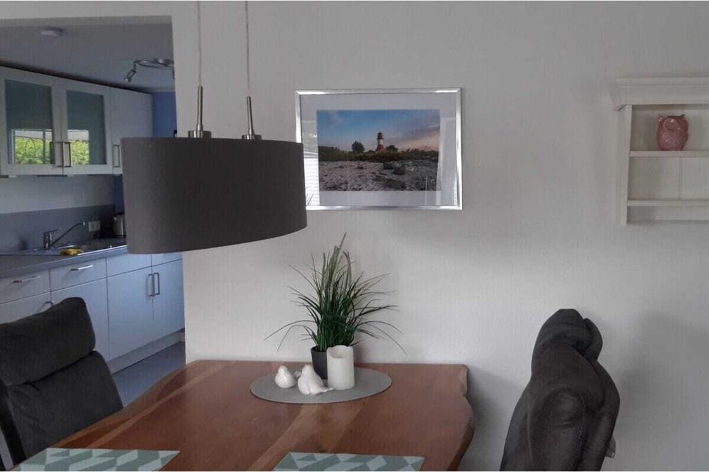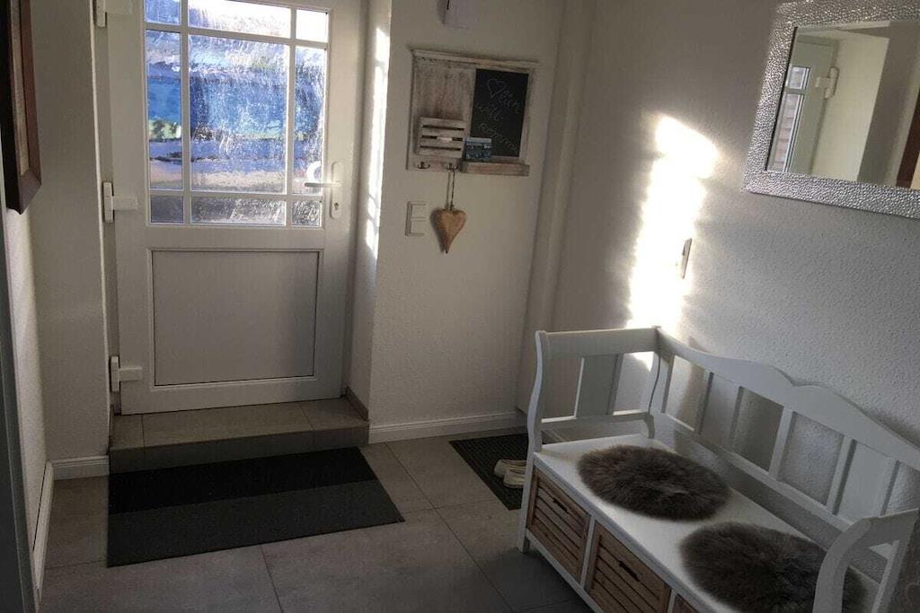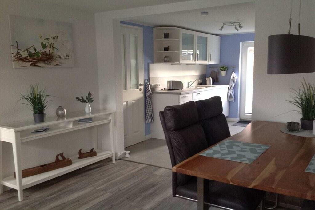 Modern, ebenerdige Ferienwohnung - 55 m²- rechts neben dem Haupthaus - ideal für 2 Gäste. Gemütliches Wohnzimmer mit ausziehbarer Wohnlandschaft, rustikaler Esstisch und Schwingstühlen. Durchgang zur modernen neuen Einbauküche mit Allem was dazugehört, Spülmaschine, Kühl-Gefrierkombination, Ceran Kochfeld- Backofen, Kaffee -Pad Maschine. Die Küchenausgangstür führt zur 15 m² gepflasterten mit Weidenplatten abgegrenzten Terrasse - im Sommer mit einem Pavillon überdacht- mit Blick nach Osten in den blühenden Obst-Blumengarten zum Genießen und Relaxen! Ein Schlafzimmer mit geschmiedetem Doppelbett und geräumigen Schrank. Das neue Bad besteht aus einer ebenerdiger Dusche, Hänge WC und Glasspültisch. Ein geräumiger Flur mit Sitzbank und angrenzendem HWR runden die gemütliche Atmosphäre in der - Alten Tischlerei- ab.