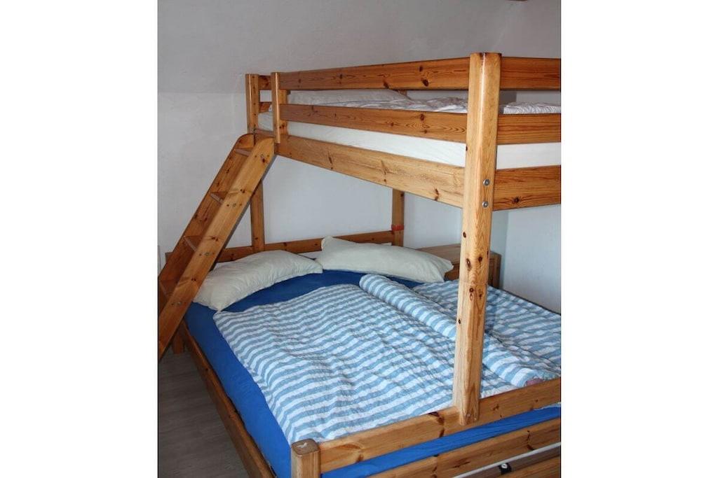 Die Ferienwohnung liegt auf einem ca. 4800 m² großen Grundstück, wovon gut 2500m² als Spielwiese abgetrennt sind. Wohnung 1 (55 m²) liegt im Obergeschoß des Haupthauses und hat bis zu 5 Schlafplätze. Wohnschlafraum mit einem hochwertigen Schrankdoppelbett von Nele. Im Schlafraum ein Doppelbett (darüber über eine schräge Trepper Zusatzbett). eine ca. 23m² große Dachterrasse, die nicht einsehbar ist und den ganzen Tag Sonne hat (natürlich nur, wenn die Sonne scheint ) Moderne Einbauküche (Heißluftherd mit Ceranfeld, Wasserkocher, Kaffeemaschine, Geschirrspüler, Mikrowelle, Toaster und Kühlschrank mit 3 Sterne Gefrierfach).