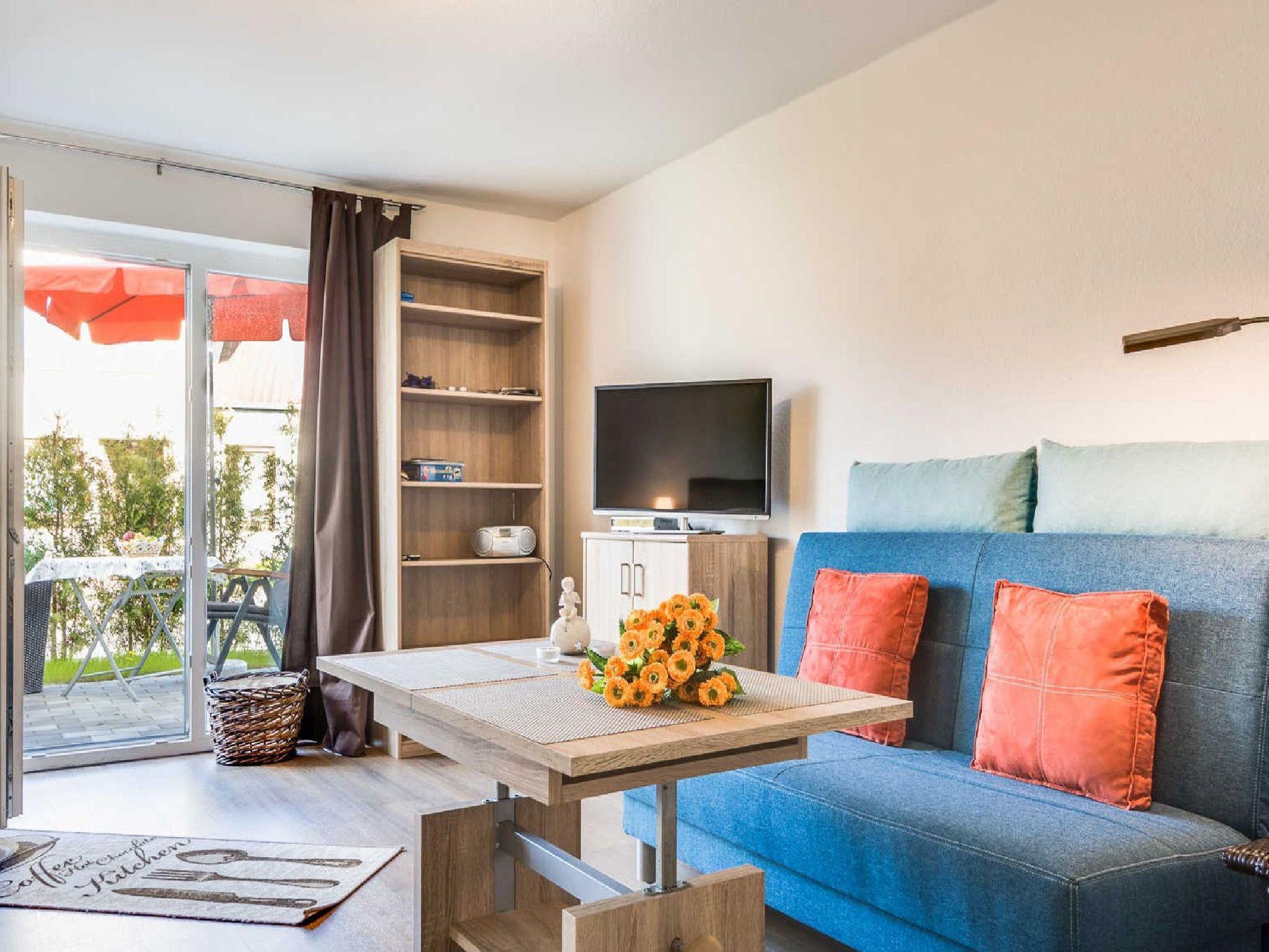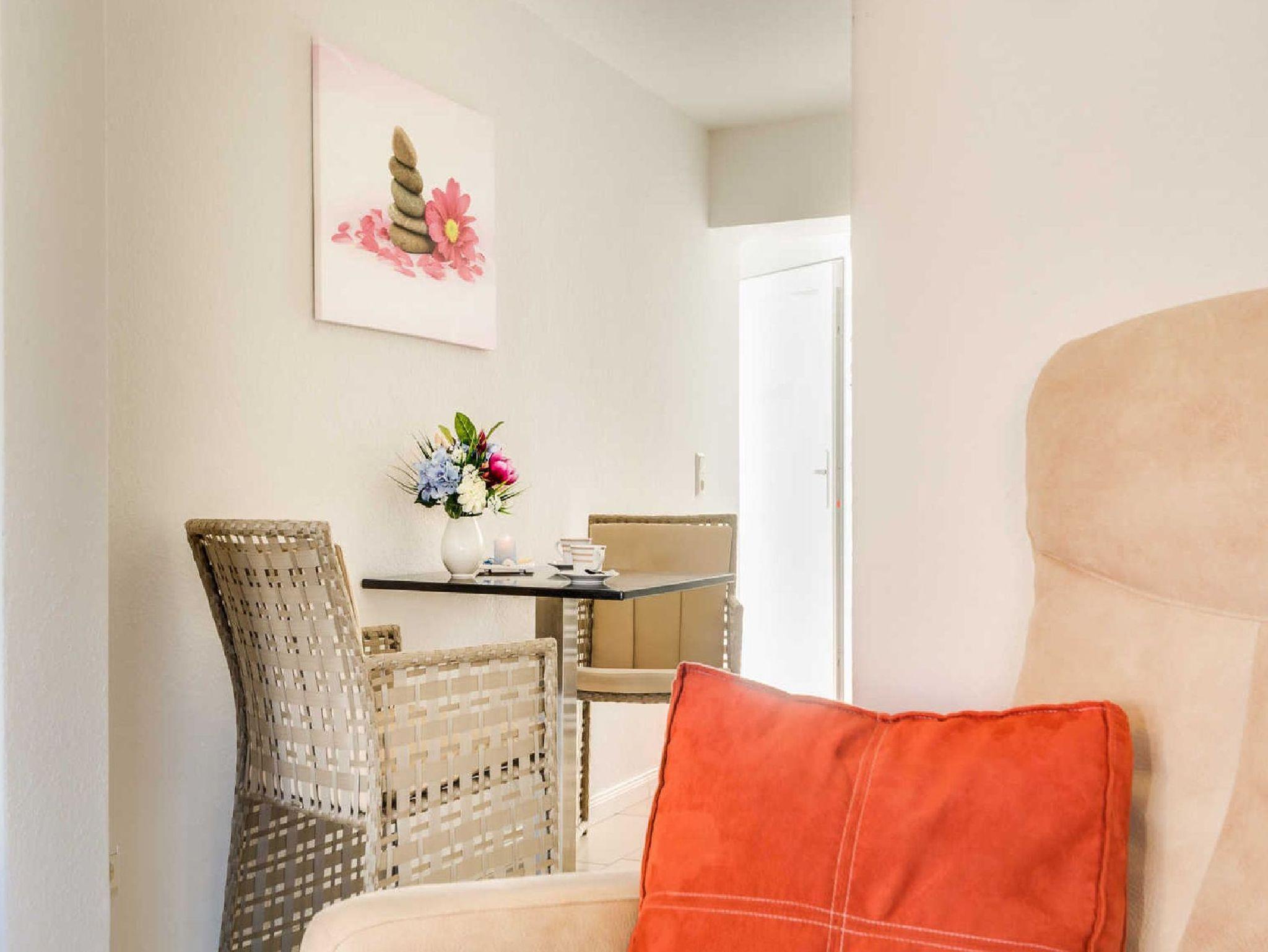 Die helle Ferienwohnung Meer (für 2 Personen) im Erdgeschoß des Ferienhauses bietet auf 45 qm einen Wohn-Schlafbereich mit Zugang zur eigenen Terrasse, eine voll ausgestate Küche, ein Duschbad und einen Flur mit Essplatz. Die Wohnung ist zudem barrierefrei gestaltet und verfügt über einen eigenen ebenerdigen Eingang.