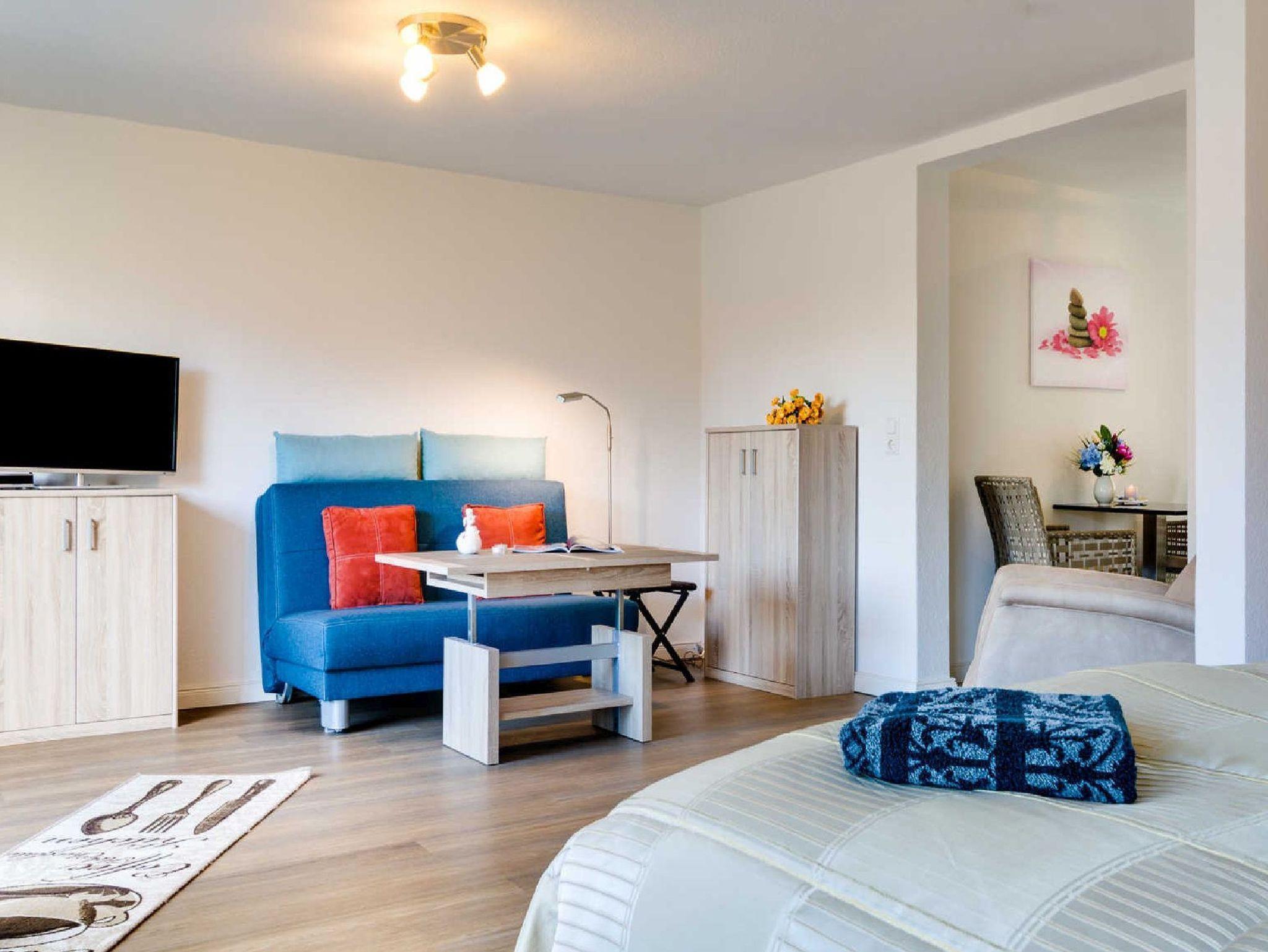 - Wohn- und Schlafraum mit elektrischem Boxspringbett (2x90x200), elektr. Liegesessel mit Aufstehhilfe und Schlaf-Klappsofa; Bettwäsche zubuchbar, Aufrichtehilfe zum Einhängen unter der linken Bettseite, Höhenverstellbarer Wohnzimmertisch