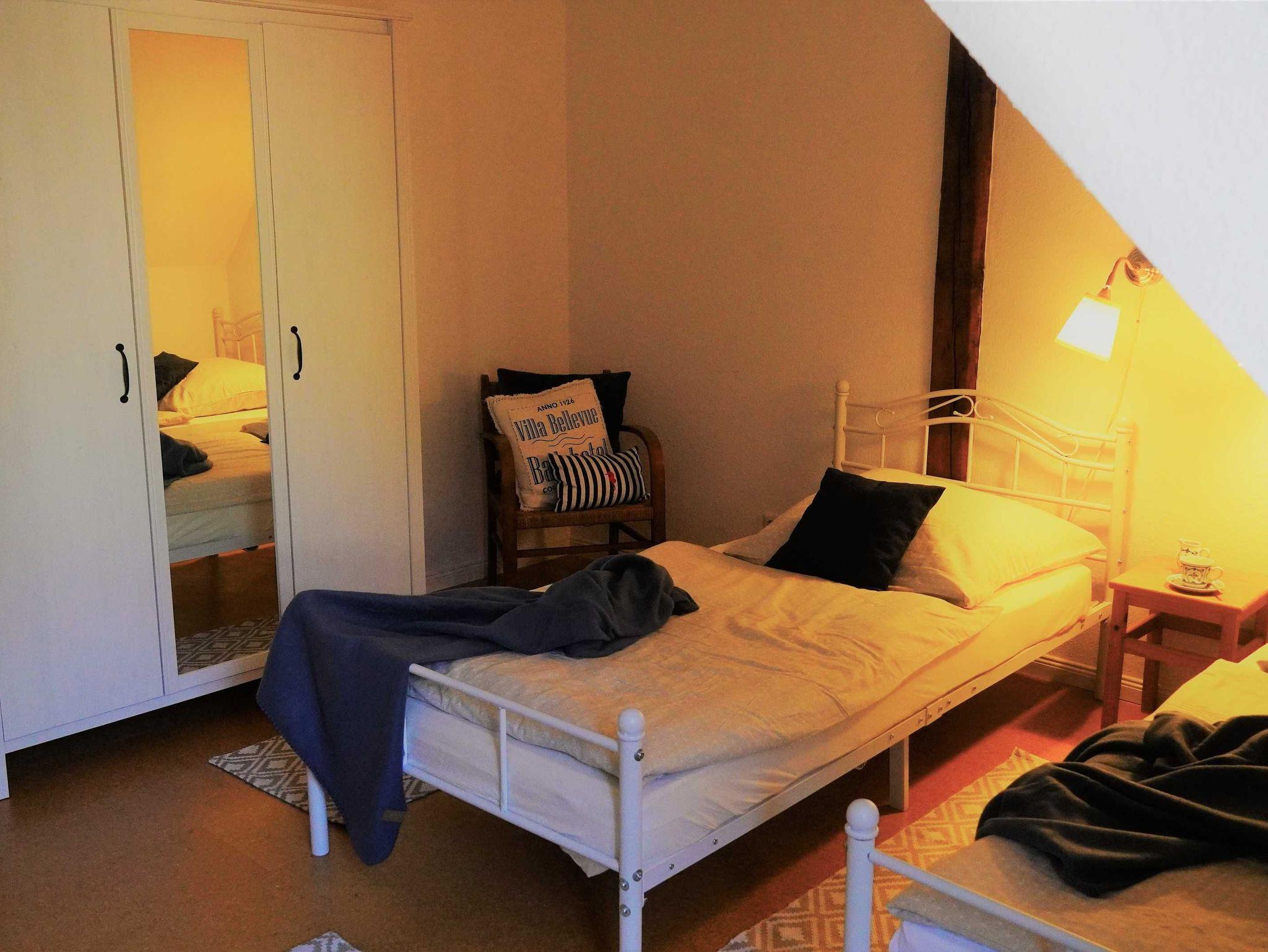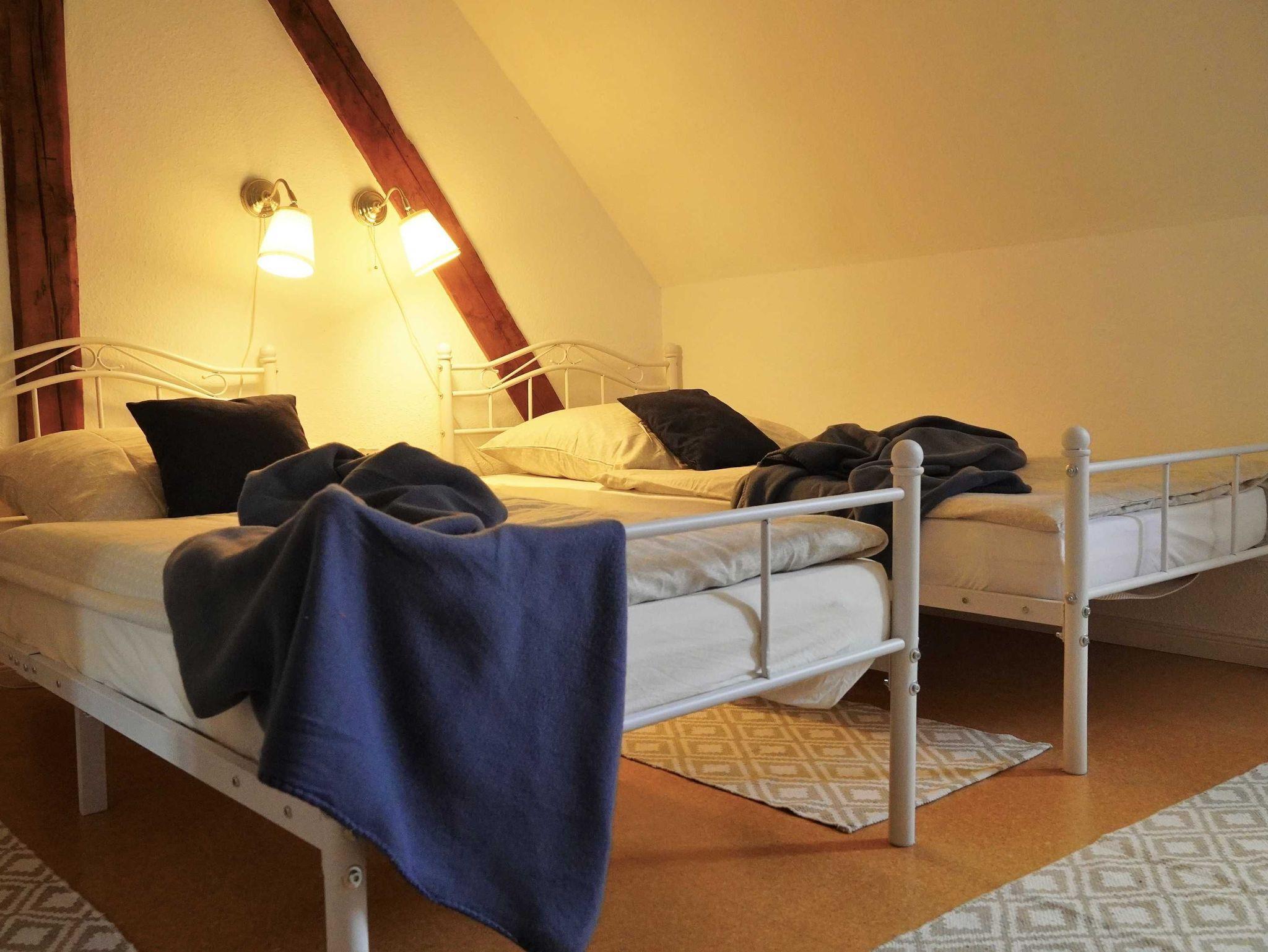 Die Wohnung Hofblick befindet sich im ersten Obergeschoss auf der linken Seite des Hauses. Sie verfügt über insgesamt zwei Schlafzimmer, von dem eins mit einem Doppelbett und das andere mit zwei Einzelbetten ausgestattet ist. Beide Schlafzimmer sind geräumig und bieten komfortablen Platz. Auf Wunsch kann bei Bedarf, ein Kinderbett und ein Hochstuhl dazu gebucht werden. Ein Duschbad ist ebenfalls vorhanden.