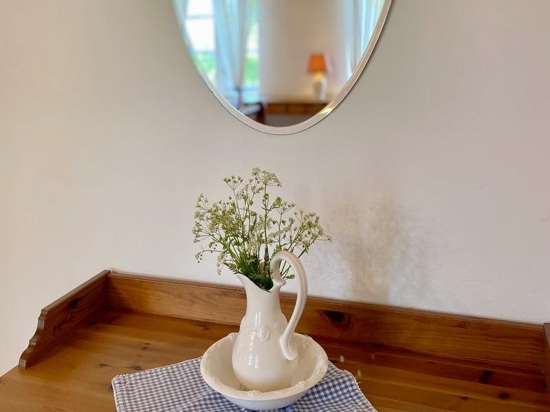 Das Duschbad bietet Ihnen eine bodenebene Dusche, Fußbodenheizung, einen Handtuchtrockner, Handtücher. Holzböden und teilweise Holzdecken mit alten bemalten Balken verleihen der Wohnung eine besondere, gemütliche Atmosphäre.
