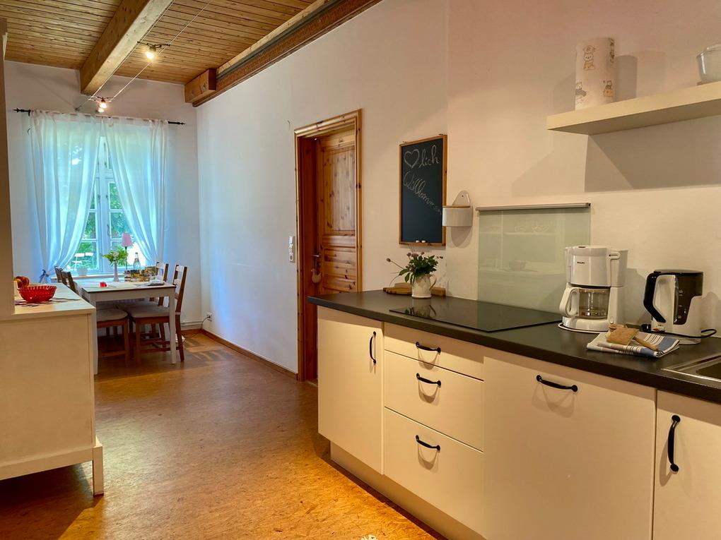 Die "Bauernstube" befindet sich im Haupthaus des Dreiseithofes. Sie wohnen also unter Reet. Über die dazugehörige Terrasse gelangen Sie barrierefrei in das Wohnzimmer und anschließend in die Küche mit Essplatz. In der kleinen Küchenzeile finden Sie vom Wasserkocher über Geschirrspülmaschine bis hin zur Mikrowelle mit Backfunktion u.a. alles, was man für einen angenehmen Urlaub so braucht.