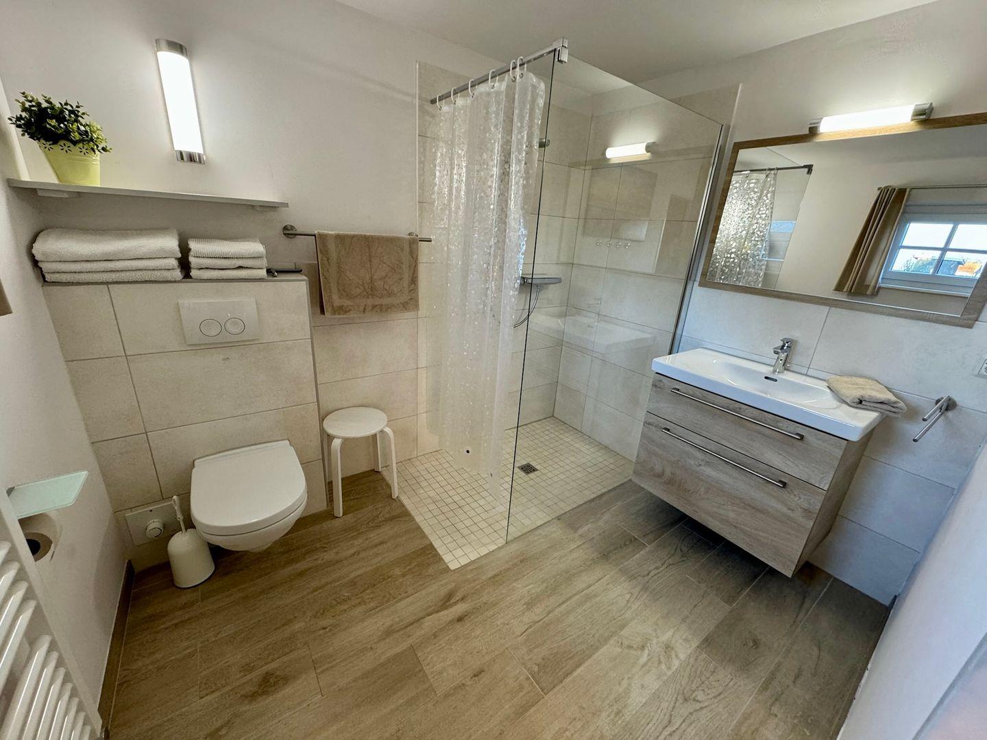 Das moderne Badezimmer ist mit Dusche, WC und Waschbecken ausgestattet.