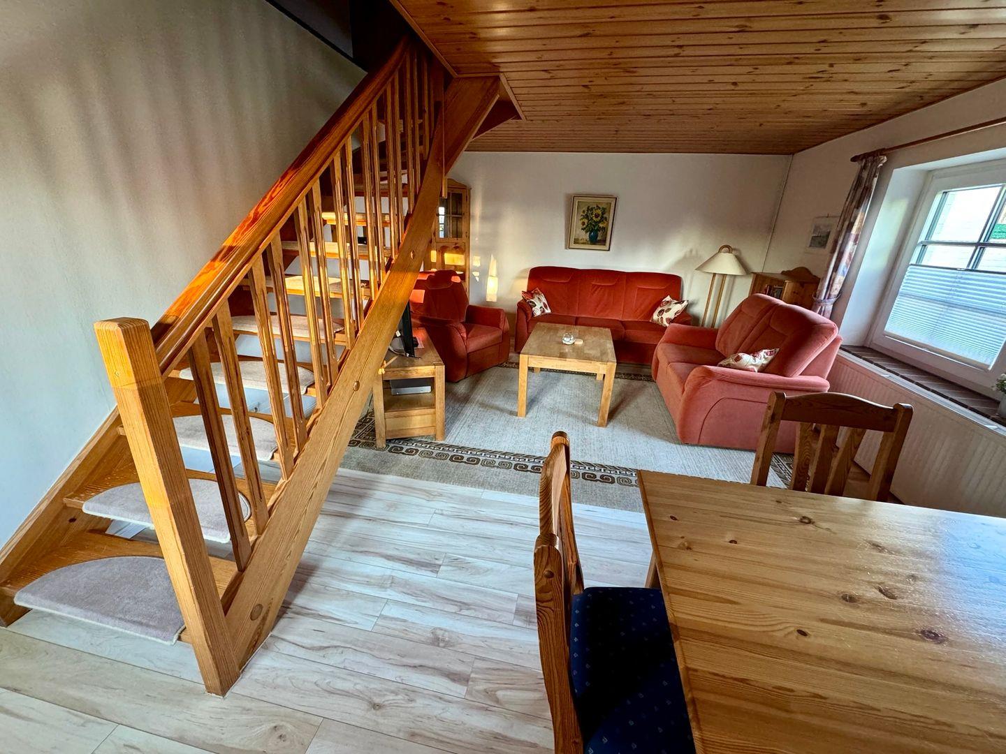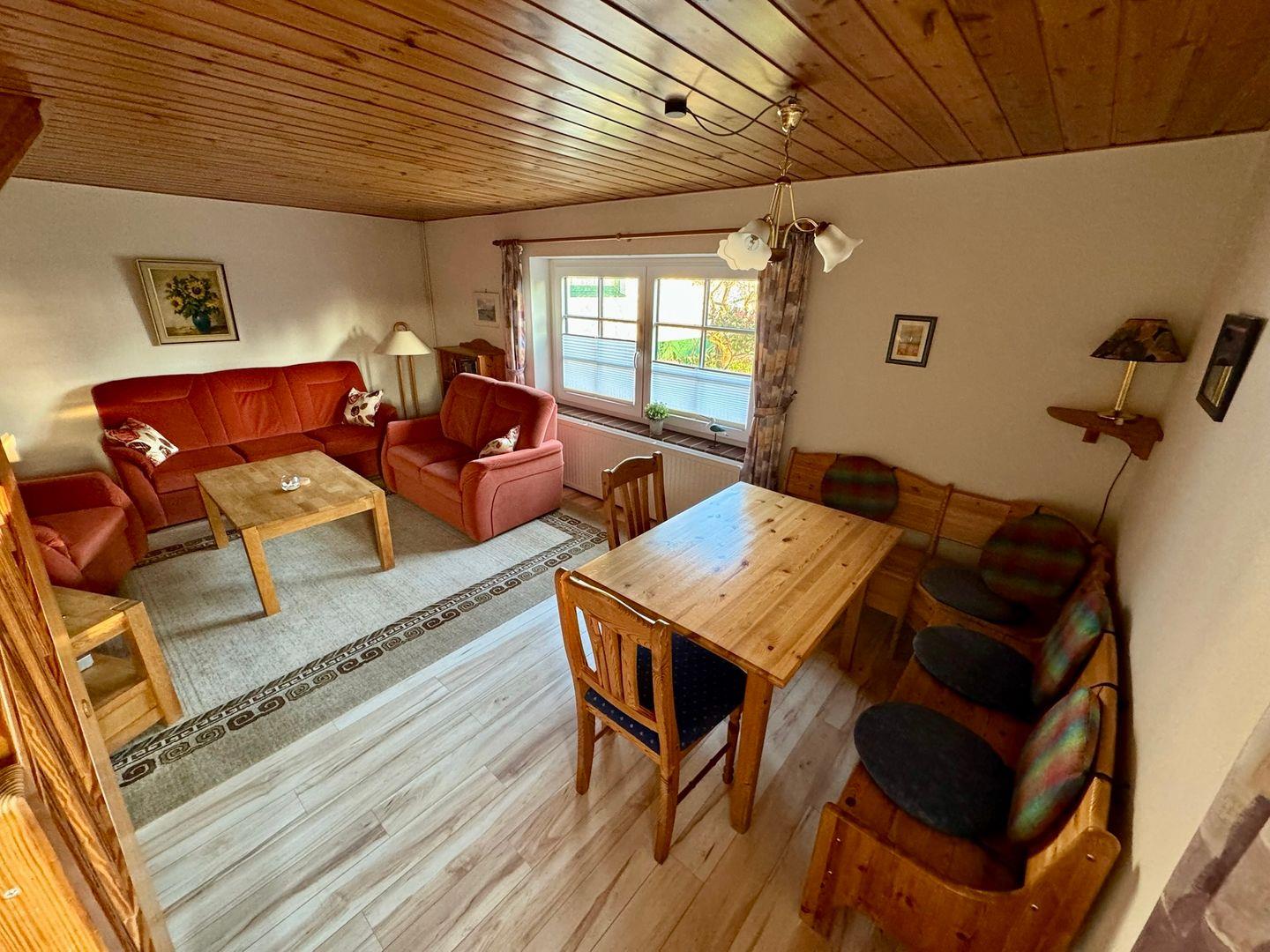 Im gemütlichen Wohnzimmer erwarten Sie eine bequeme Couch, Sessel, Couchtisch sowie ein Fernseher (SAT) und ein Essbereich für gesellige Stunden.