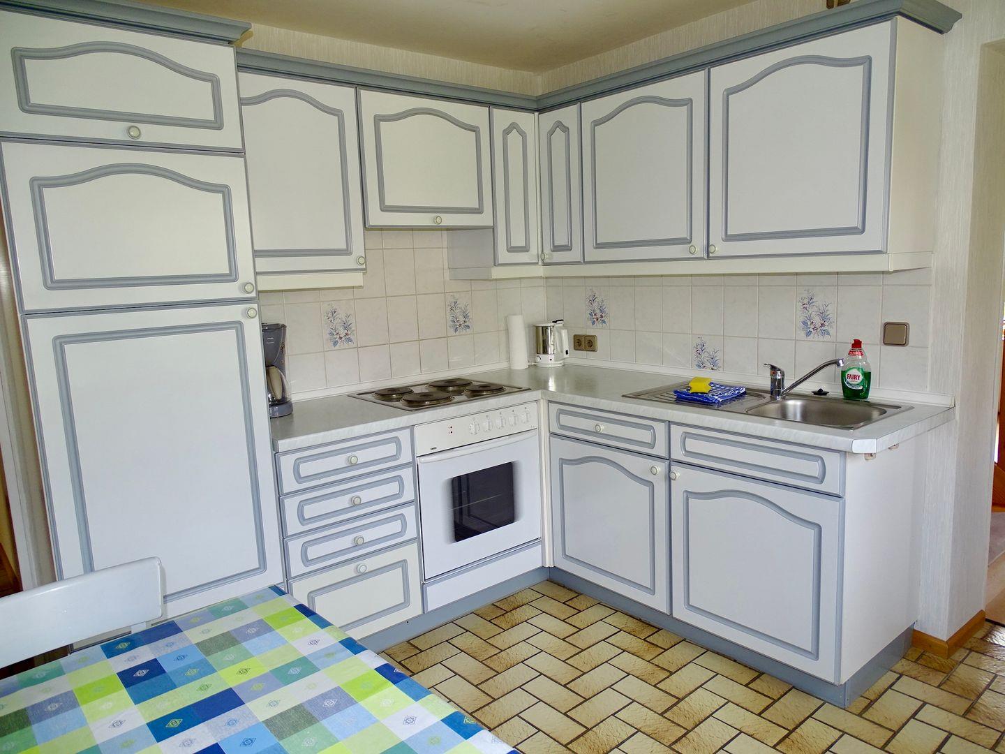 Die voll ausgestattete Küche verfügt über Herd, Backofen, Kühlschrank sowie zahlreiche Kochutensilien, Geschirr und praktische Geräte wie Toaster und Kaffeemaschine – ideal für gemeinsame Mahlzeiten.