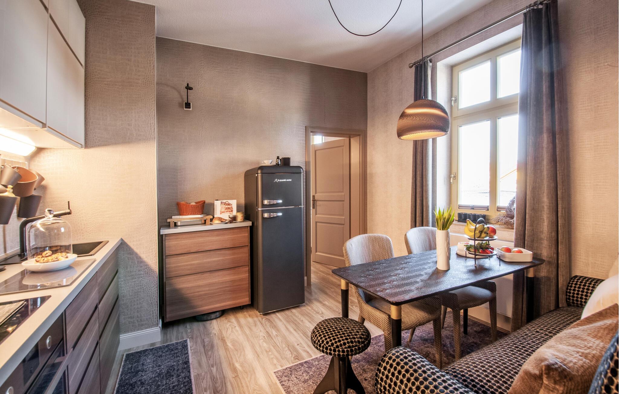 Diese stilvolle Ferienwohnung befindet sich ruhig gelegen im Ortskern von Gernrode in einem aufwendig sanierten Bürgerhaus. Die Wohnung ist mit viel Liebe zum Detail und ausgesuchten Möbeln eingerichtet und eignet sich ideal für ein Paar, das zusammen einige entspannte Tage in schöner Umgebung verbringen möchte. In der gemütlichen Küche mit Essbereich können Sie abends zusammen essen oder gesellige Abende verbringen. Vom Schlafzimmer mit großen Flügeltüren gelangen Sie in das schöne Wohnzimmer mit großem Flatscreen, der auch vom Doppelbett im Schlafzimmer aus zu nutzen ist.
