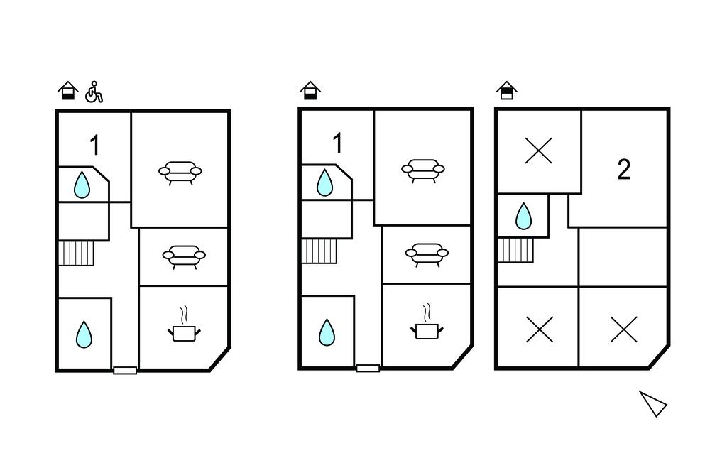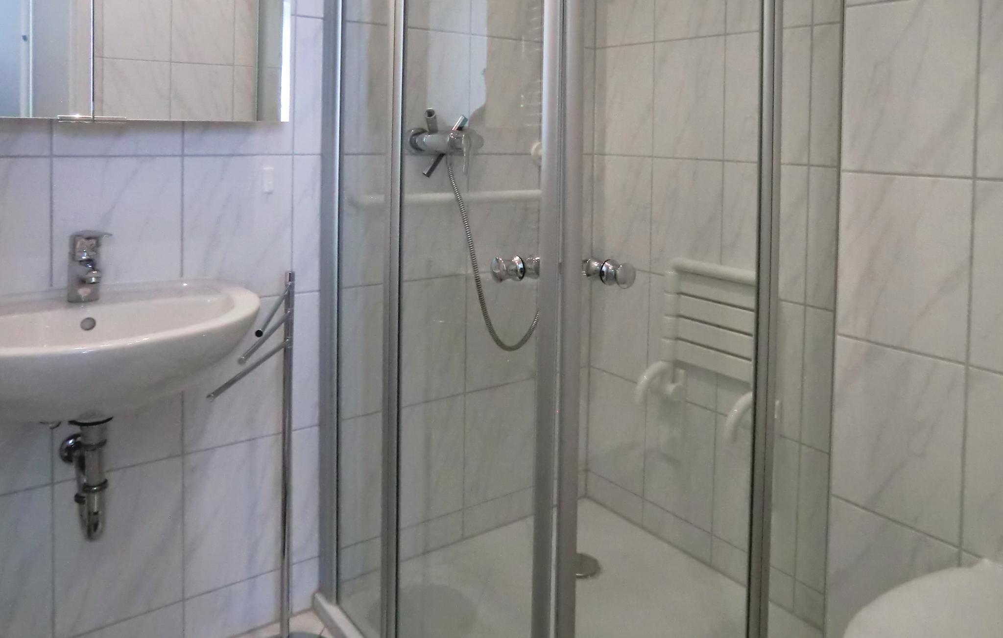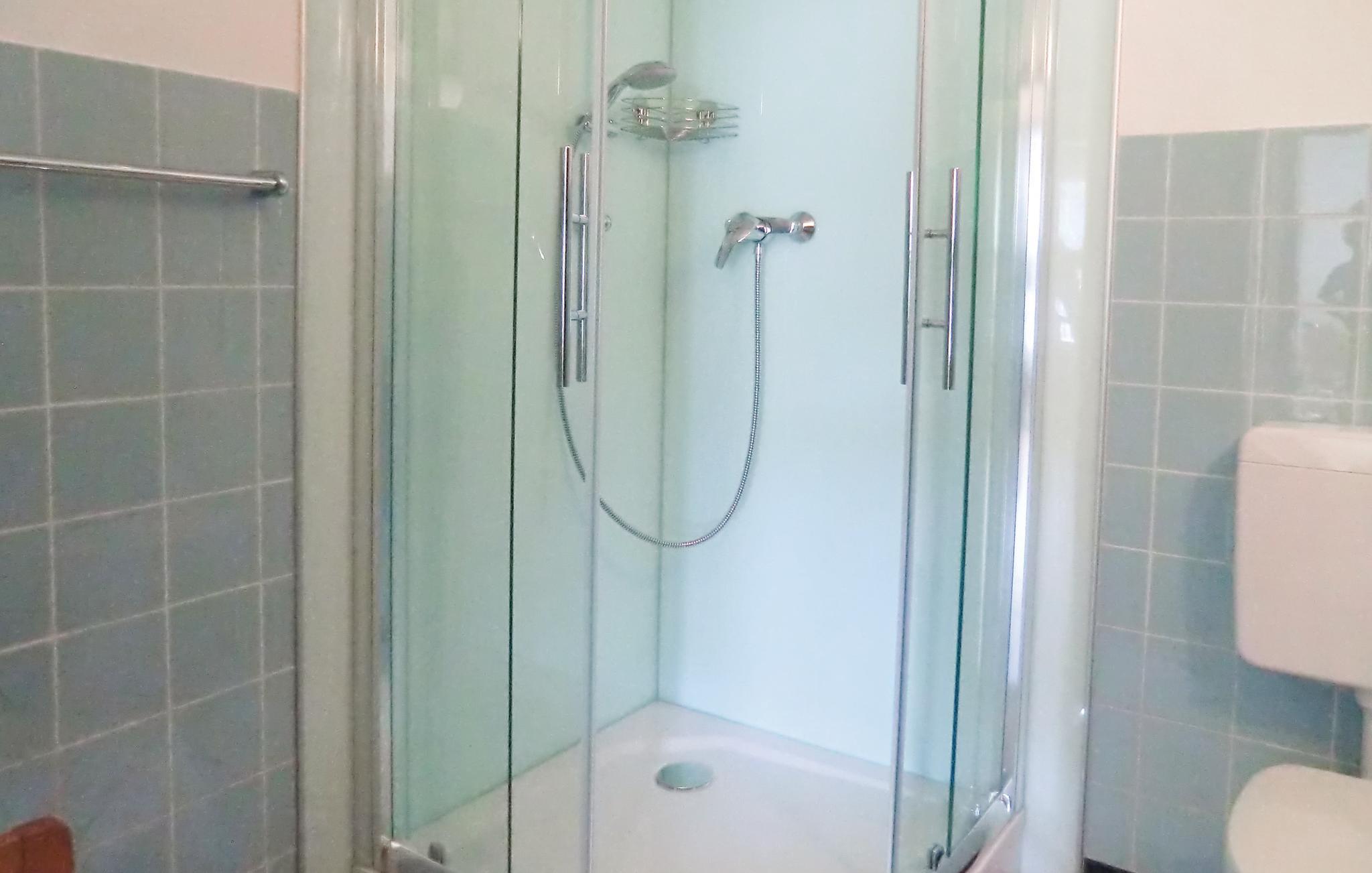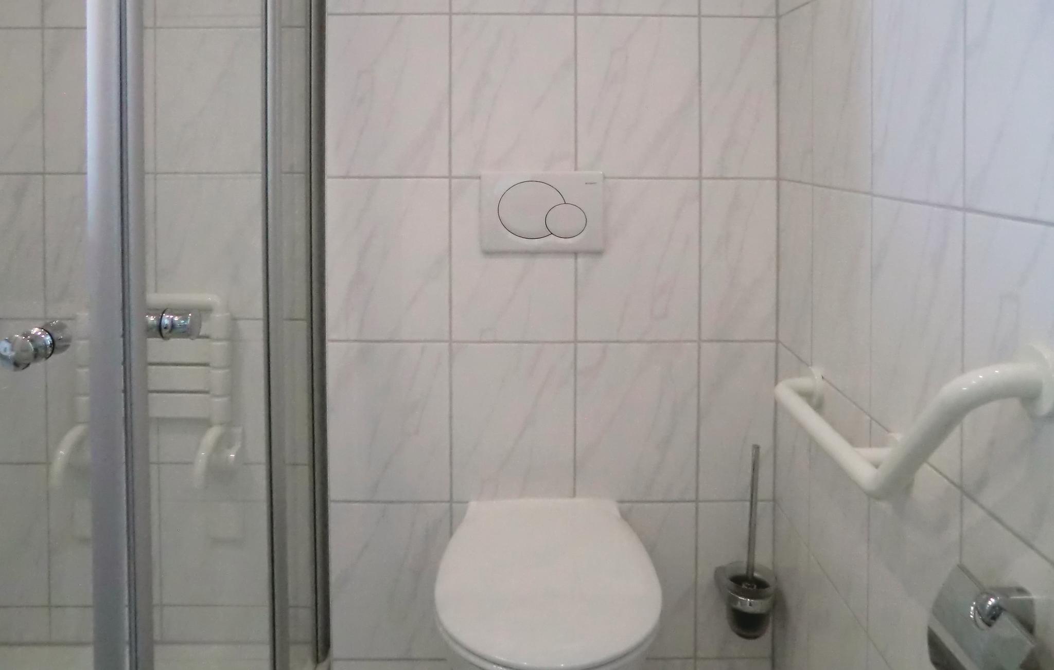 Sie betreten diese Haushälfte durch den Windfang und kommen in die geräumige Diele mit Kaminofen und angrenzendem Abstellraum. Das Wohnzimmer auf der gleichen Ebene hat einen Durchgang zum Esszimmer, von dem aus Sie weiter in die Küche mit Pelletofen gelangen. Unten gibt es außerdem ein Badezimmer mit Wanne und ein Schlafzimmer mit eigenem Duschbad. Wie das Erdgeschoss ist auch dieses Schlafzimmer mit dem Rollstuhl erreichbar. Die Dusche in diesem Zimmer ist mit einem Klappsitz, die Toilette mit einer Stange ausgestattet. Das Bett ist jedoch nicht angepasst.