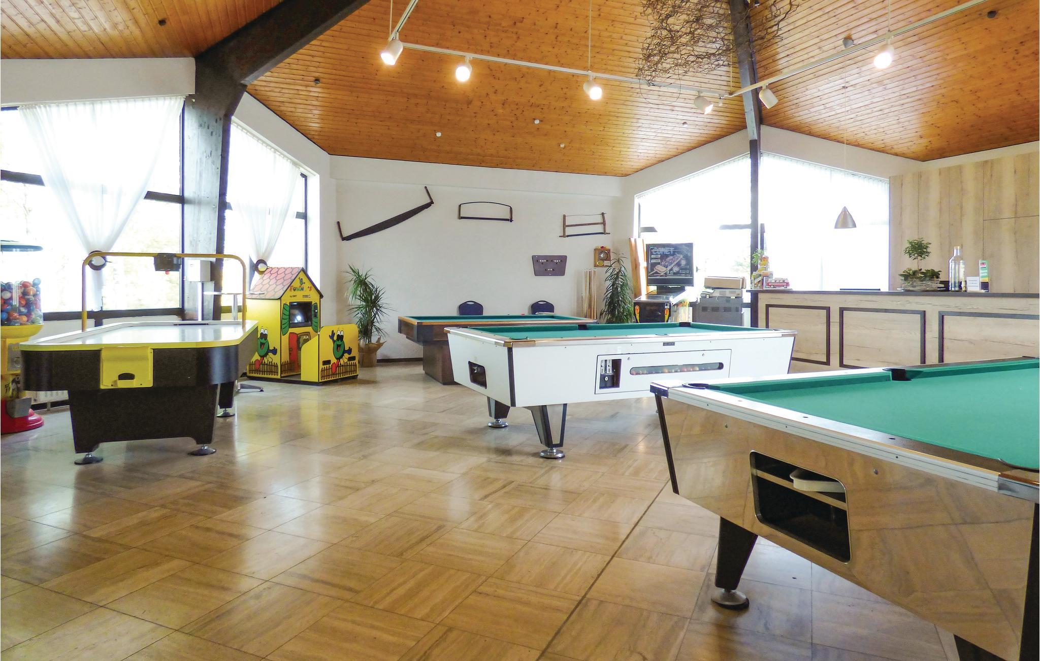 Auch der Park bietet ein vielfältiges Freizeitangebot (gegen Gebühr). Im großen Hallenbad können Sie Ihre Bahnen schwimmen und anschließend in der Sauna die Seele baumeln lassen. Genießen Sie hier einen herrlichen Panoramablick über die Eifellandschaft. So gibt es für die Kleinen einen Streichelzoo, ein Riesen-Schachspiel, Minigolf und einen Tennisplatz. An regnerischen Tagen bieten sich im neu gestalteten Zentralgebäude ein Billard, Air-Hockey und andere Spiele.