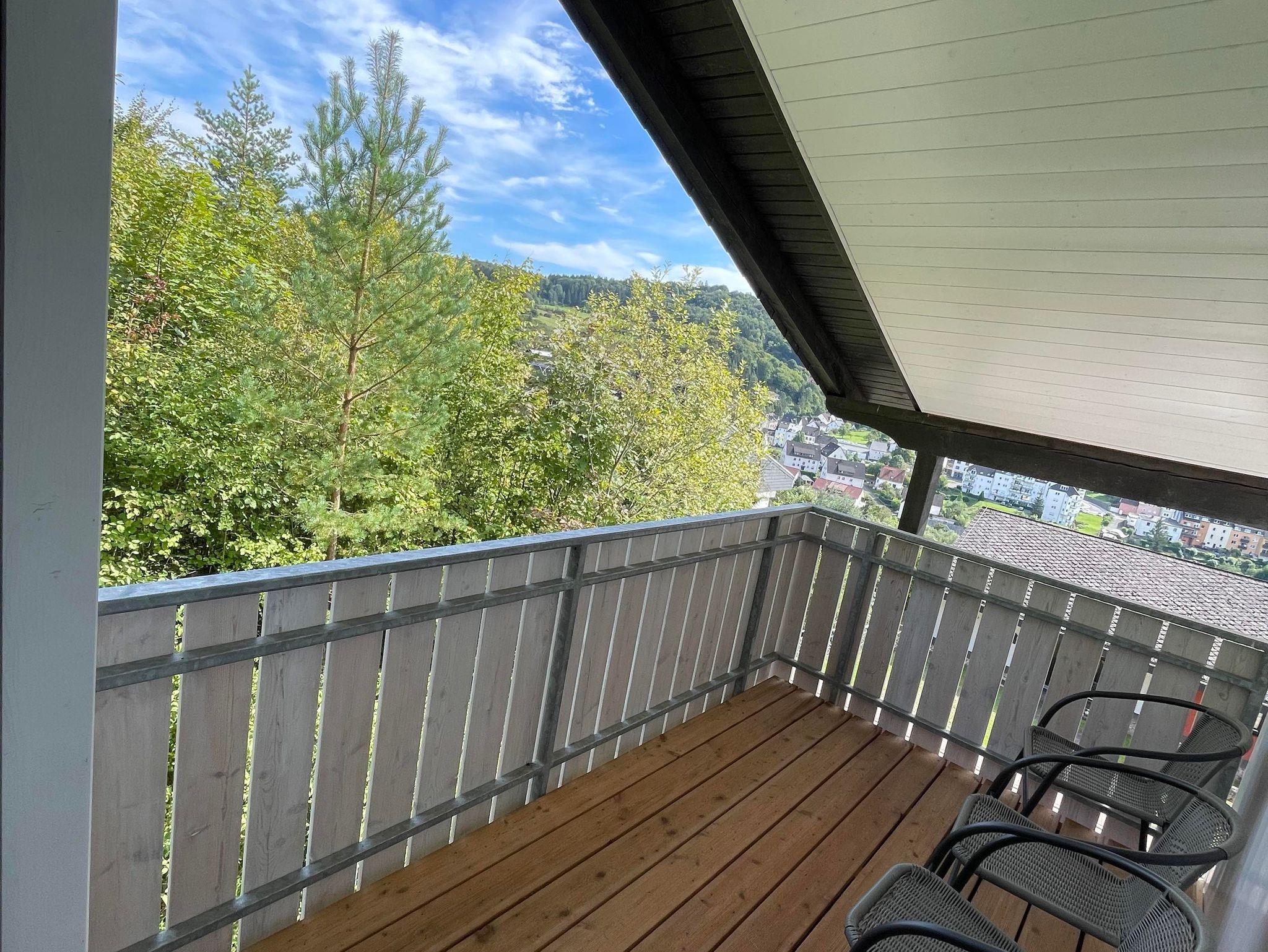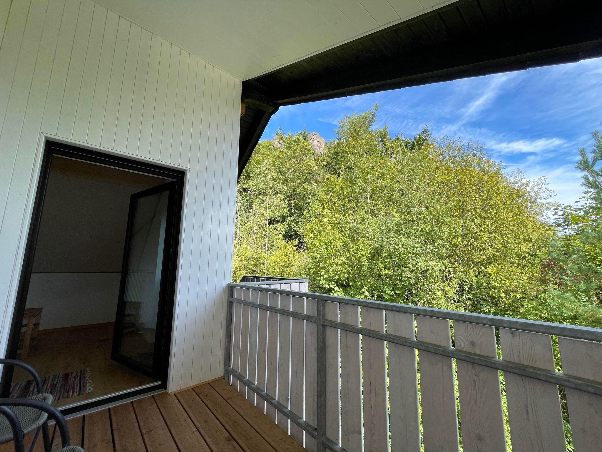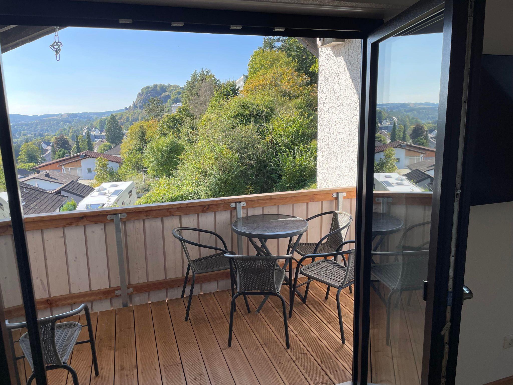 Dreifelsenblick FeWo-Dachgeschoss (>90qm): 2xSchlafzimmer, SZ1 mit 1xDoppelbett (160cmx200cm), SZ2 mit 1xDoppelbett (160cmx200cm), weiteres Doppelbett(140cmx200cm) in Wohnzimmernische, Wohnküche mit Herd/Backofen und Kühlschrank/Gefrierschrankkombie und Geschirrspüler, 2xBalkons (1xWestbalkon und 1xOstbalkon), Badezimmer mit Dusche und Badewanne, separates WC, 2xFernseher in Wohnküche und SZ1, insgesamt geeignet für bis zu 6xPersonen (empfohlen für bis zu 4xErwachsene, z.B gut geeignet für 4xErwachsene +/-Kinder oder 2xErwachsene und 4xKinder), Dachgeschosswohnung gut geeignet für Familien mit Kindern jedoch auf Grund steiler Treppe weniger geeignet für Kleinkindern/Babys/Kinderwagen/Senioren, in Dachgeschosswohnung keine Hunde/Haustiere gestattet (Hunde sind nur in FeWo-Erdgeschoss gestattet), Nichtraucherferienwohnung, Rauchen in FeWo-Dachgeschoss wegen Feuergefahr streng verboten und daher Rauchen und offenes Feuer weder gestattet in Wohnung noch auf den Balkons der FeWo-Dachgeschoss