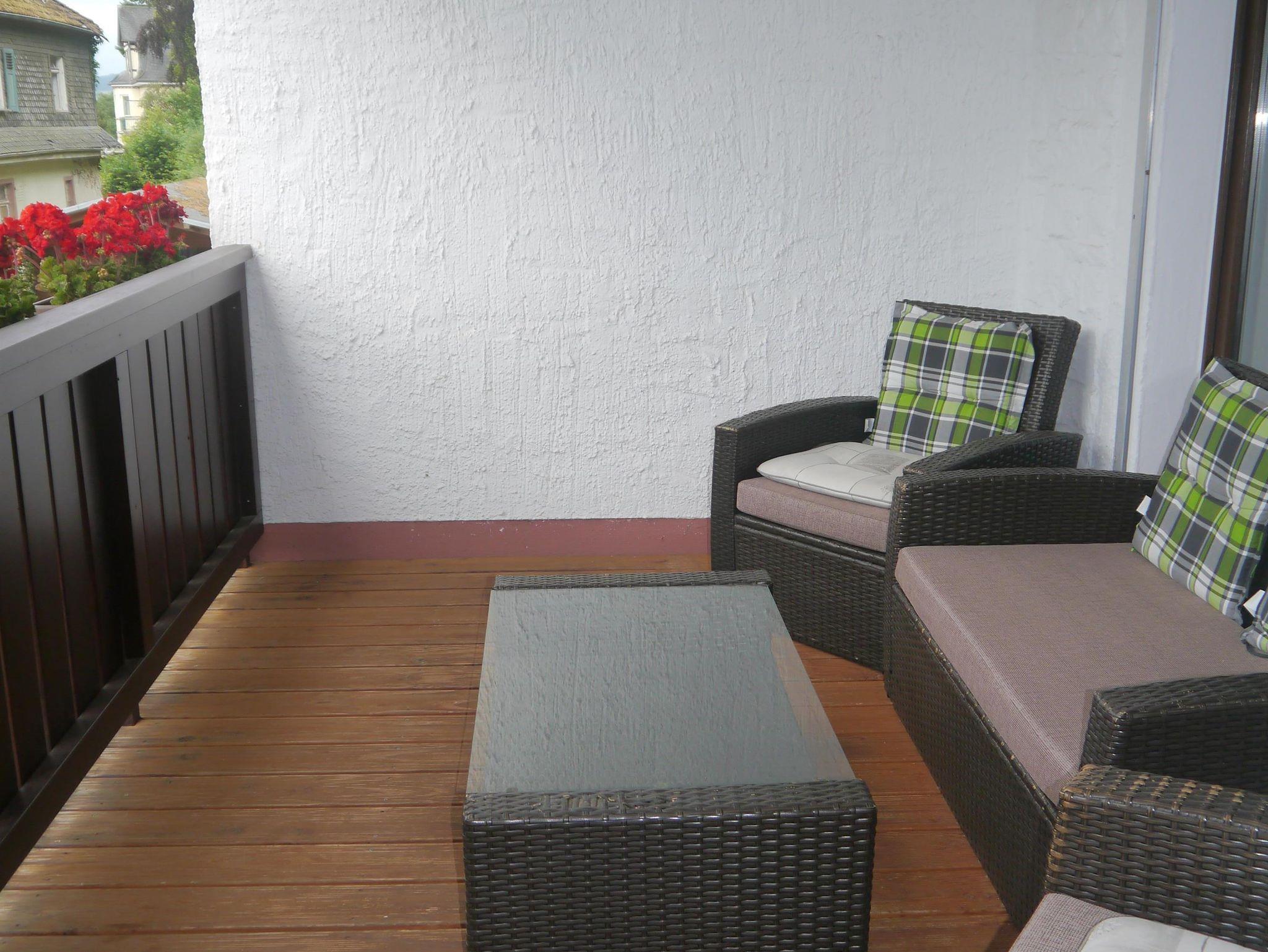 Das Appartement verfügt über zwei Doppelzimmer und ein Wohnzimmer mit windgeschütztem Südbalkon und tollem Blick auf die Brunnenstadt. Das Badezimmer verfügt über Dusche/WC.