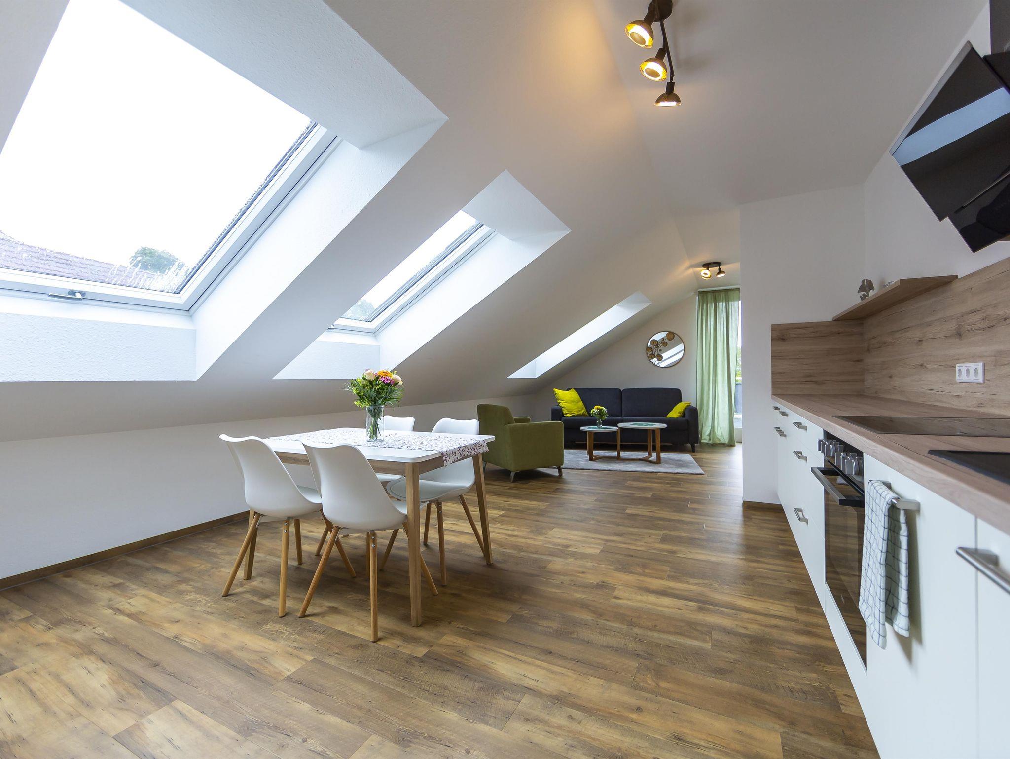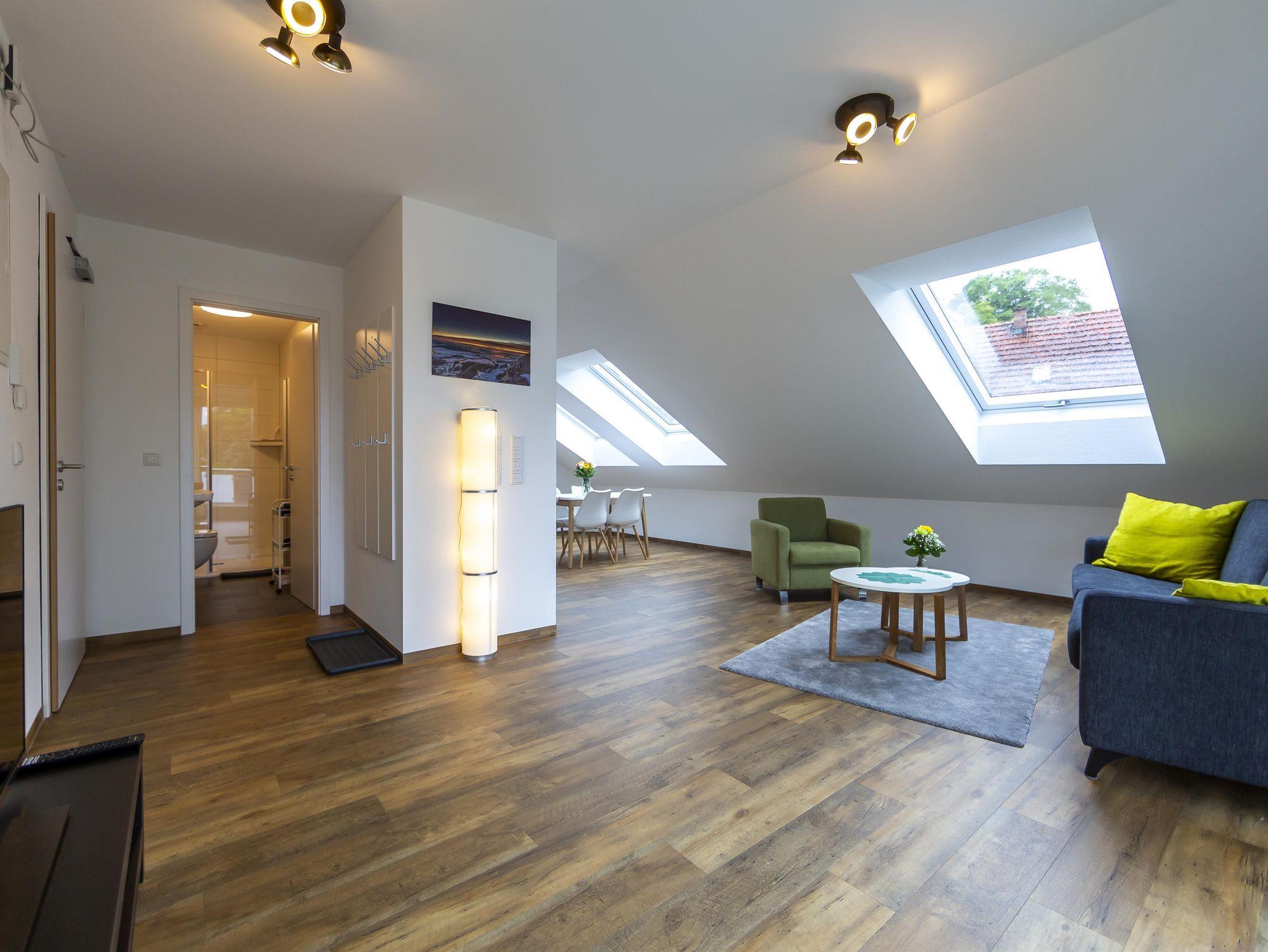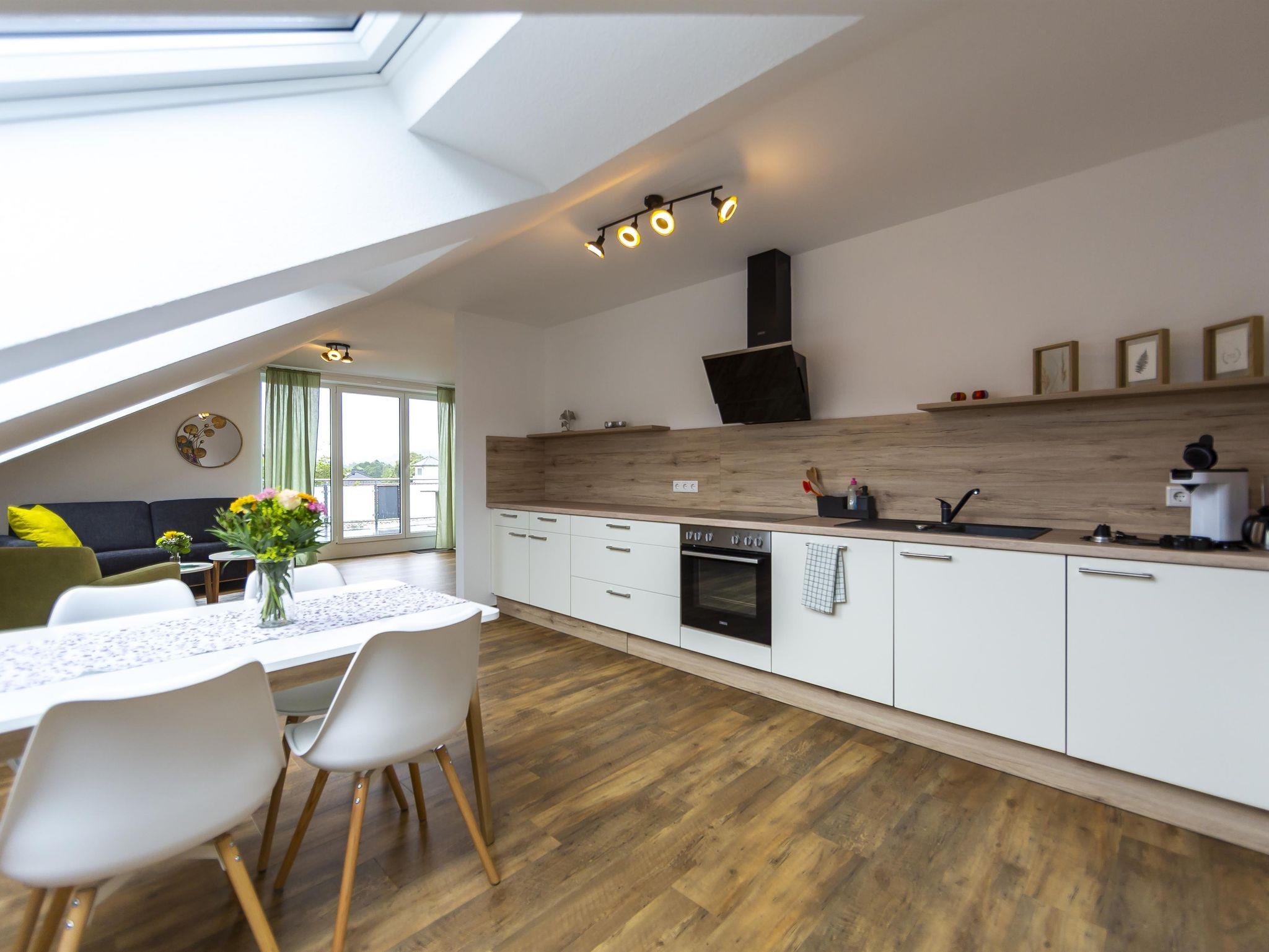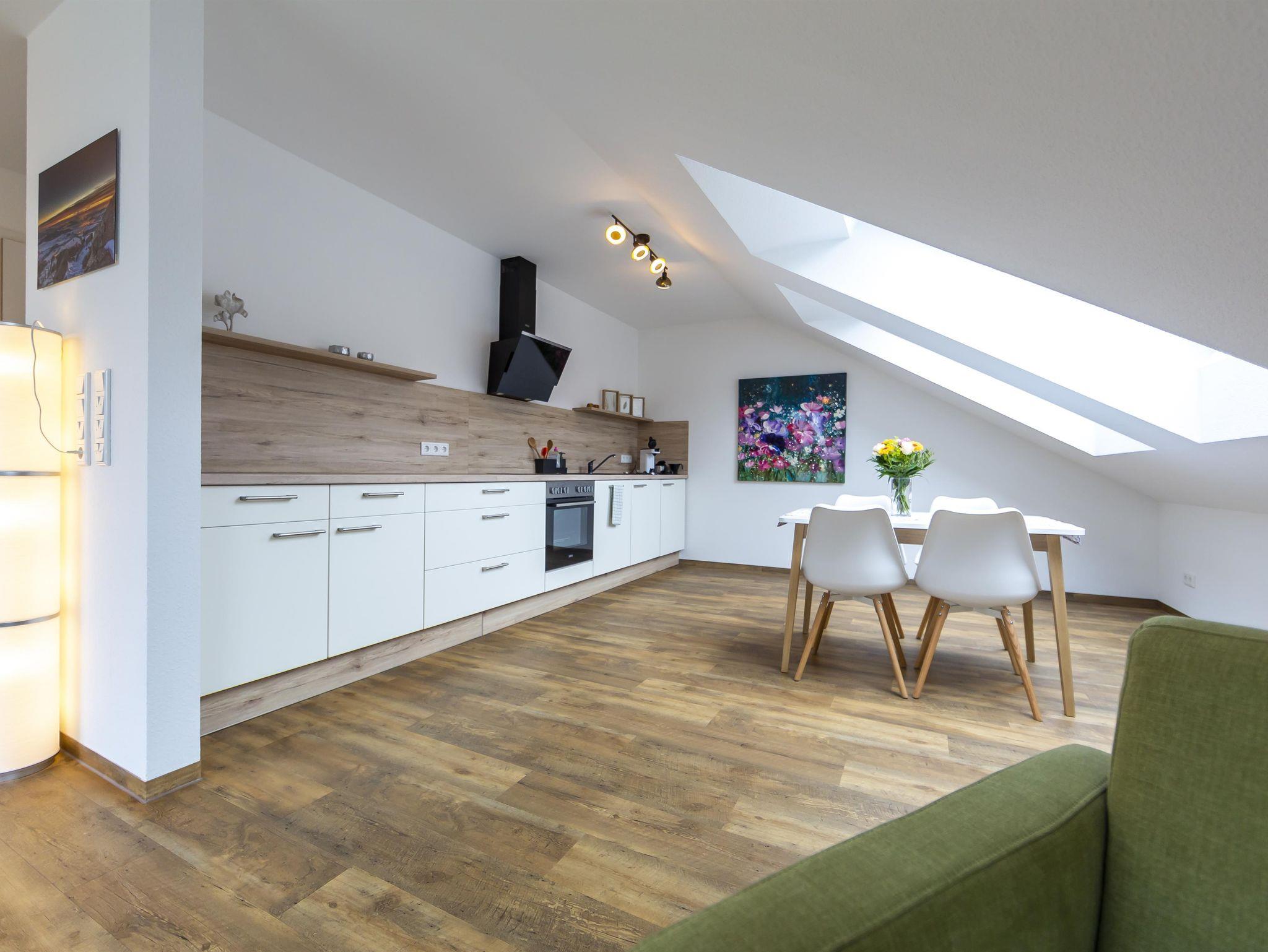 Willkommen in der geräumigen, sonnendurchfluteten 50 m² Unterkunft mit großer Dachterrasse und Blick auf die Rhön. Gemütlich mit Dachschrägen, ausgestattet mit 1 x Boxspringbett, komfortablem Schlafsofa. Küche, Essbereich, Wohnzimmer mit 43-Zoll TV. Badezimmer, Herd, Spülmaschine, Kaffeemaschine, Wasserkocher, Toaster, Backofen und Geschirr für 6 Personen vorrhanden. Aufzug für Bequemlichkeit.