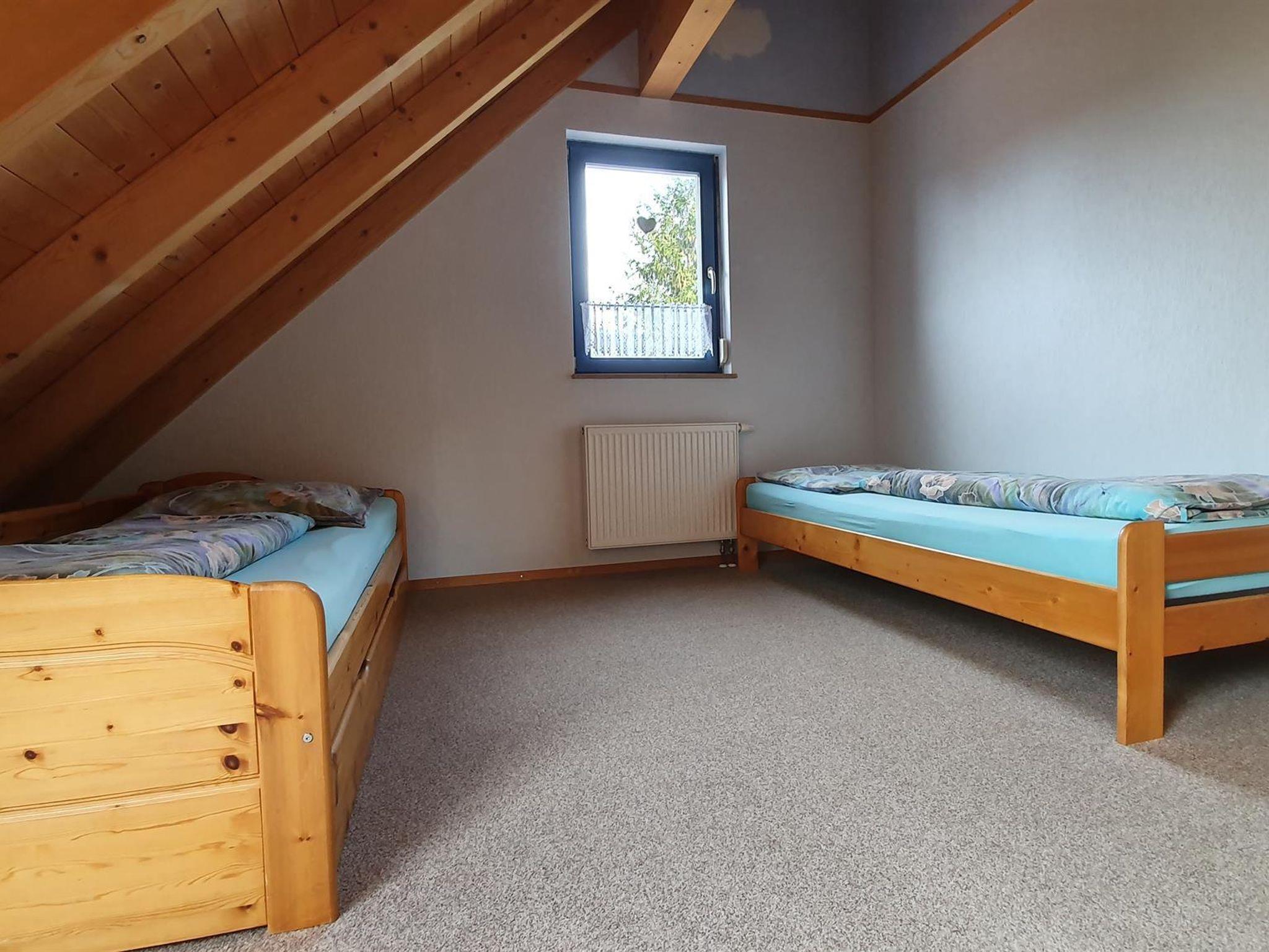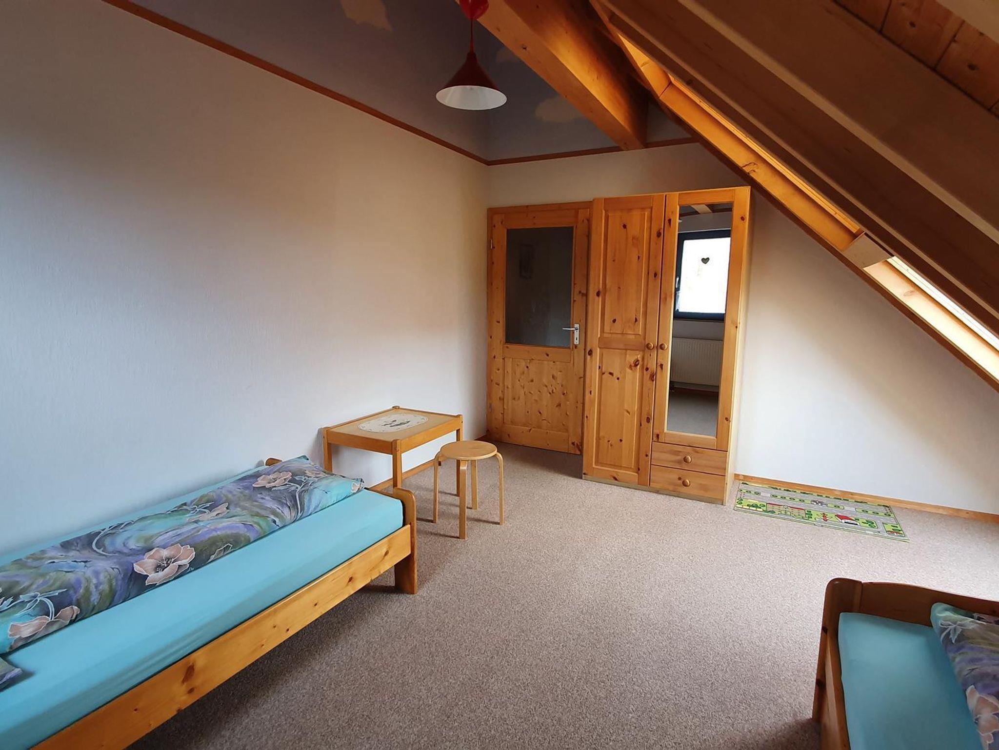 • Ein Schlafzimmer im Obergeschoss mit zwei Einzelbetten