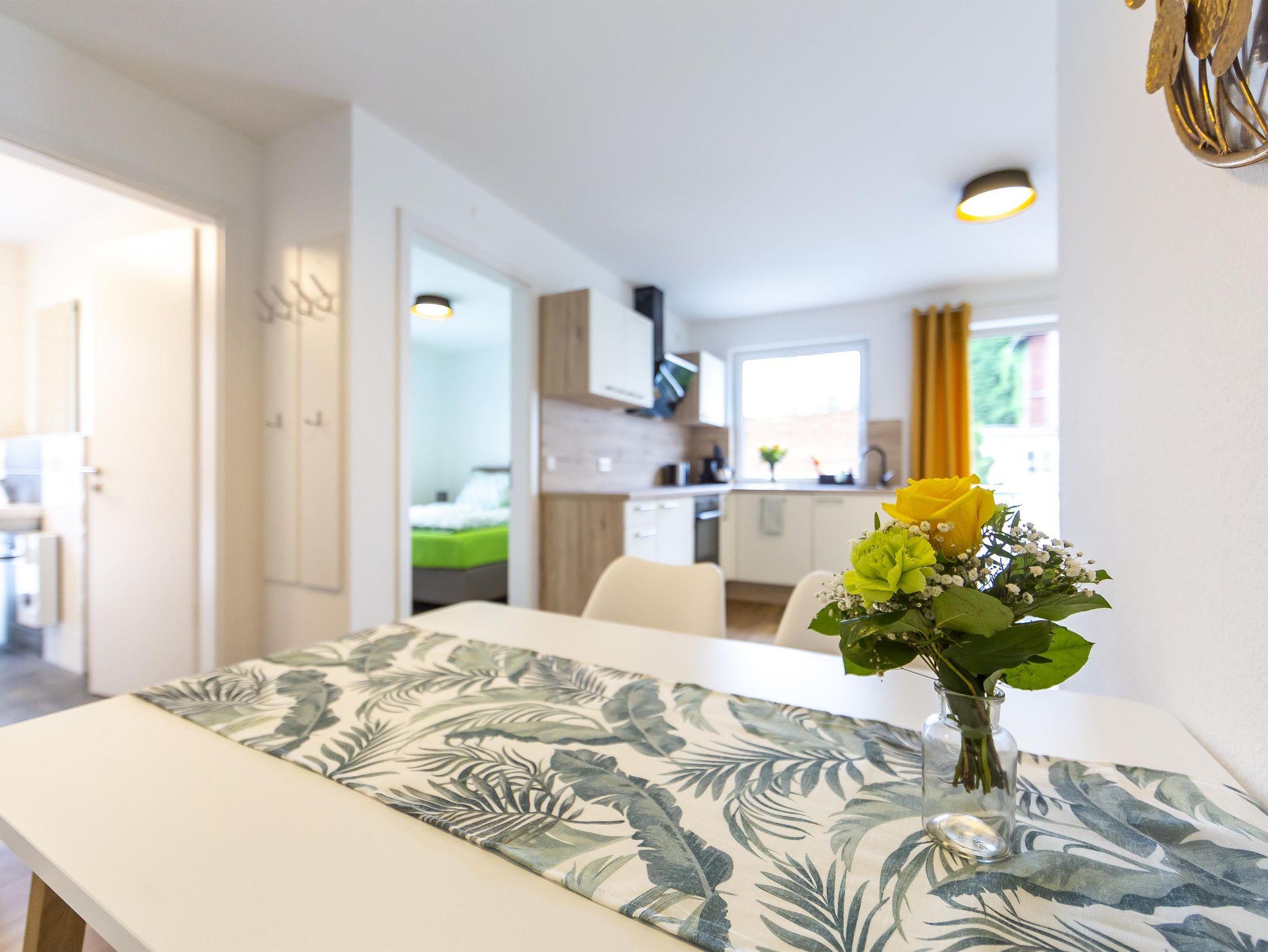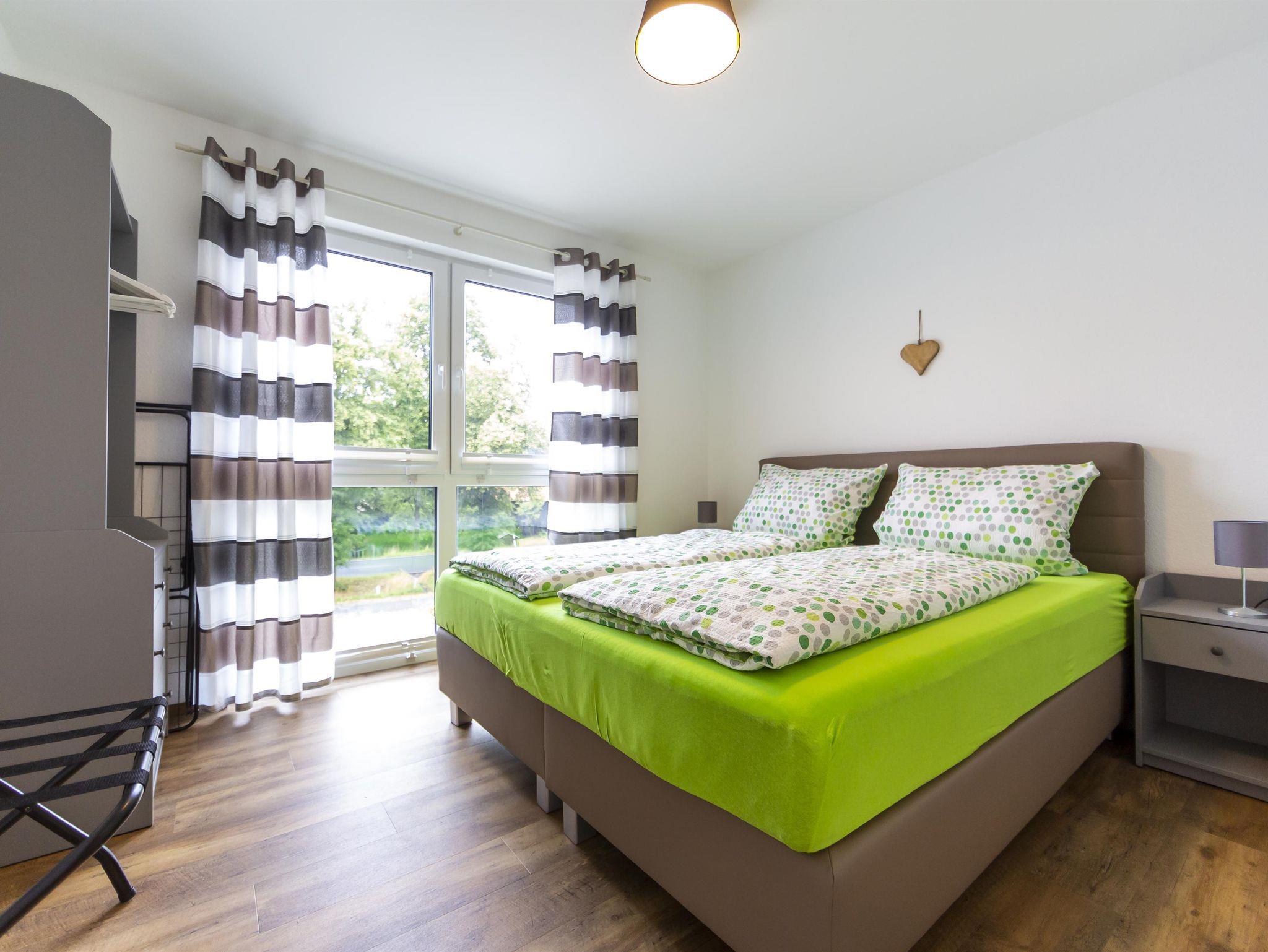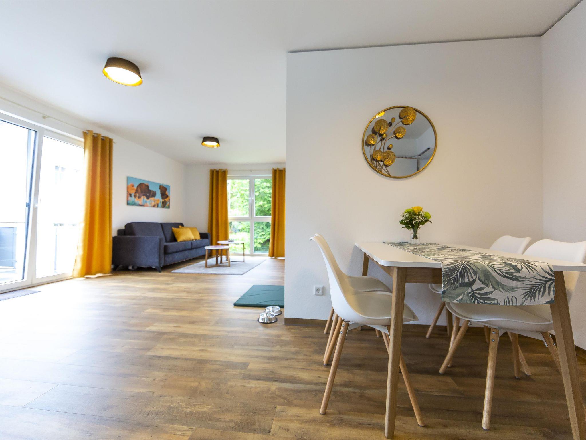 Geräumige 46 m² Unterkunft für 4 Personen, Schlafzimmerblick auf Kirche, Balkonblick auf Gersfeld. Lichtdurchflutet, mit Boxspringbett (2 Personen) und komfortablem Schlafsofa (2 Personen). Gut ausgestattete Küche mit Herd, Spülmaschine, Kaffeemaschine, Wasserkocher, Toaster, Backofen. Badezimmer mit Dusche, Föhn vorhanden. Wohnzimmer mit 43-Zoll TV, elektrische Rollläden. Geschirr für 6 Personen. Aufzug verfügbar.