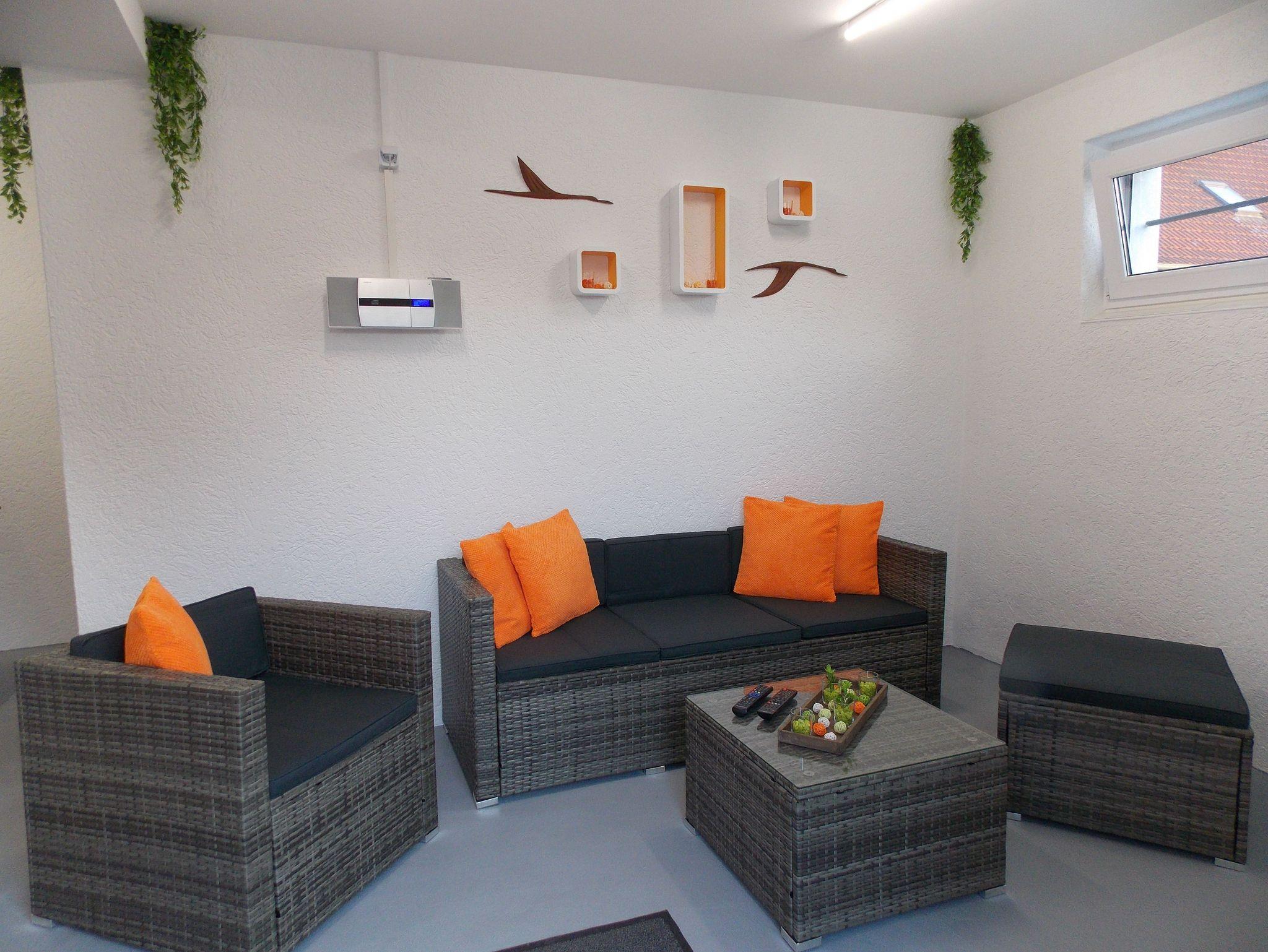- Wohn-, Koch- und Essbereich mit Küchenzeile, Couch und Klimaanlage