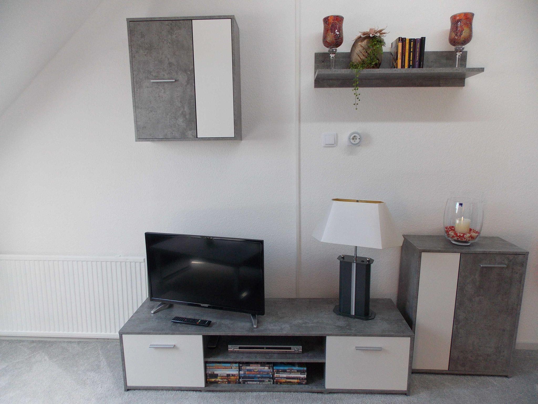 Ausstattung Wohnzimmer: Schlafcouch (Aufbettungsmöglichkeit, Utensilien und Bettwäsche zur Aufbettung sind vorhanden), moderne Wohnwand, Couchtisch, Sonnen- und Insektenschutzplissee, Ventilator, Sat-TV und -Radio, DVD-Player mit einer DVD-Auswahl verschiedener Filmgenre, Bücher sowie eine kleine Gesellschaftsspielesammlung