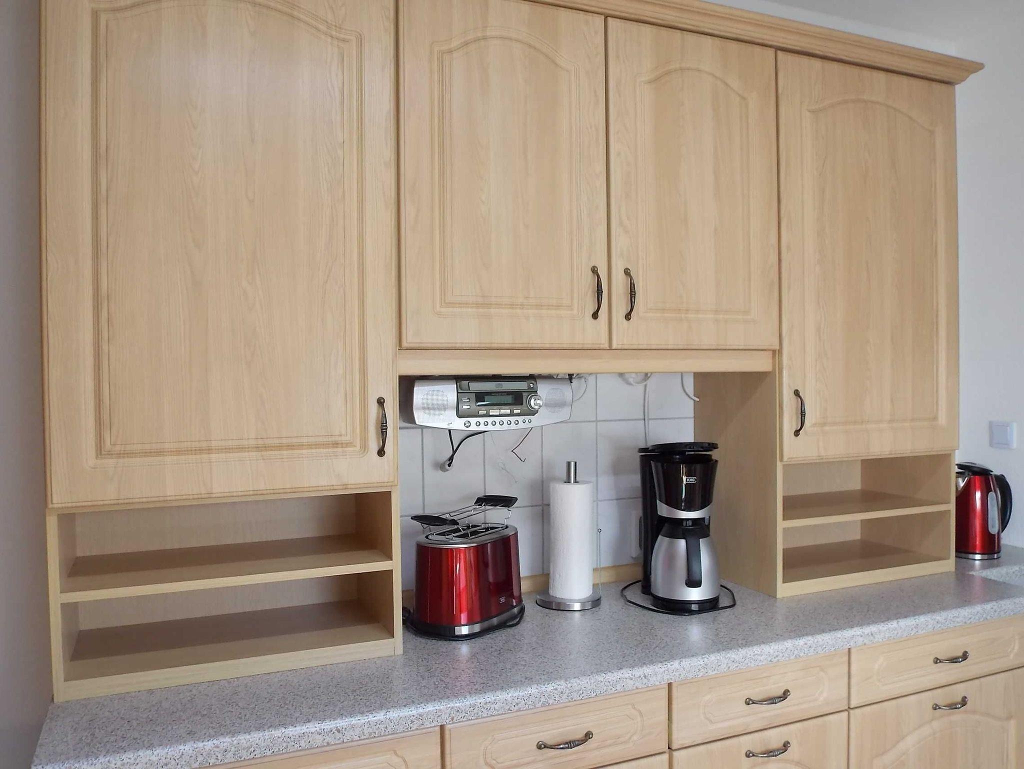Ausstattung Landhausküche: Essplatz, Kühlschrank, Tiefkühlschrank, Kaffeemaschine, Toaster, Wasserkocher, Küchenradio, Einbauspüle, E-Herd, Geschirrspüler, Abfallbehältnisse zur Mülltrennung, Sonnen- und Insektenschutzplissee, Dinge für den täglichen Hausgebrauch (Töpfe, Pfannen, Geschirr, Besteck, Schneidbretter, Staubsauger etc.), Küchenwäsche (Erstausstattung) ist vorhanden und inklusive.