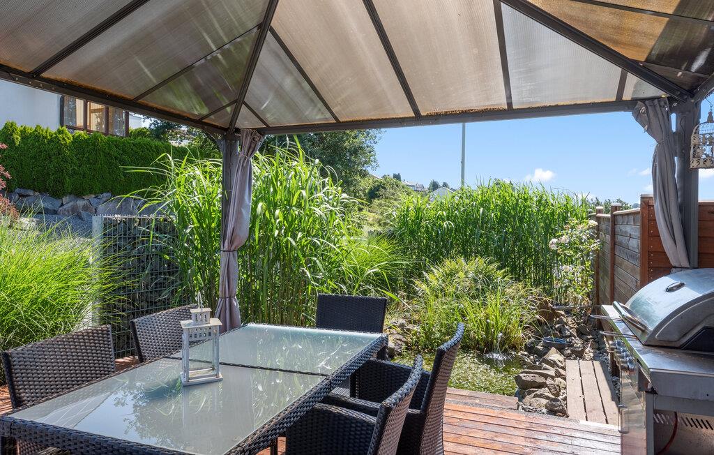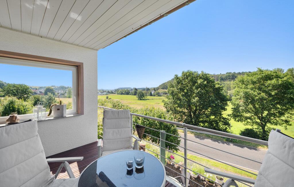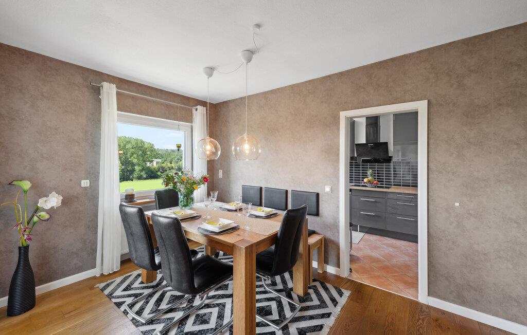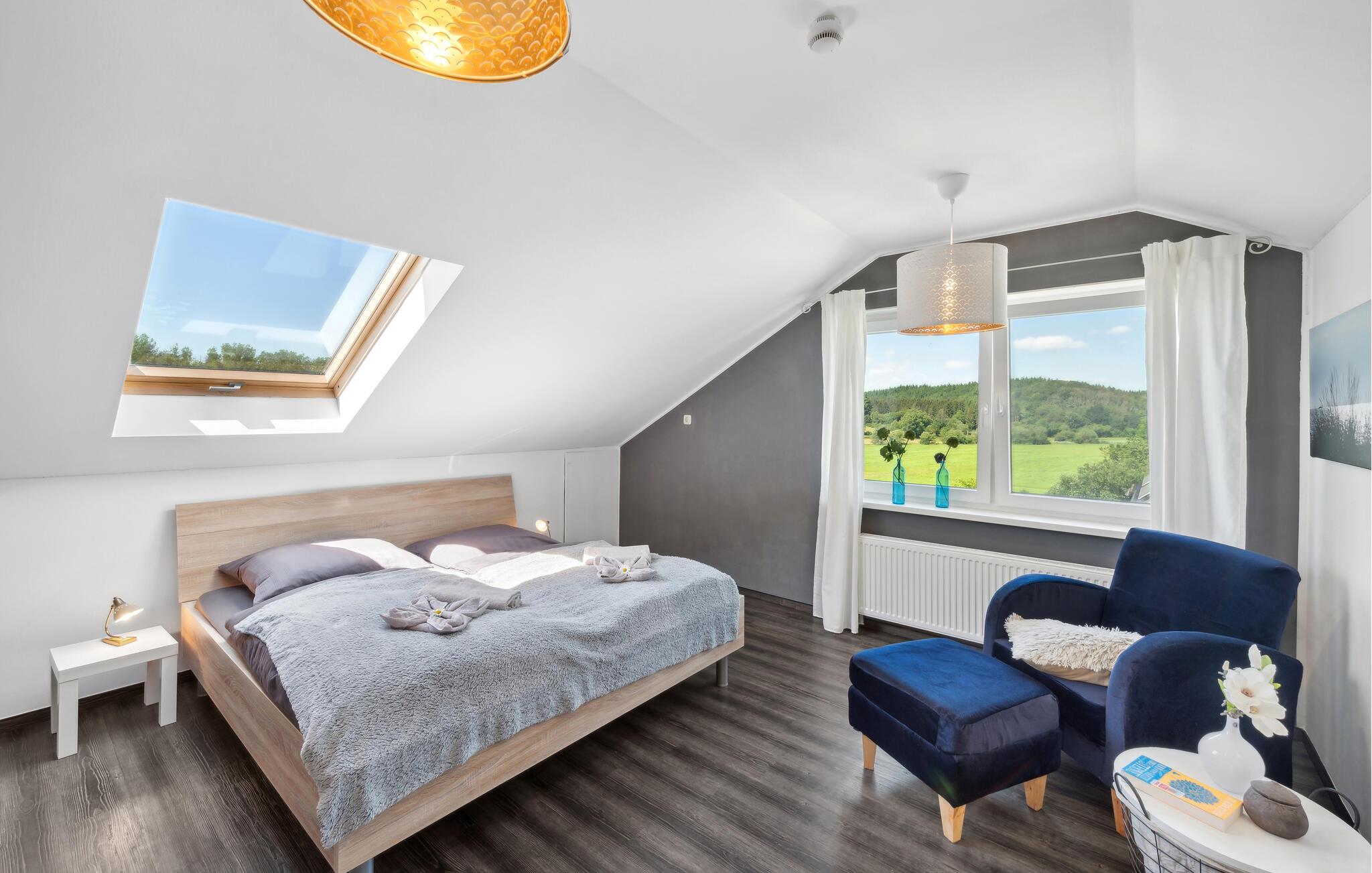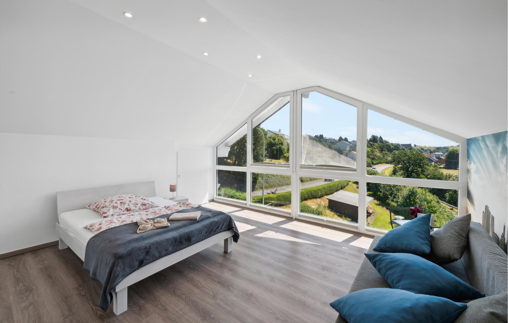 Diese geräumige und komfortable Ferienwohnung in Gillenfeld lädt Sie zu einem erholsamen Urlaub inmitten der idyllischen Eifel ein. Die helle Einrichtung, kombiniert mit modernem Design, schafft eine behagliche Atmosphäre, in der Sie sich sofort wohlfühlen werden. Genießen Sie das große Platzangebot und finden Ihren Lieblingsplatz, egal ob beim Filmsehen im Wohnzimmer, Spielen am Esstisch oder beim Aufwachen im Bett mit Panoramablick auf die Landschaft.
