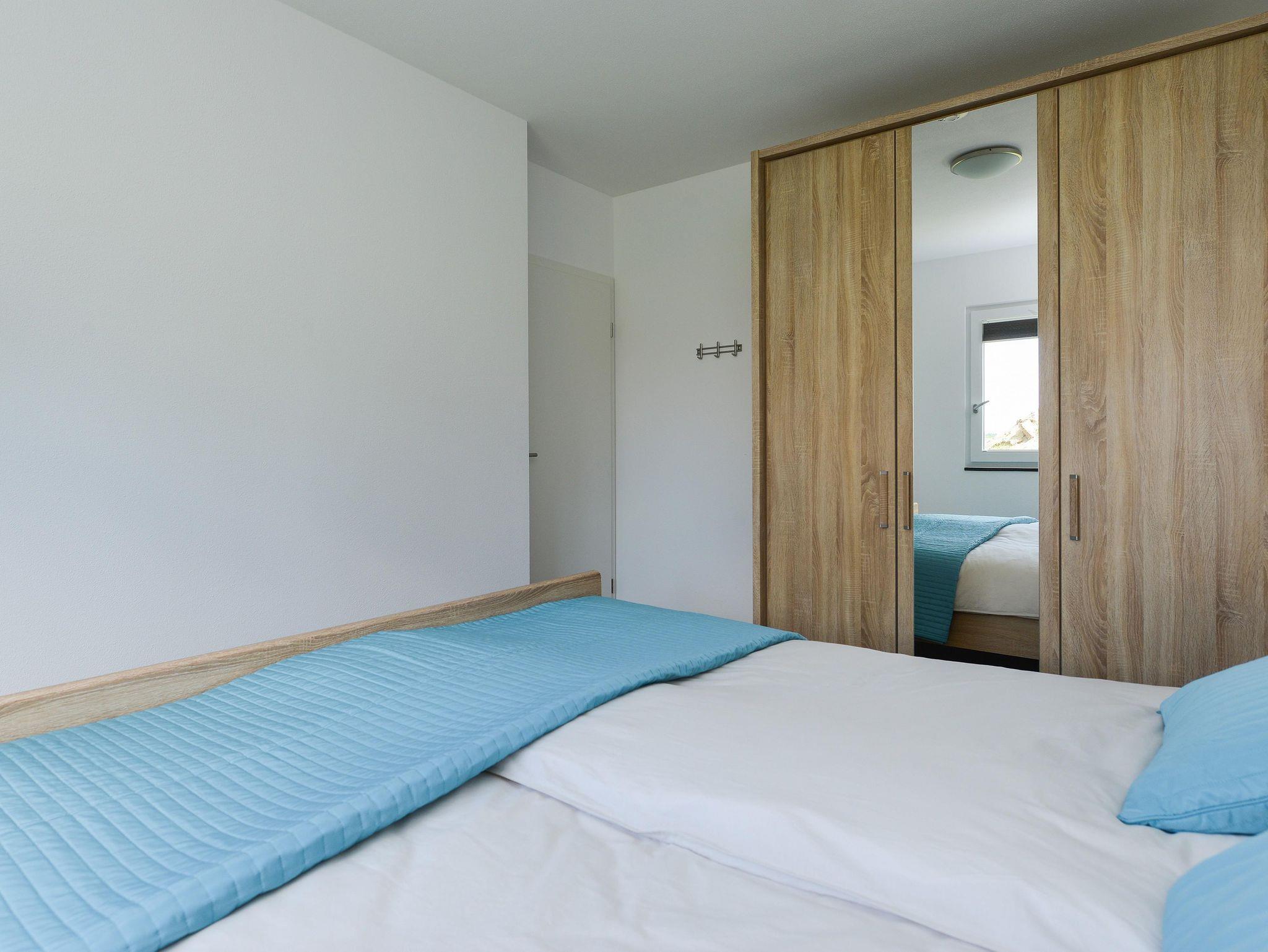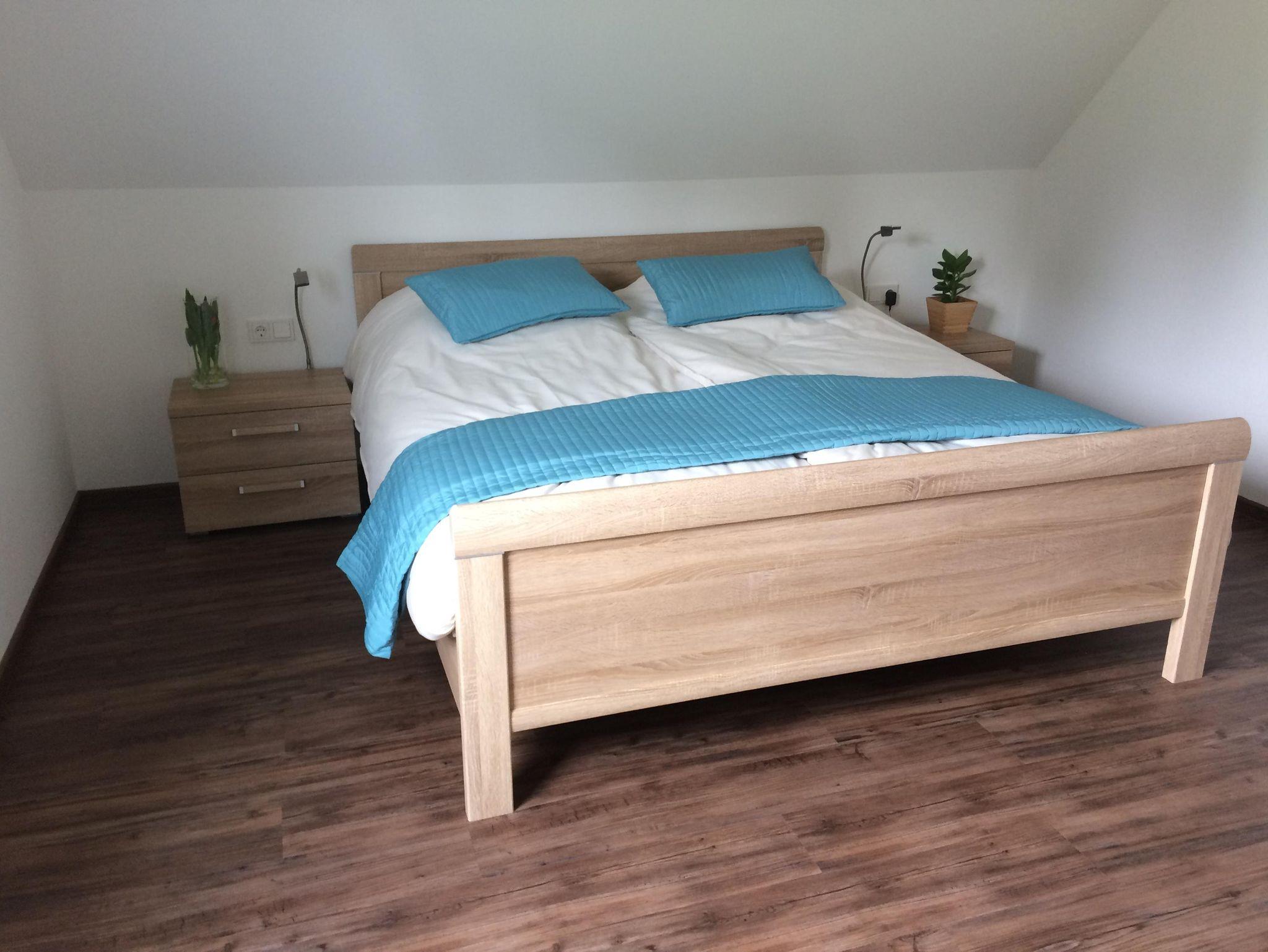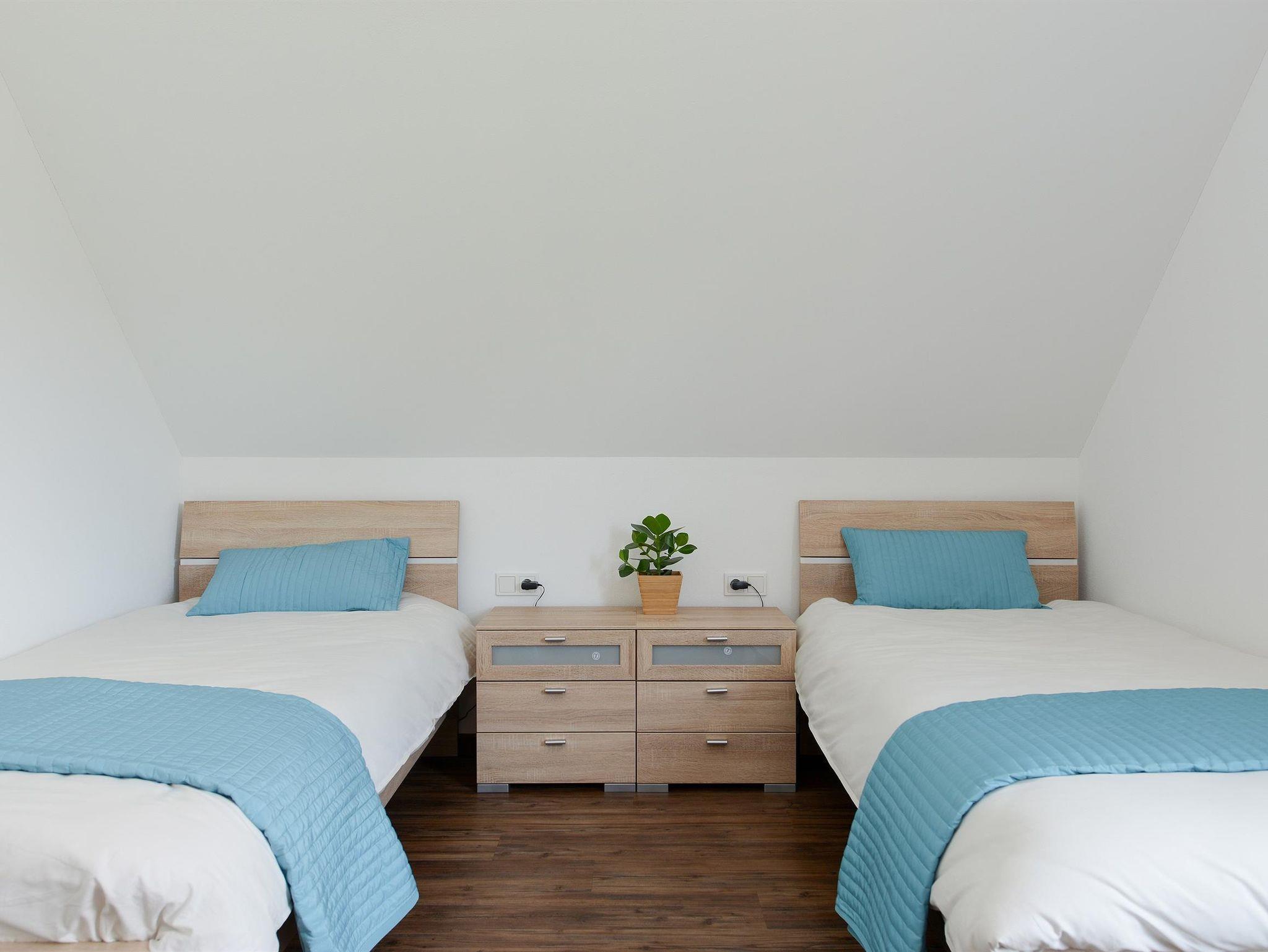 Das Badezimmer im Erdgeschoss verfügt über eine Toilette, ein Doppelwaschbecken und eine geräumige Duschkabine. Das Schlafzimmer im Erdgeschoss verfügt über ein geräumiges Doppelbett und einen großen Kleiderschrank mit Spiegel. Im ersten Stock befinden sich zwei Schlafzimmer, eines mit Doppelbett, Kleiderschrank und Sitzecke mit einem Sessel. Das dritte Schlafzimmer hat zwei Einzelbetten, einen Kleiderschrank und eine Sitzgelegenheit mit einem Sessel.