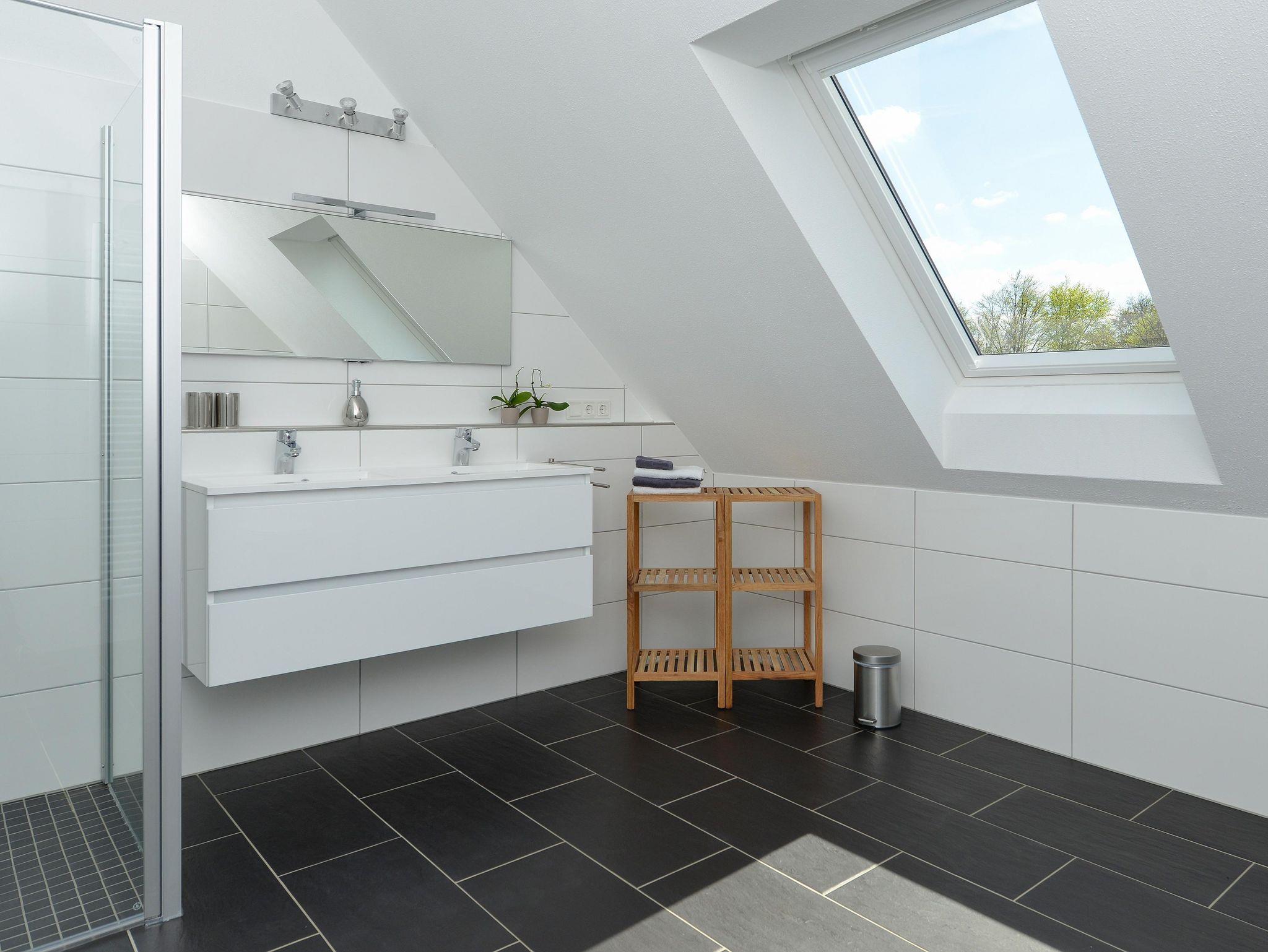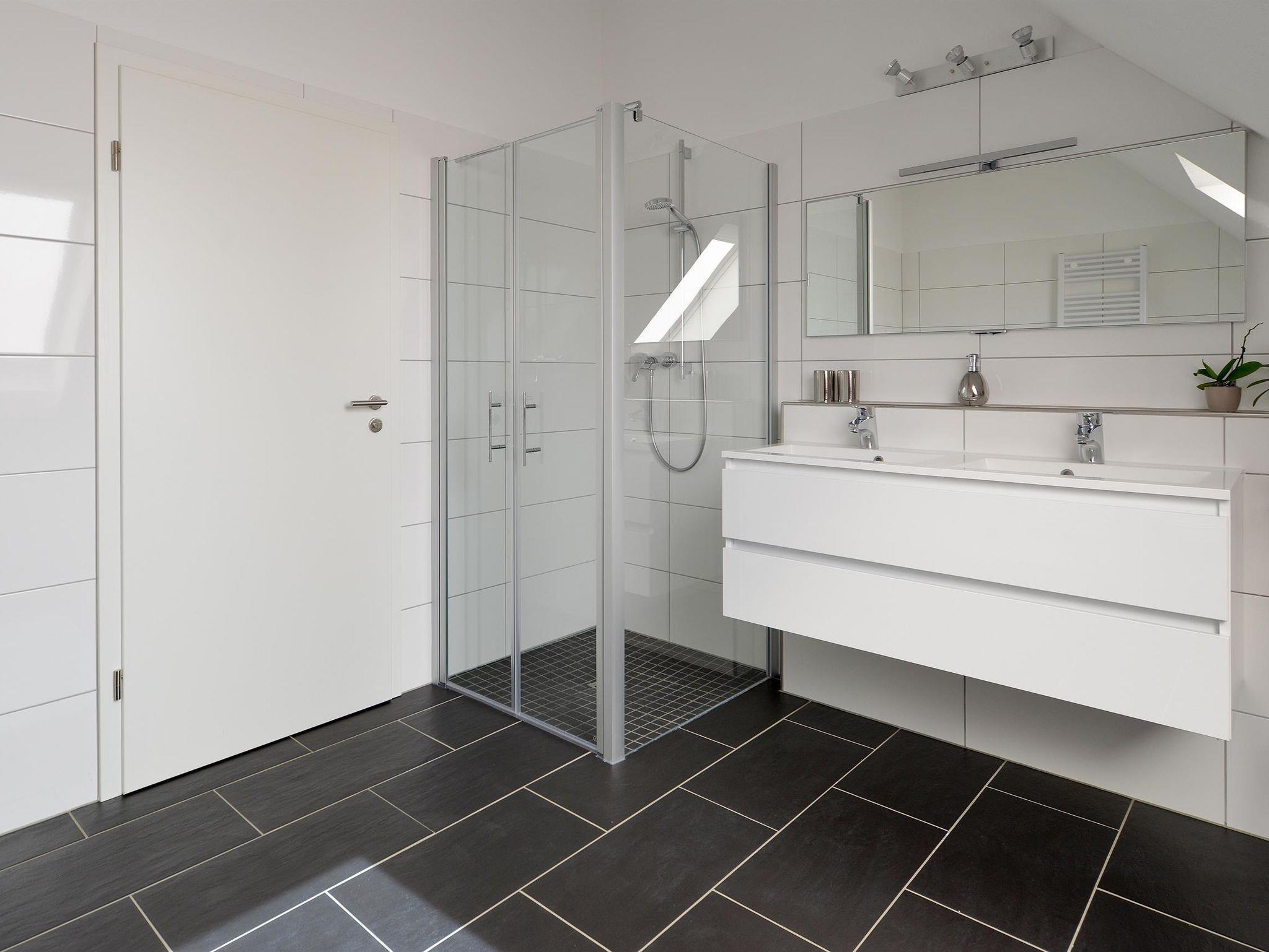 Das Badezimmer im ersten Stock befindet sich zwischen den beiden Schlafzimmern und ist sehr geräumig. In diesem Badezimmer befindet sich auch eine Toilette, sowie zwei geräumige Waschbecken und eine Duschkabine mit Regendusche. Es gibt auch eine schöne Infrarotsauna in diesem Badezimmer.