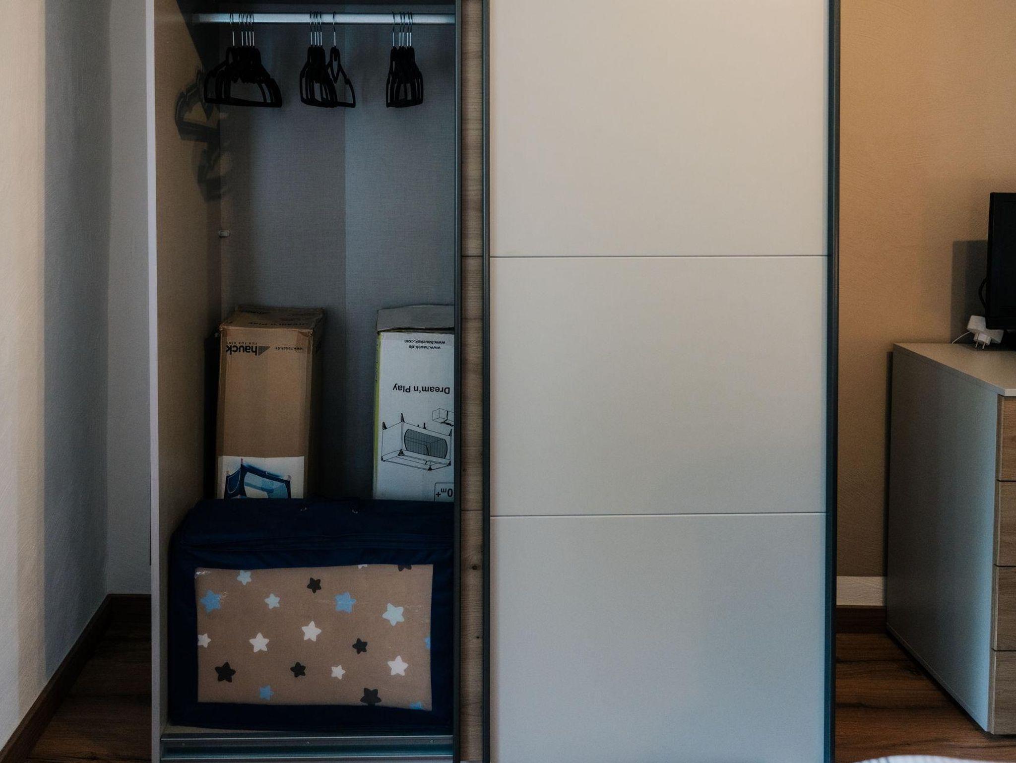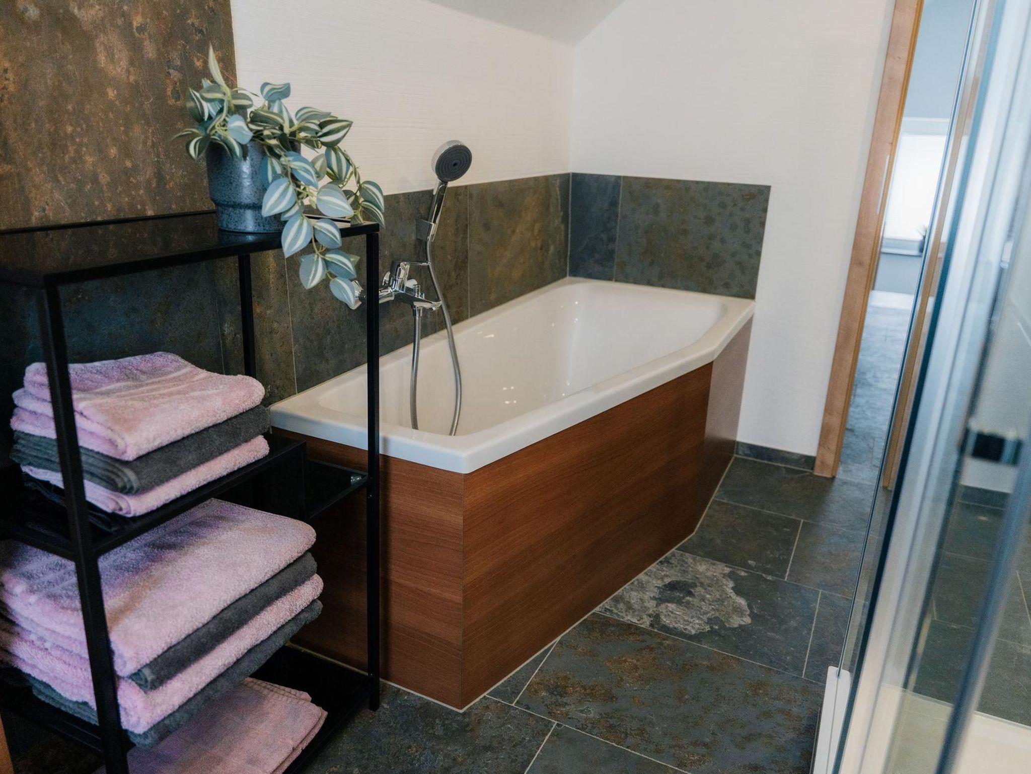 Auf der 1. Etage befinden sich, neben dem Bad, die zwei Schlafzimmer. Diese verfügen über zwei gemütliche, neue Boxspringbetten und bieten einen sehr hohen Schlafkomfort. Bei Bedarf stehen zwei Reisebetten kostenlos für Kinder bis ca. 3 Jahre zur Verfügung. Die Ausstattung der Schlafzimmer beinhaltet weiterhin jeweils einen kleinen Fernseher, eine Kommode und einen geräumigen Kleiderschrank. Das 2. Badezimmer im Obergeschoss bietet zusätzlich eine Badewanne.