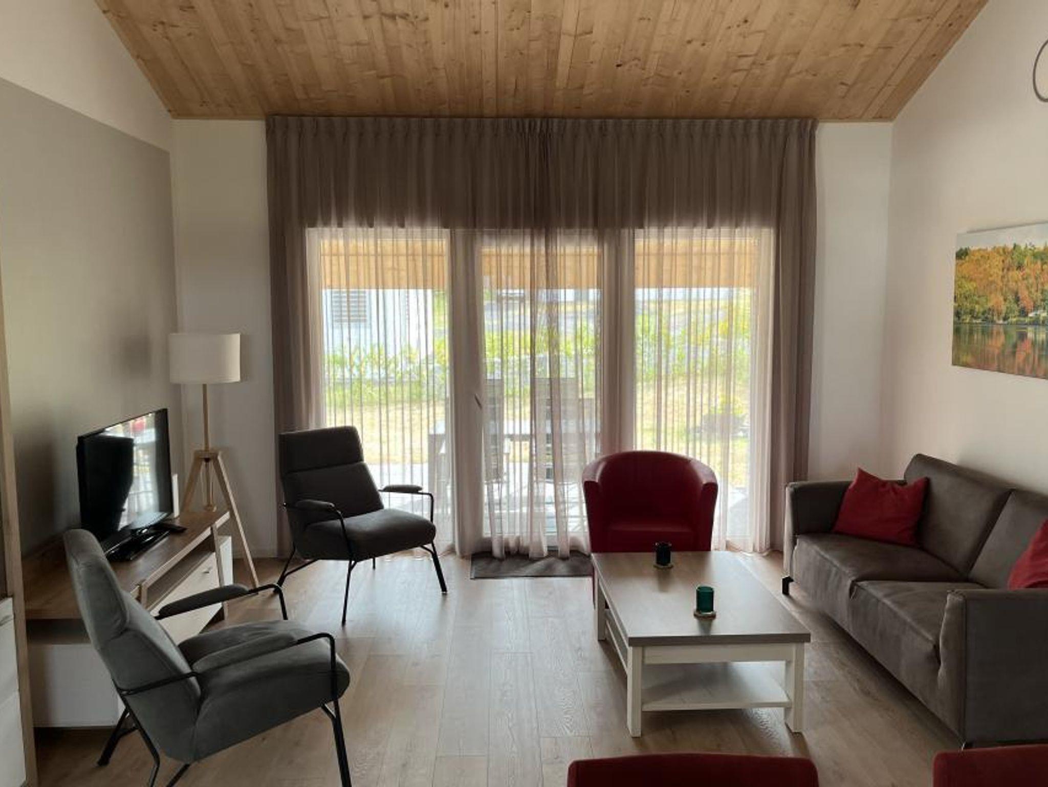 Das Wohnzimmer verfügt über eine Sitzecke mit einem geräumigen 2,5-Sitzer-Sofa, drei Sesseln, Flachbild-TV und einem geräumigen Esstisch für 4 Personen. Für eine perfekte Temperatur im Haus ist das gesamte Haus mit einer Fußbodenheizung ausgestattet. Der Essbereich verfügt über einen geräumigen Esstisch, an dem Sie eine köstliche Mahlzeit genießen können. Die Terrasse ist durch die Terrassentüren mit einem Sitzbereich unter dem Vordach zugänglich.