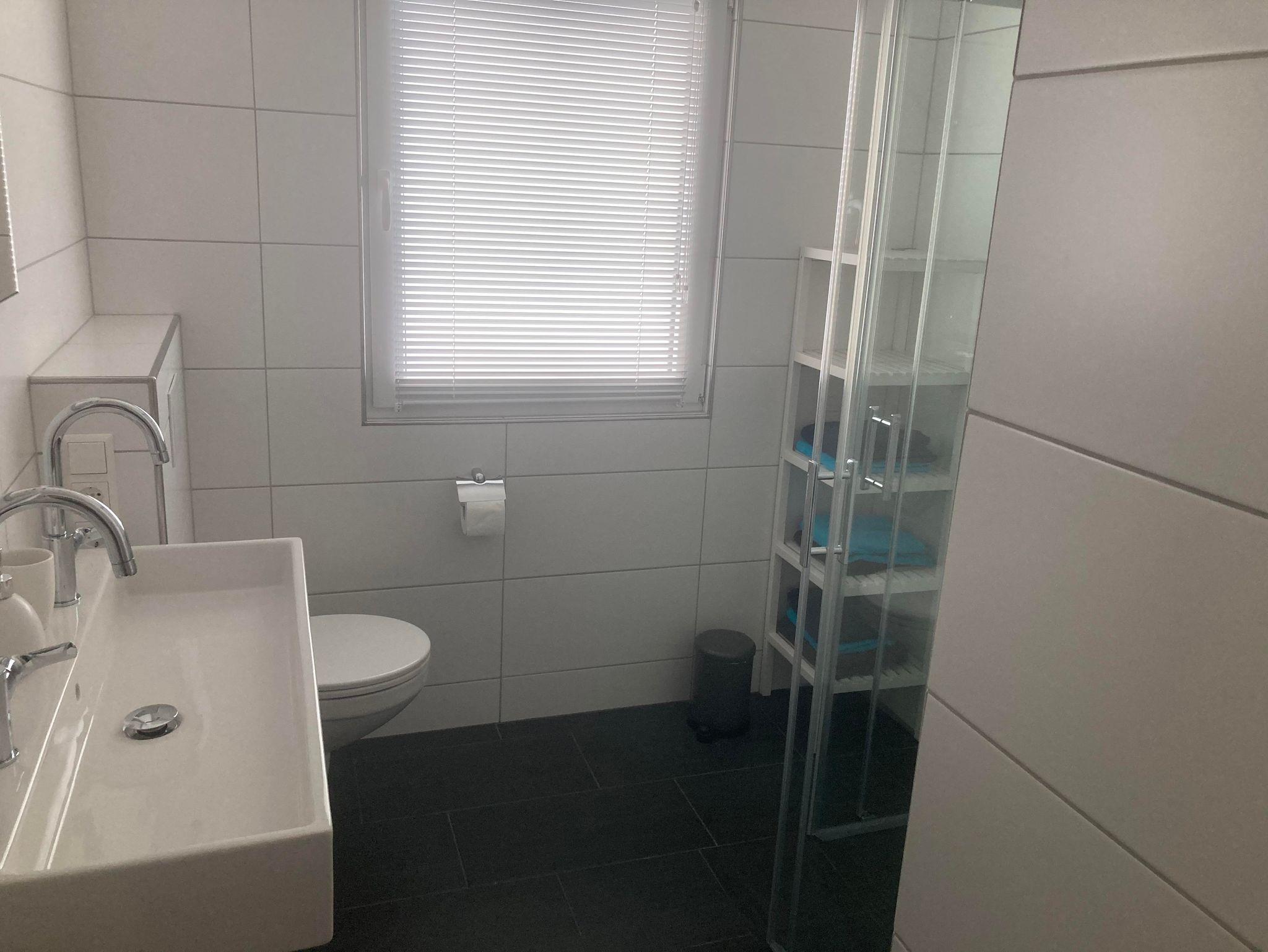 Das Badezimmer verfügt über eine Toilette, ein Doppelwaschbecken und eine geräumige Dusche. Die Schlafzimmer verfügen über ein geräumiges Doppelbett und einen großen Kleiderschrank mit Spiegel.
