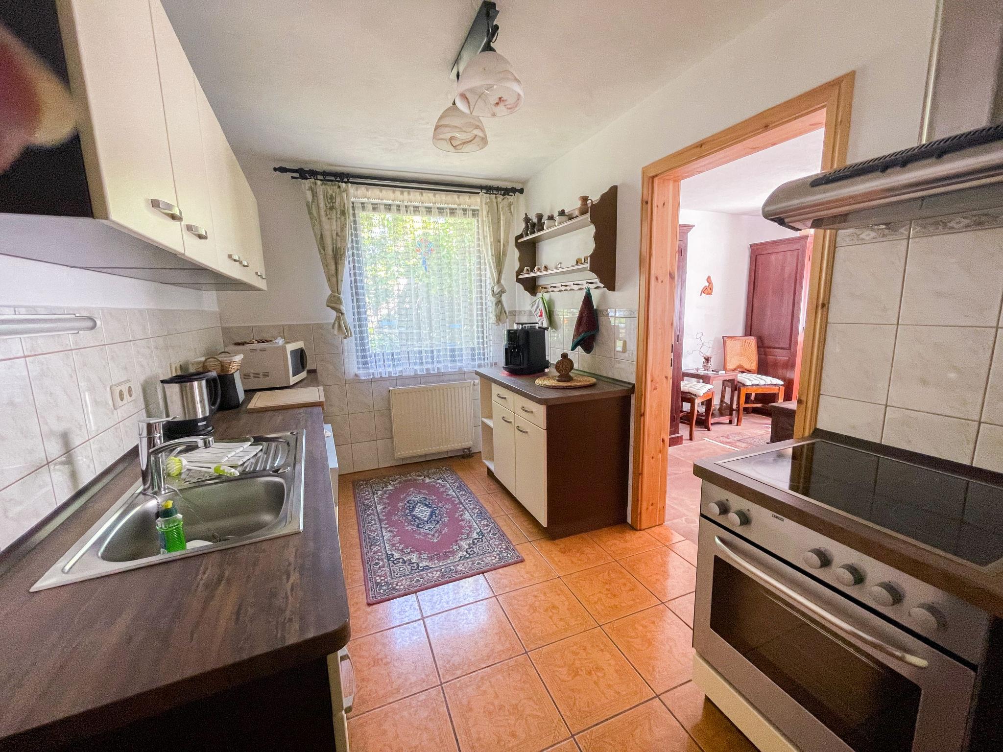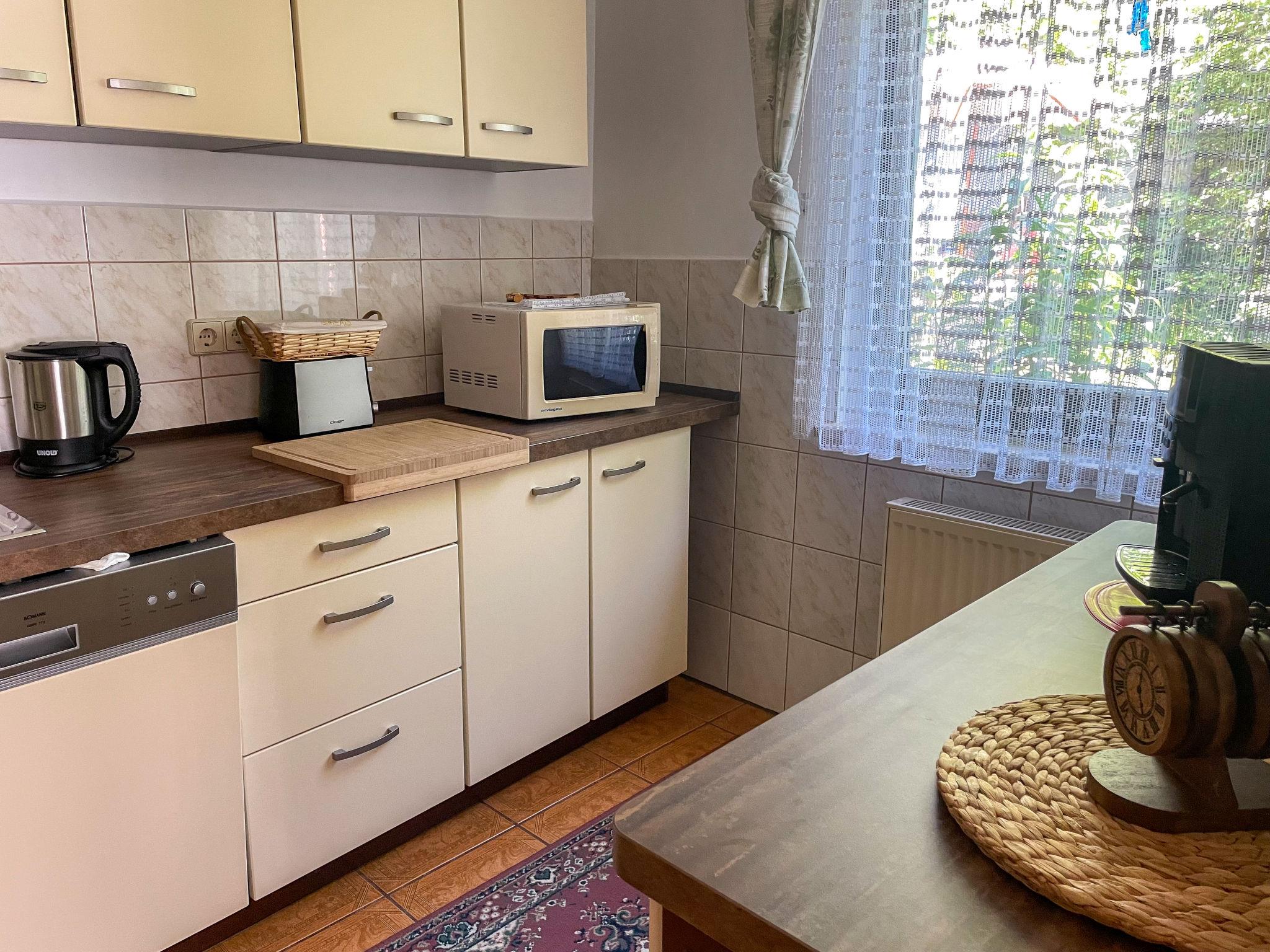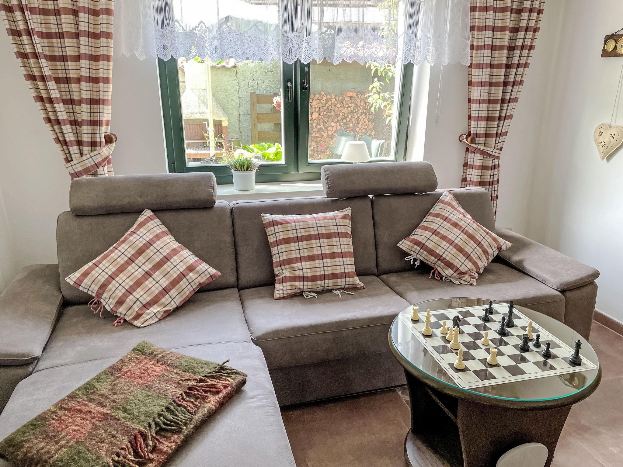 "Backstube", 3-Zimmer-Wohnung 62 m2, im Erdgeschoss. Komfortabel und stilvoll eingerichtet: Wohnzimmer mit 1 Doppeldiwanbett (150 cm, Länge 200 cm), Schwedenofen und Sat-TV (Flachbildschirm), Radio. 1 Zimmer mit 1 Doppelbett. Esszimmer mit Esstisch. Offene Küche (Geschirrspüler, 4 Glaskeramikplatten, Toaster, Wasserkocher, Mikrowelle, elektrische Kaffeemaschine). Dusche, sep. WC. Ölheizung. Terrasse. Terrassenmöbel. Zur Verfügung: Internet (Wireless LAN, gratis). Parkplatz (1 Auto). Bitte beachten: Nichtraucher-Unterkunft. Rauchmelder, Feuerlöscher.