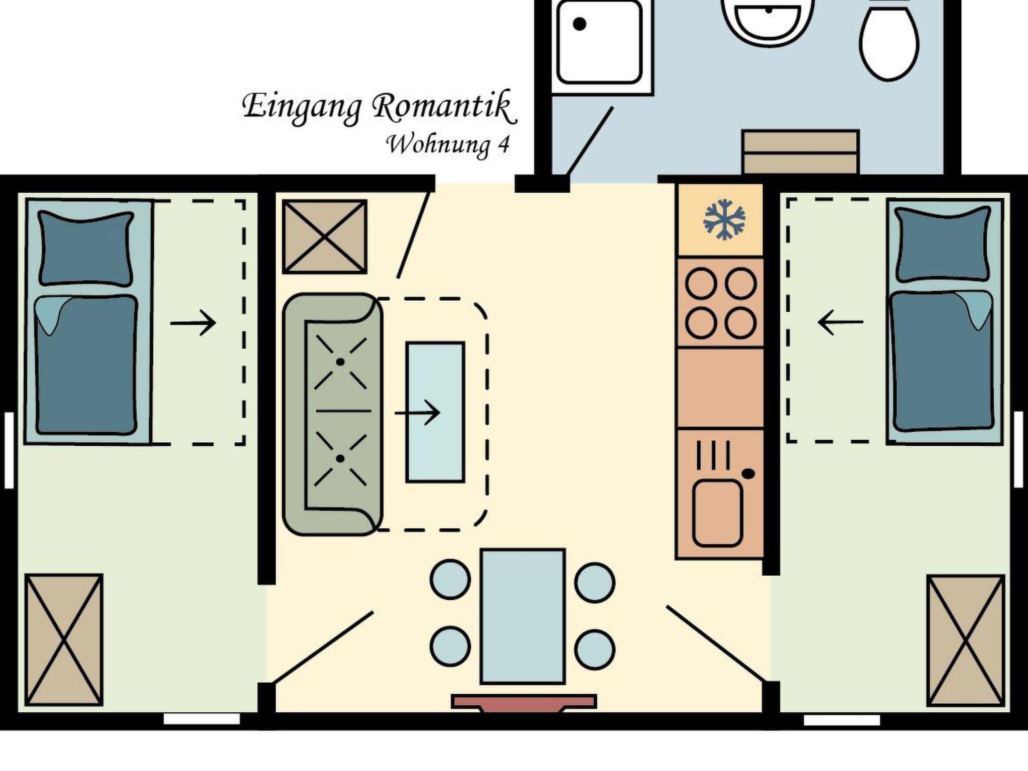 Im Inneren erwartet Sie eine praktisch eingerichtete Wohnung mit allem Nötigen für einen angenehmen Aufenthalt. Die beiden kleinen Schlafzimmer sind jeweils mit einem Tandembett ausgestattet, das eine zusätzliche Liegefläche in Standardgröße bietet. Für zusätzlichen Schlafkomfort sorgt das gemütliche Schlafsofa im Wohnzimmer. Klein, aber fein, bietet diese Wohnung eine effiziente Raumaufteilung und ist mit wichtigen Annehmlichkeiten wie einer Kaffeemaschine und einem Wasserkocher ausgestattet, die Ihre Selbstversorgung unkompliziert gestalten.