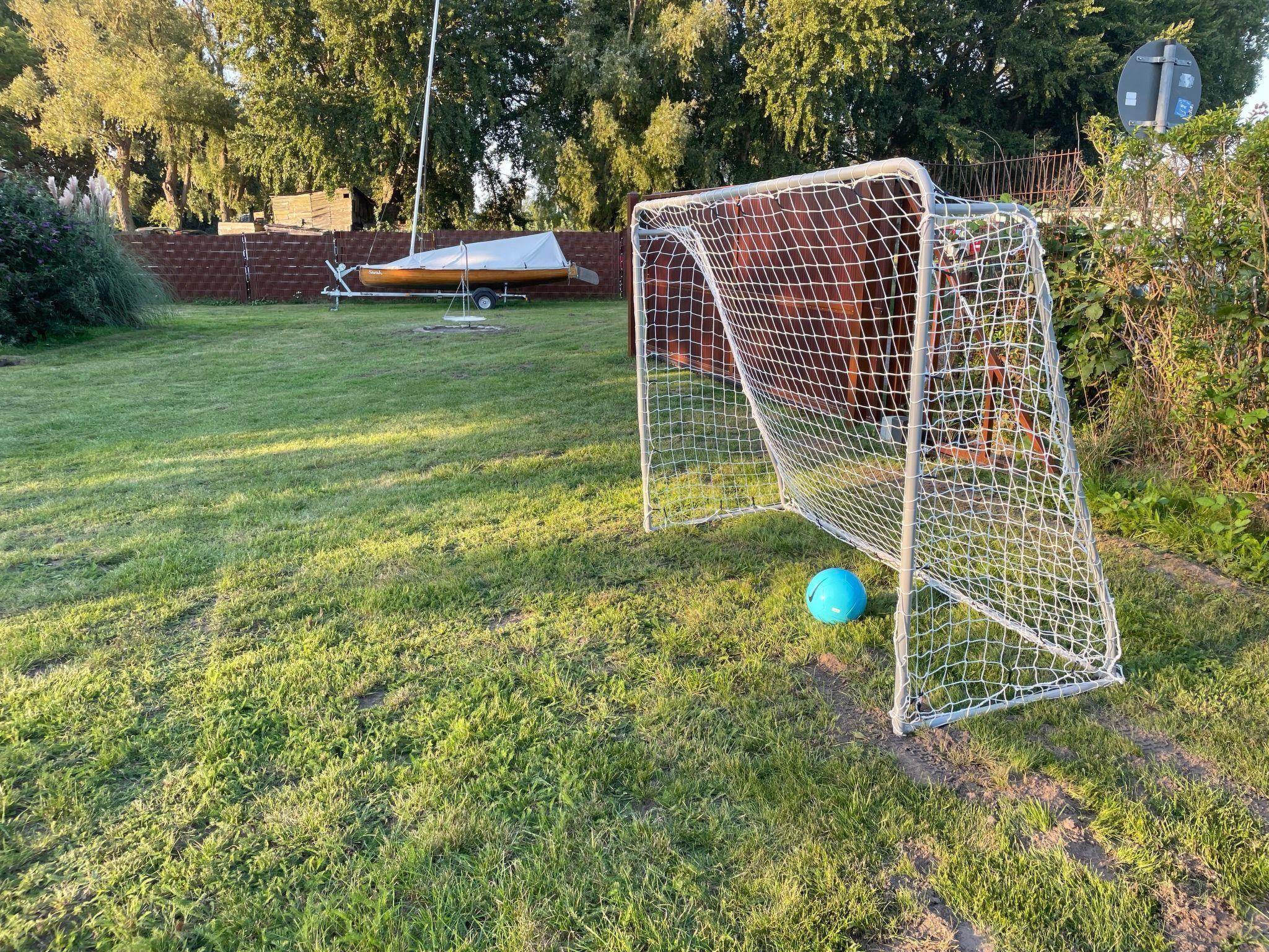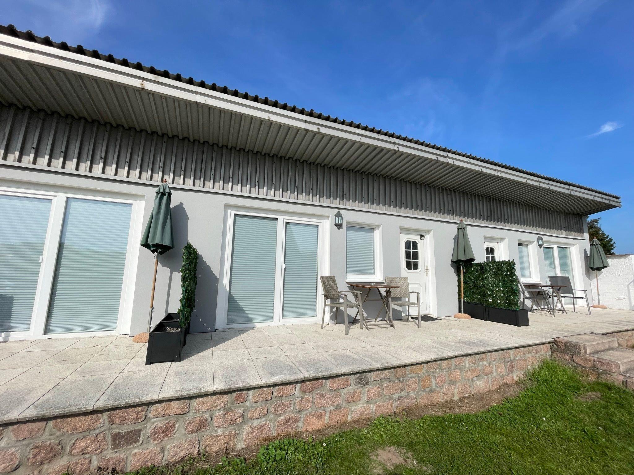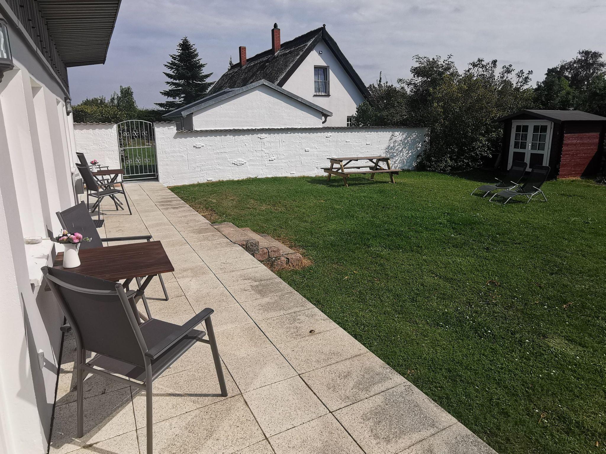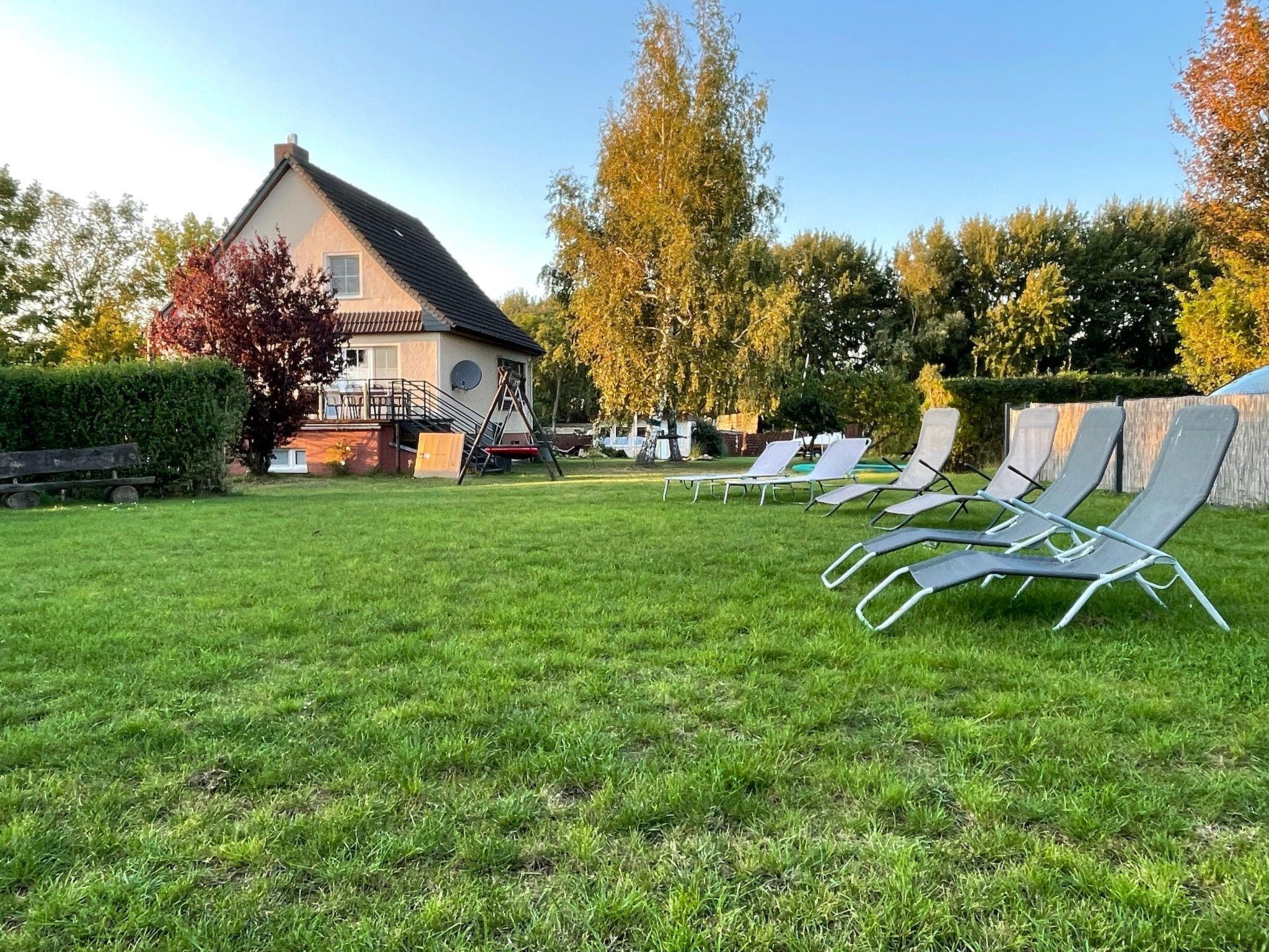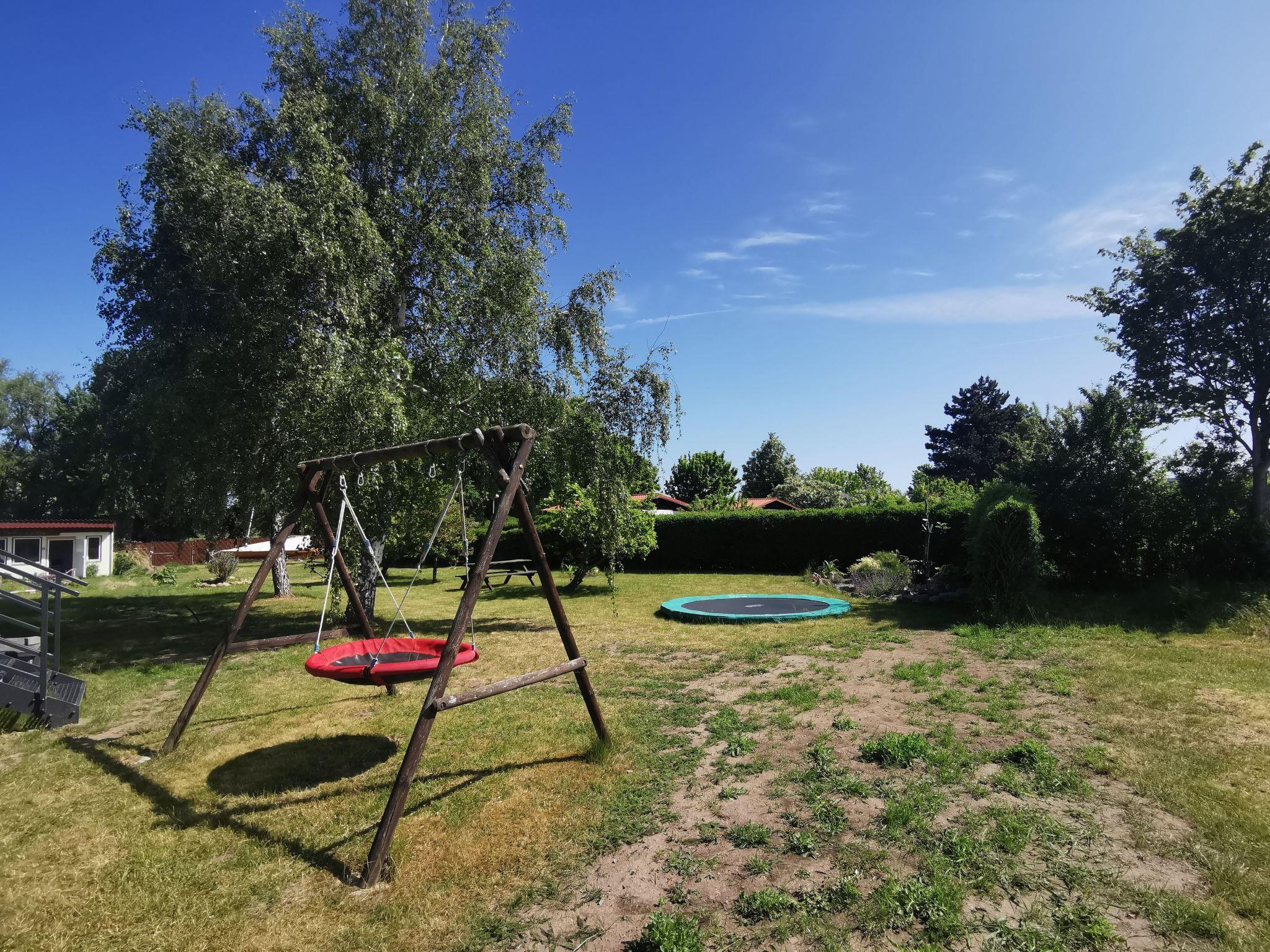 Vor dem Boddenferienhaus befinden sich die dazugehörigen Parkplätze. Auf der Terrasse vor den Wohnungen sind Sitzgelegenheiten. Eine Picknickbank und Sonnenliegen können ebenfalls genutzt werden. Ein Grill steht den Gästen ebenfalls zu Verfügung. Ebenso können alle Freizeiteinrichtungen am Nachbargrundstück mit genutzt werden - Volleyball, Fußball, Tischtennis, Schaukel, Trampolin und Sandkasten laden zum Freizeitspass ein.
