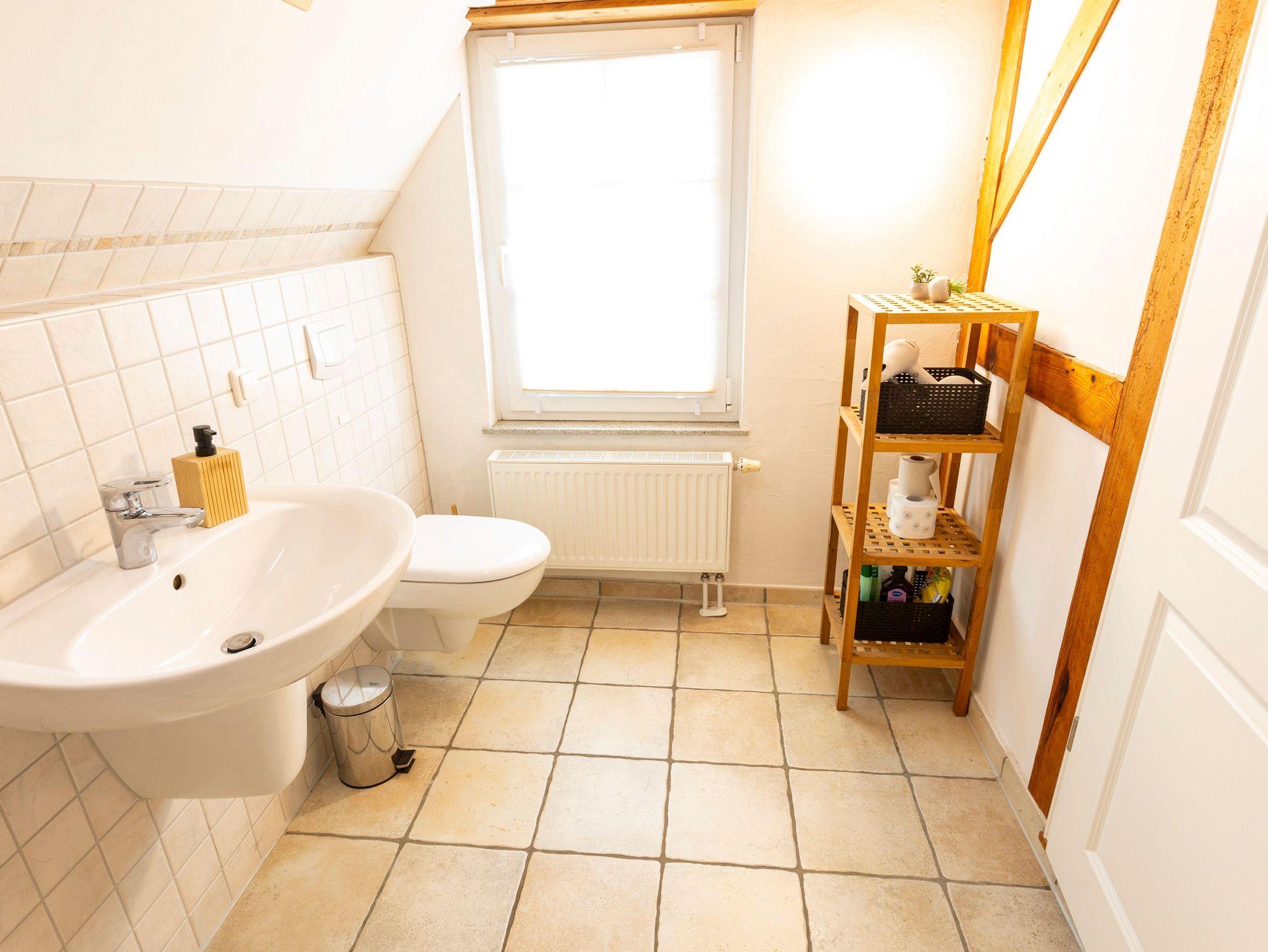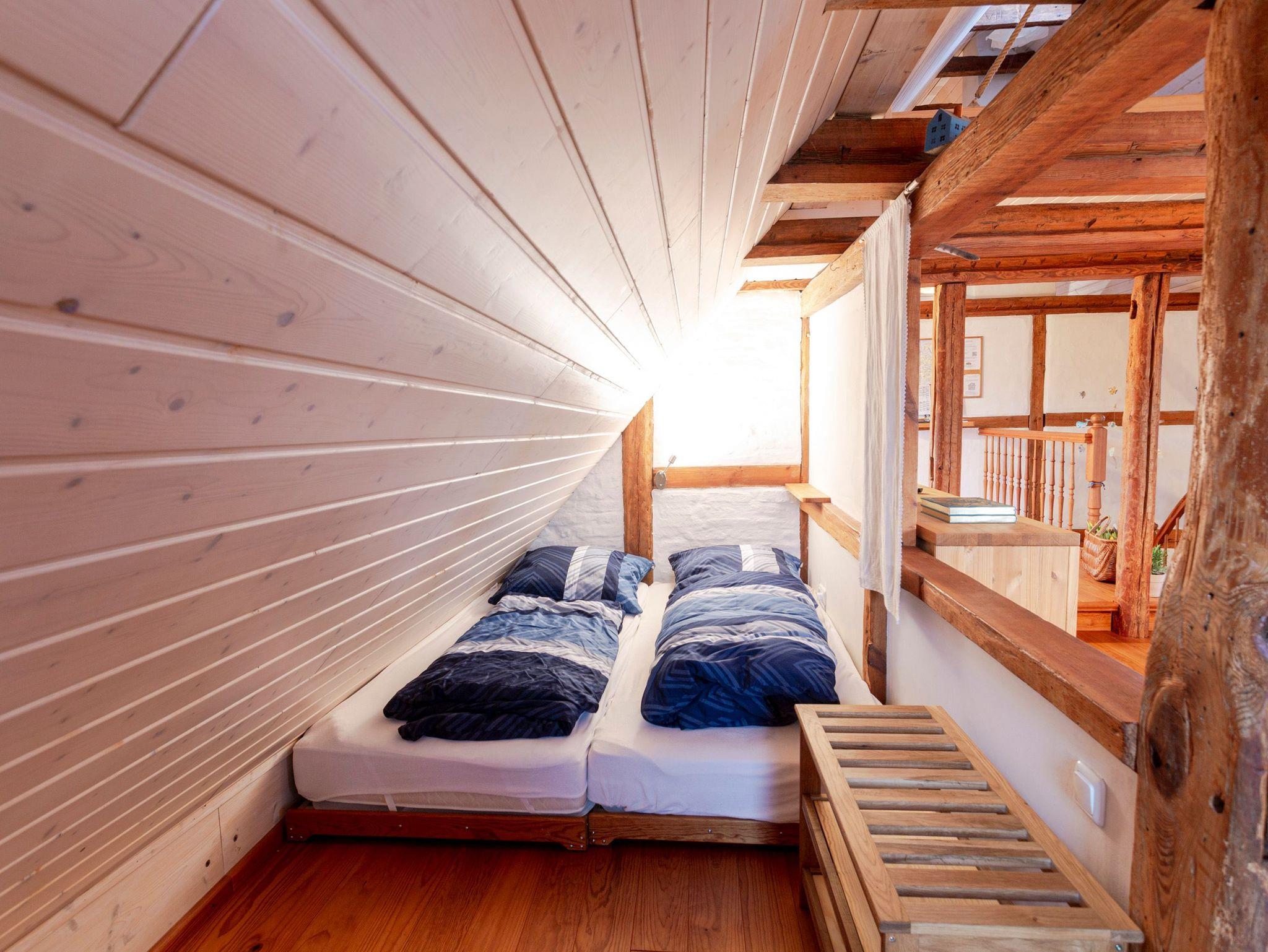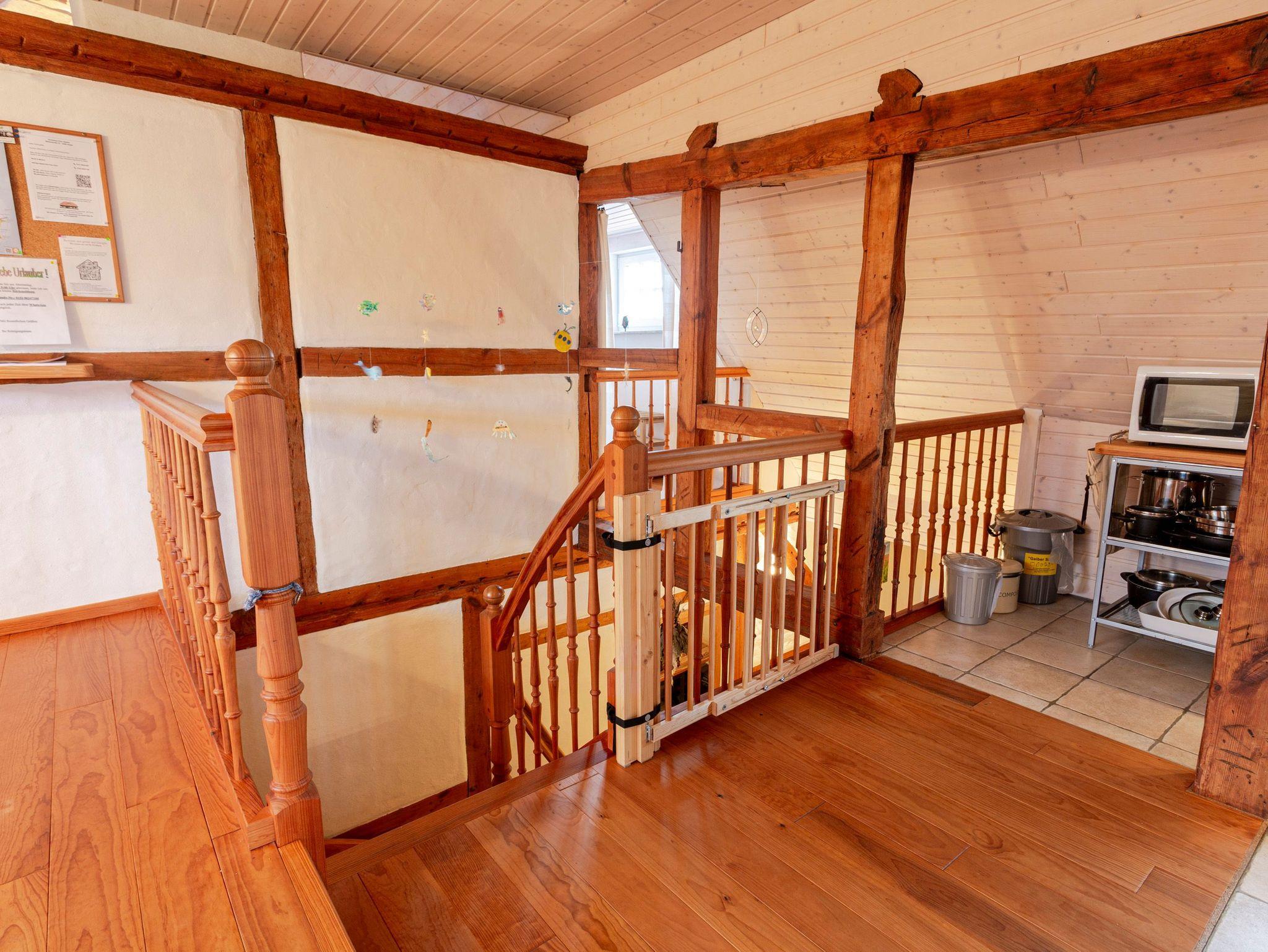 Die Ferienwohnung 2 im Haus Klein Kapelle in Gingst erstreckt sich über zwei Etagen und ist für 6 Personen und ein Baby geeignet. Der Zugang zur Ferienwohnung befindet sich auf dem Hof im Erdgeschoss. Im unteren Bereich ist das erste Bad mit ebenerdiger Dusche, WC und Waschmaschine. Über eine Treppe erreicht man den offenen Wohn-Schlaf-Essbereich. Auf der linke Seite liegen die offene Küche mit Geschirrspüler, Herd, Ofen, Kühlschrank, Toaster, Wasserkocher, Mikrowelle, Kaffemaschine, Milchaufschäumer, Mixer, Pürierstab und Geschirr für den täglichen Bedarf, sowie der Essbereich mit Esstisch und 1 offene Schlafnische mit 2 Matratzen (90x200) auf einem Lattenrost. Das zweite abschließbare Bad mit Badewanne und WC ist vom Essbereich aus erreichbar. Von der Treppe rechts gelegen, befindet sich der große Wohnbereich mit Sofa und TV, sowie 2 Schlafnische mit jeweils 2 Matratzen (90x200) auf einem Lattenrost.