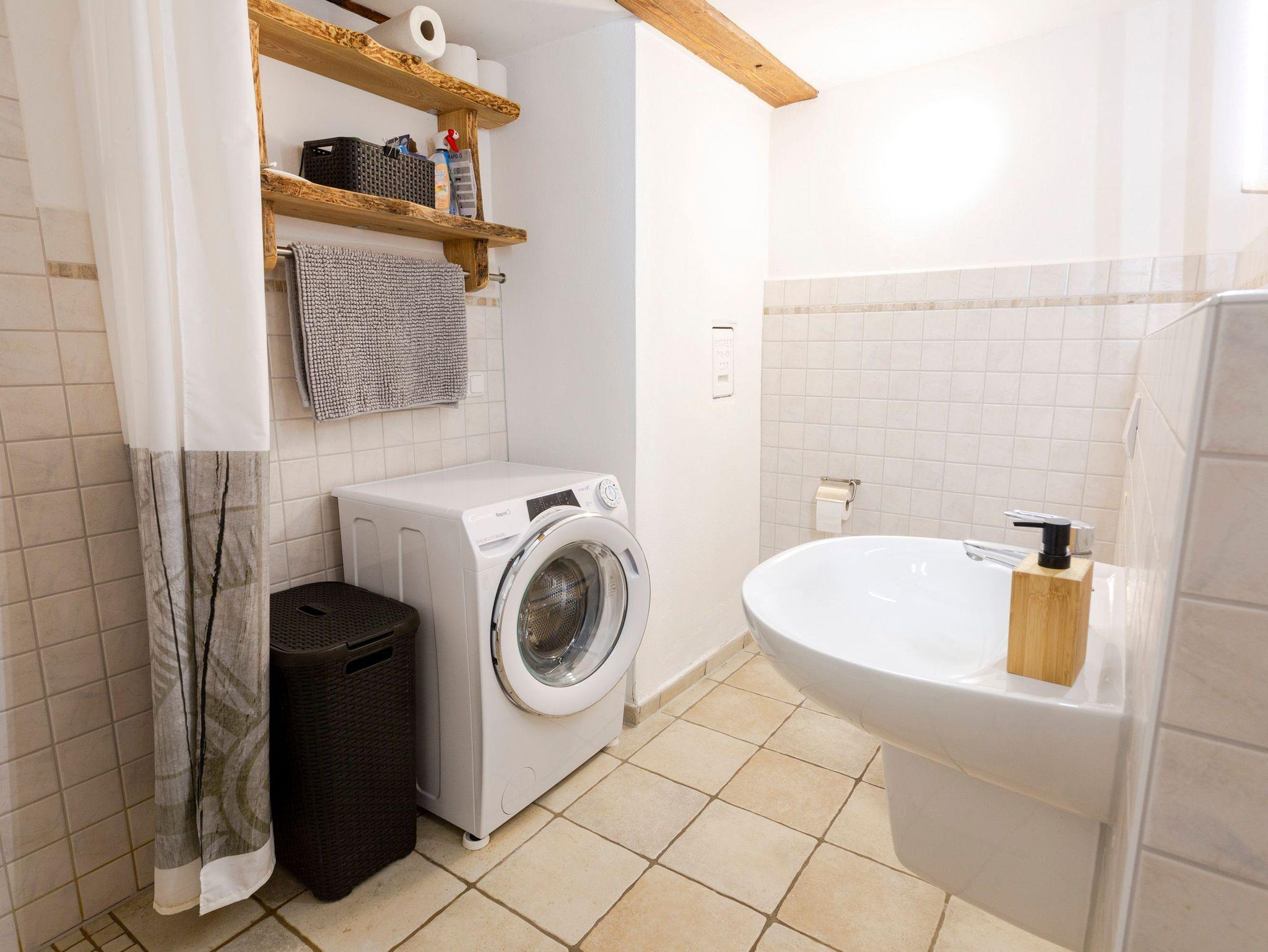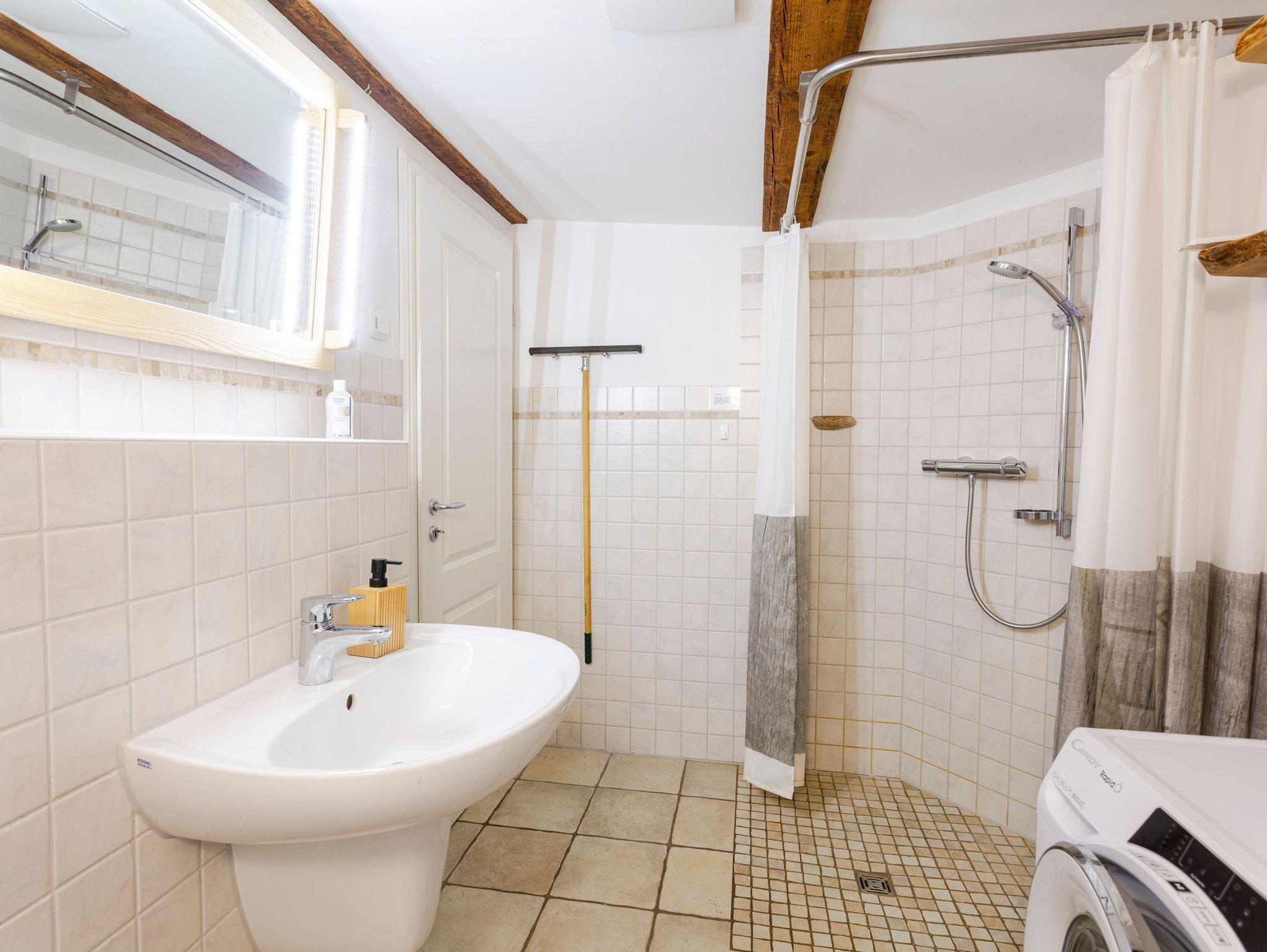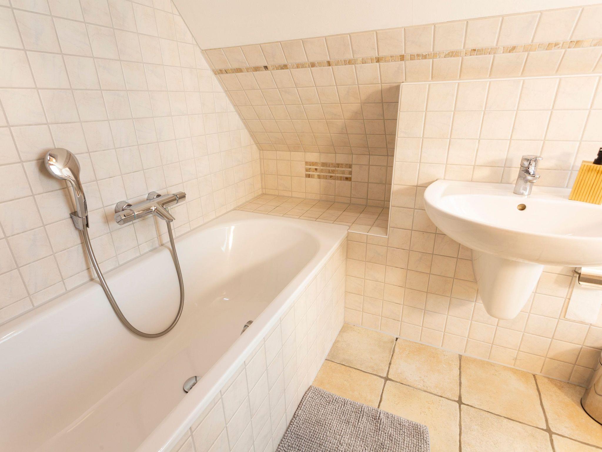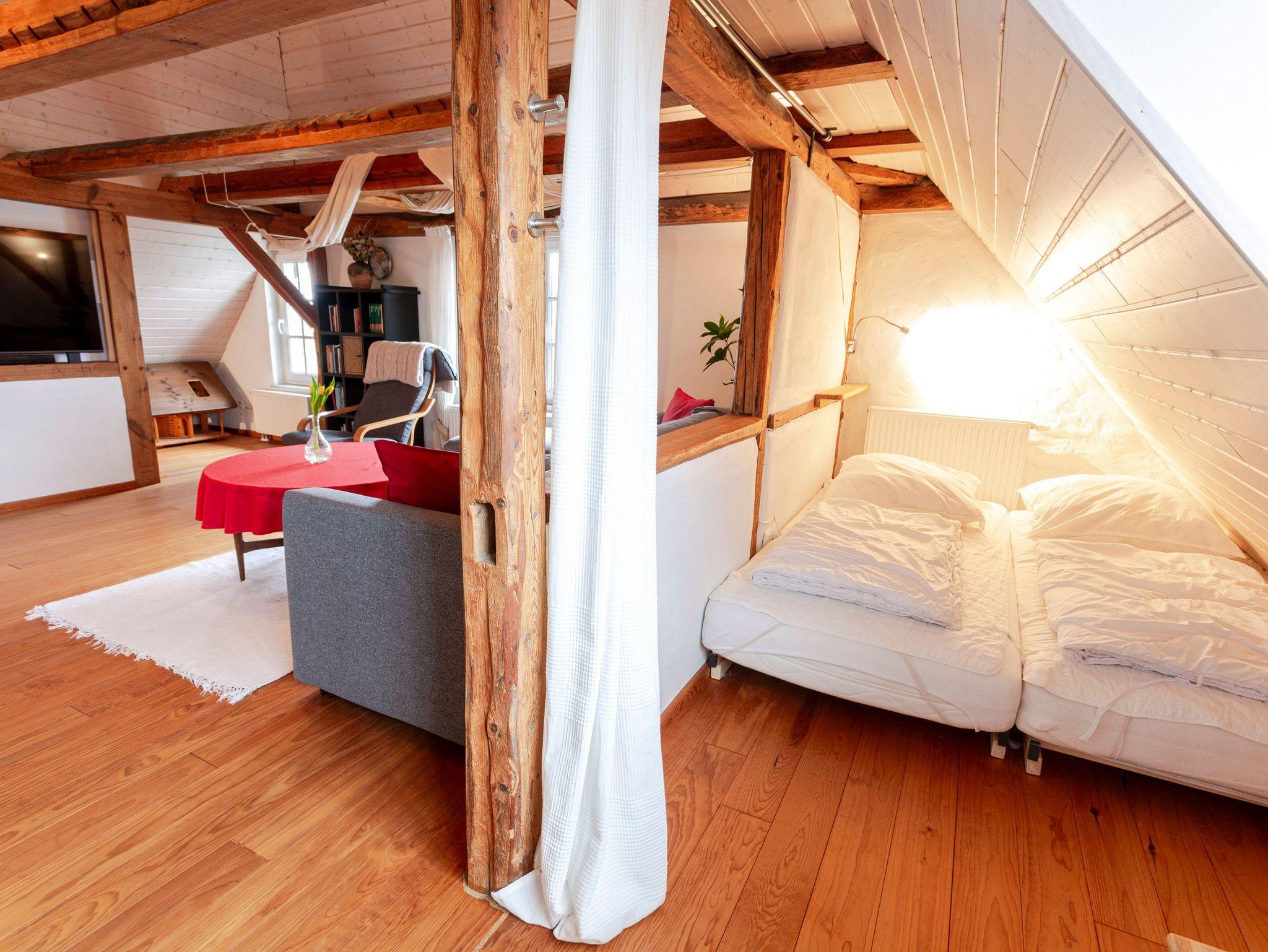 Die Ferienwohnung 2 im Haus Klein Kapelle in Gingst erstreckt sich über zwei Etagen und ist für 6 Personen und ein Baby geeignet. Der Zugang zur Ferienwohnung befindet sich auf dem Hof im Erdgeschoss. Im unteren Bereich ist das erste Bad mit ebenerdiger Dusche, WC und Waschmaschine. Über eine Treppe erreicht man den offenen Wohn-Schlaf-Essbereich. Auf der linke Seite liegen die offene Küche mit Geschirrspüler, Herd, Ofen, Kühlschrank, Toaster, Wasserkocher, Mikrowelle, Kaffemaschine, Milchaufschäumer, Mixer, Pürierstab und Geschirr für den täglichen Bedarf, sowie der Essbereich mit Esstisch und 1 offene Schlafnische mit 2 Matratzen (90x200) auf einem Lattenrost. Das zweite abschließbare Bad mit Badewanne und WC ist vom Essbereich aus erreichbar. Von der Treppe rechts gelegen, befindet sich der große Wohnbereich mit Sofa und TV, sowie 2 Schlafnische mit jeweils 2 Matratzen (90x200) auf einem Lattenrost.
