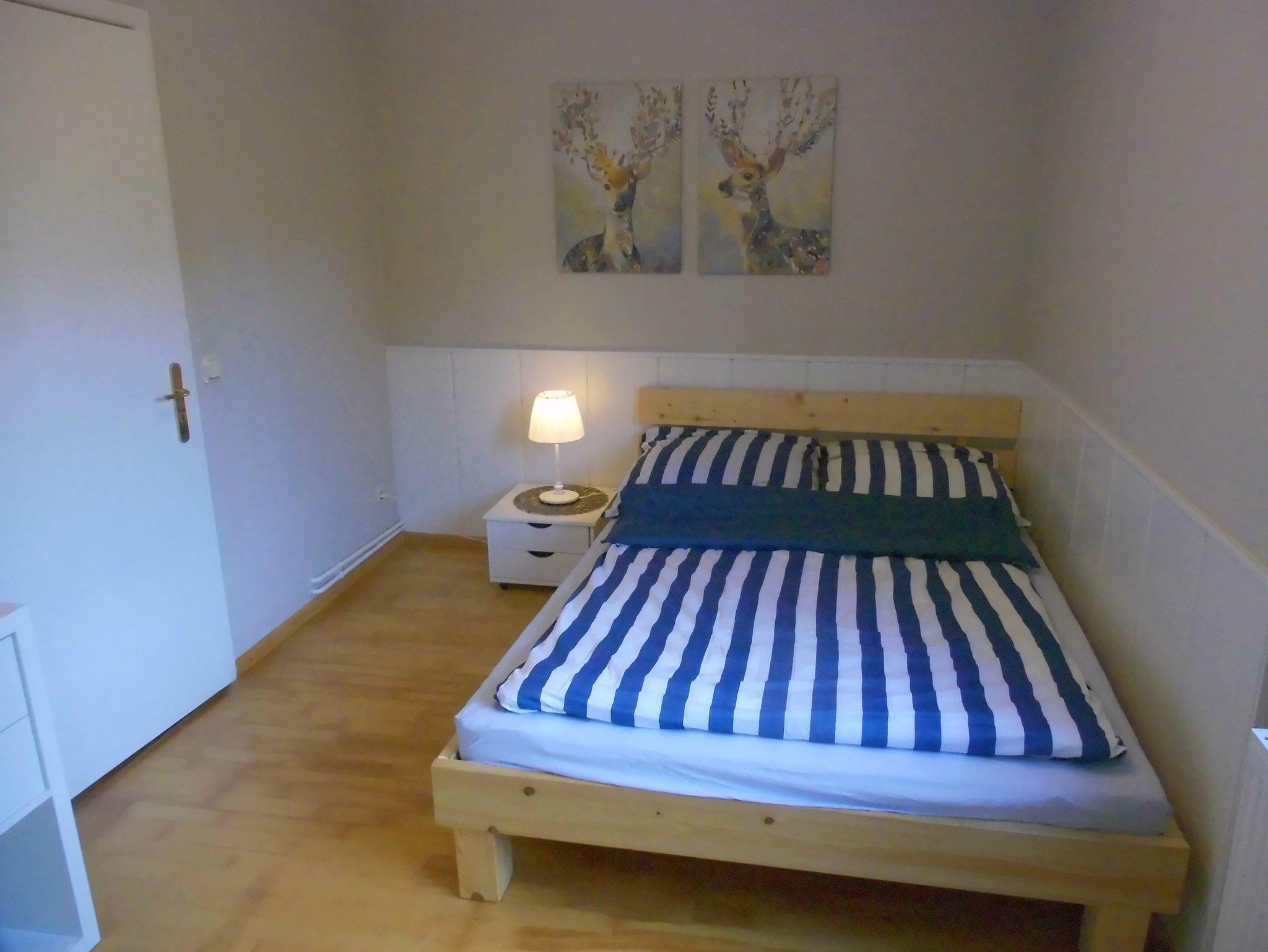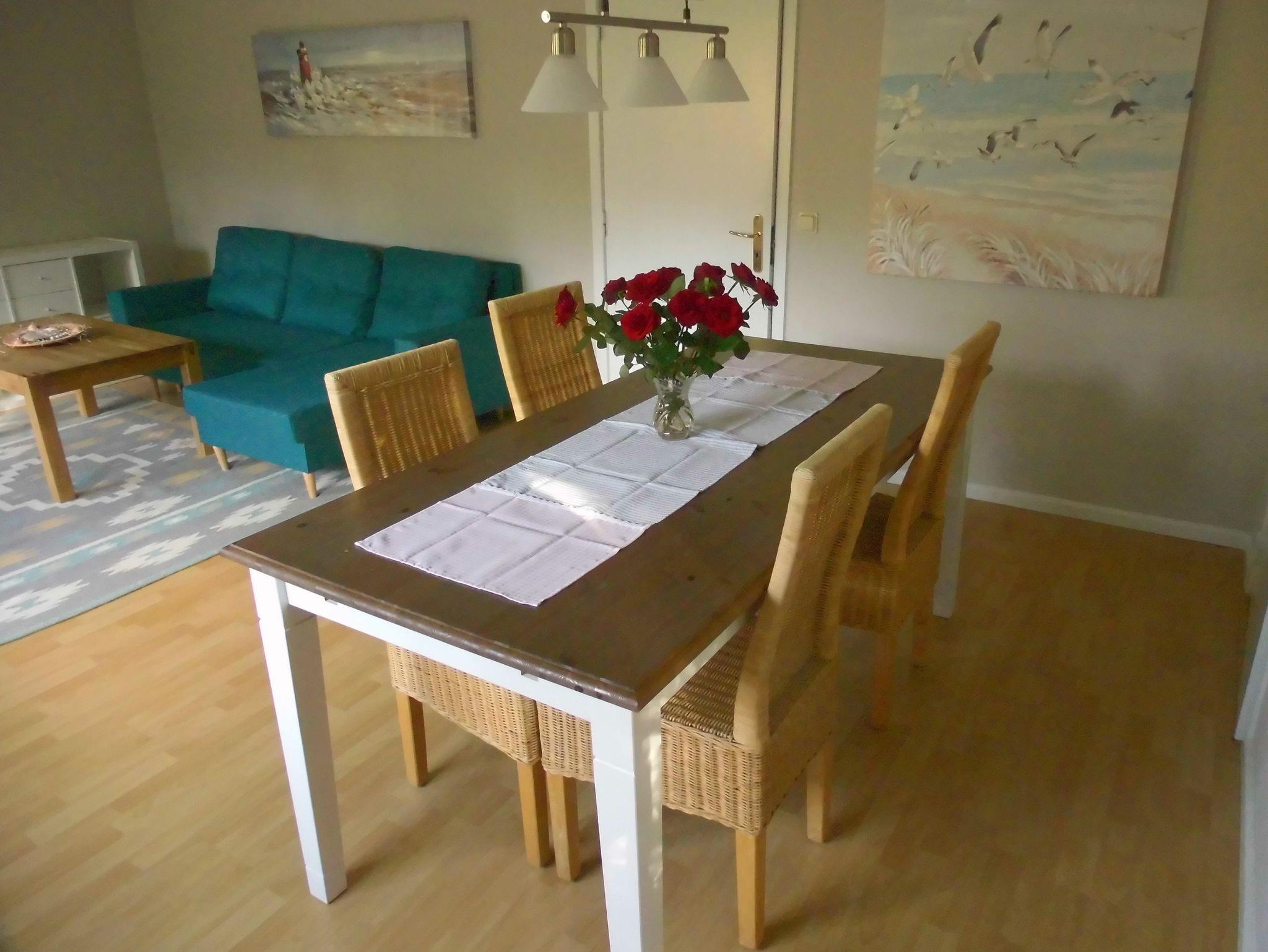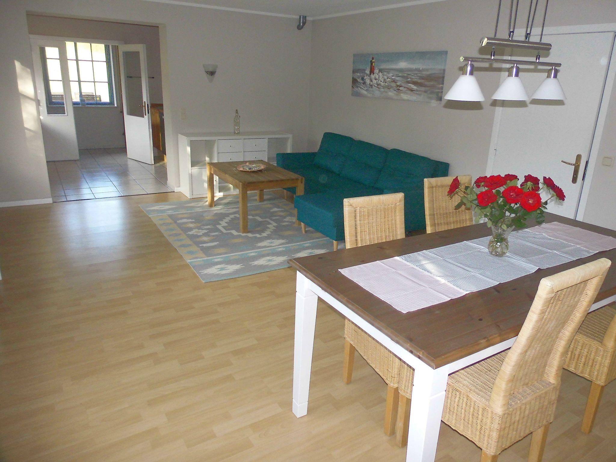 Details: Größe 60 qm plus möblierter teilüberdachter Terasse, vollausgestattete Küche , Sat-Smart-TV, WLAN, ruhige Lage mit Blick in den Garten und auf die ostseitige Wiese. Schlafzimmer mit einem Doppelbett, Wohnzimmer mit einem klappbaren Doppel-Schlafsofa. Eine Waschmaschine ist vorhanden.