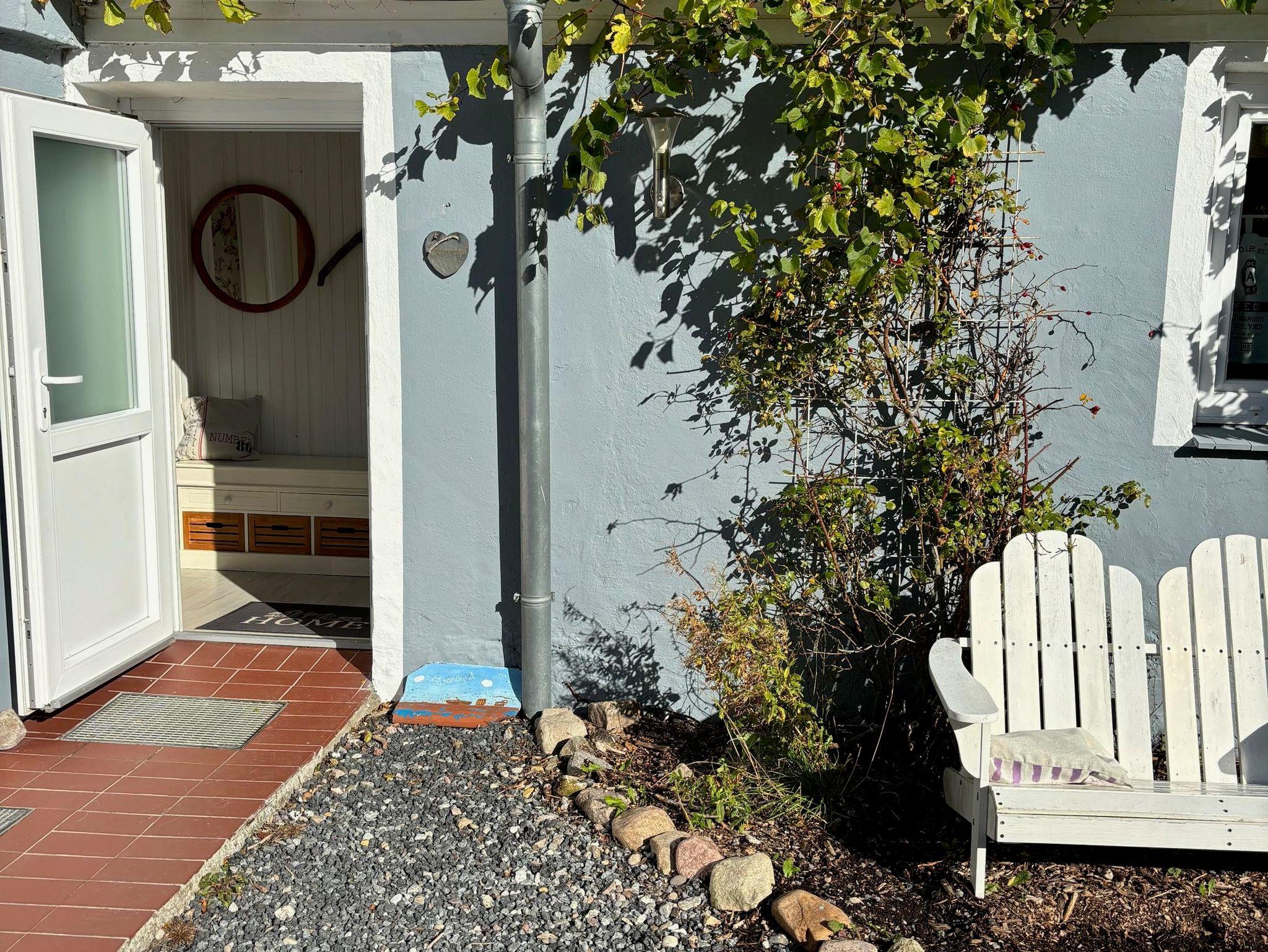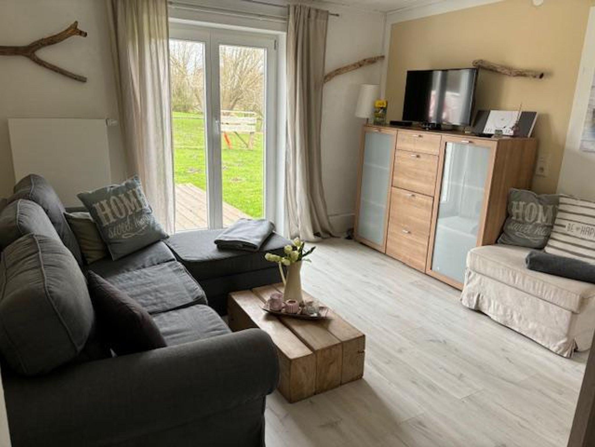 Gemütliche Ferienwohnung am Strandhof Holnis mit Terrasse und eigenem Strandkorb, ideal für Familien und Naturfreunde.